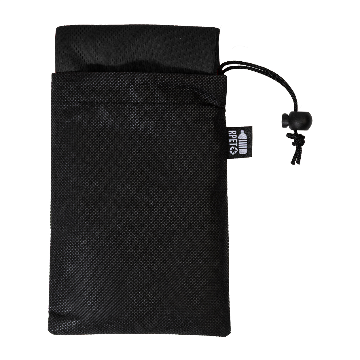 Sporthandtuch aus RPET-Mikrofaser in RPET-Vliestasche. Material: RPET-Polyester (140 g/m²). Mit Label RPET.