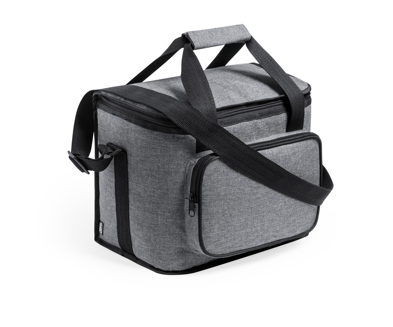 RPET Kühltasche mit PEVA-Polsterung, Reißverschlussfächern, Henkel mit Klettverschluss und verstellbarem Schultergurt. Material: 600D RPET Polyester (mit RPET-Label).