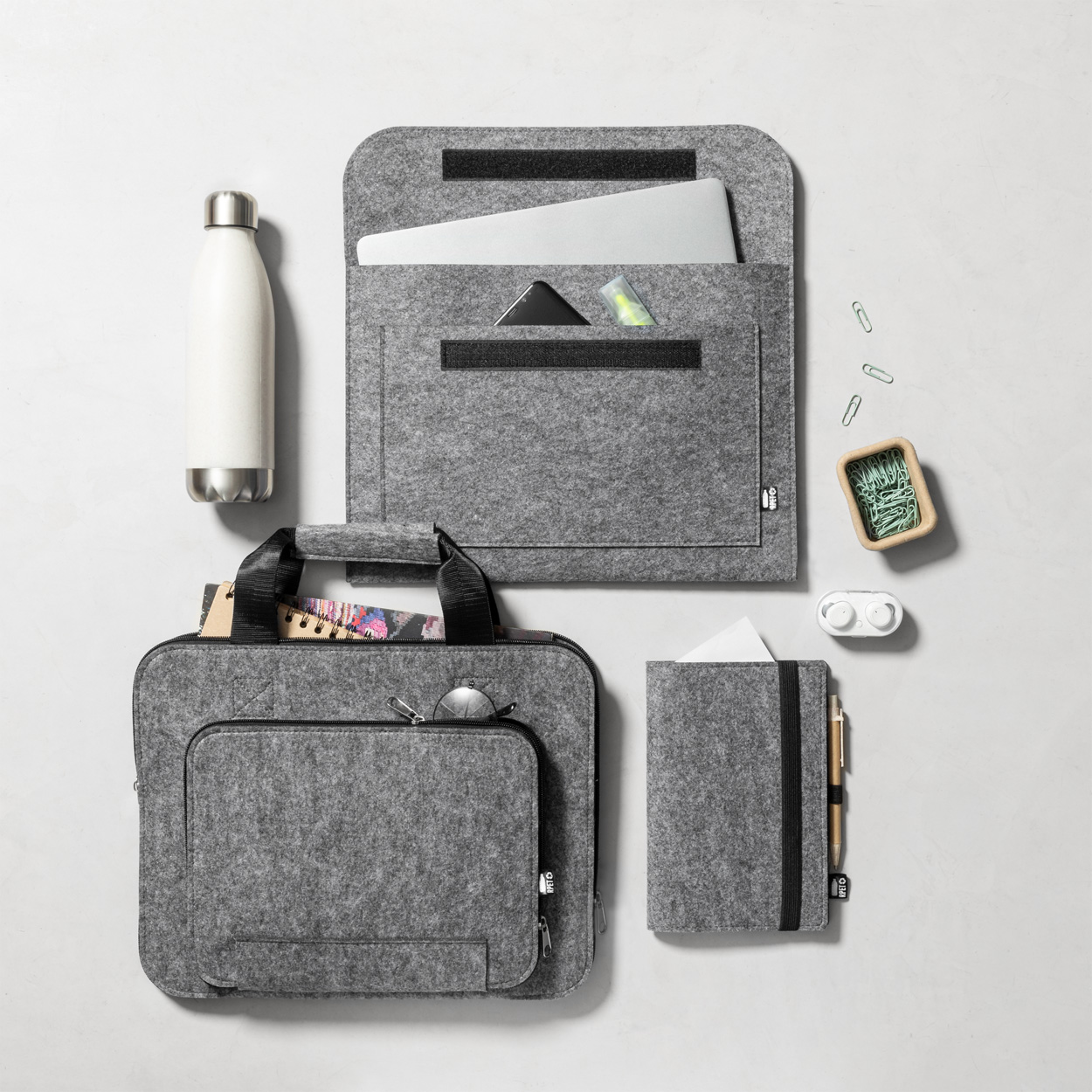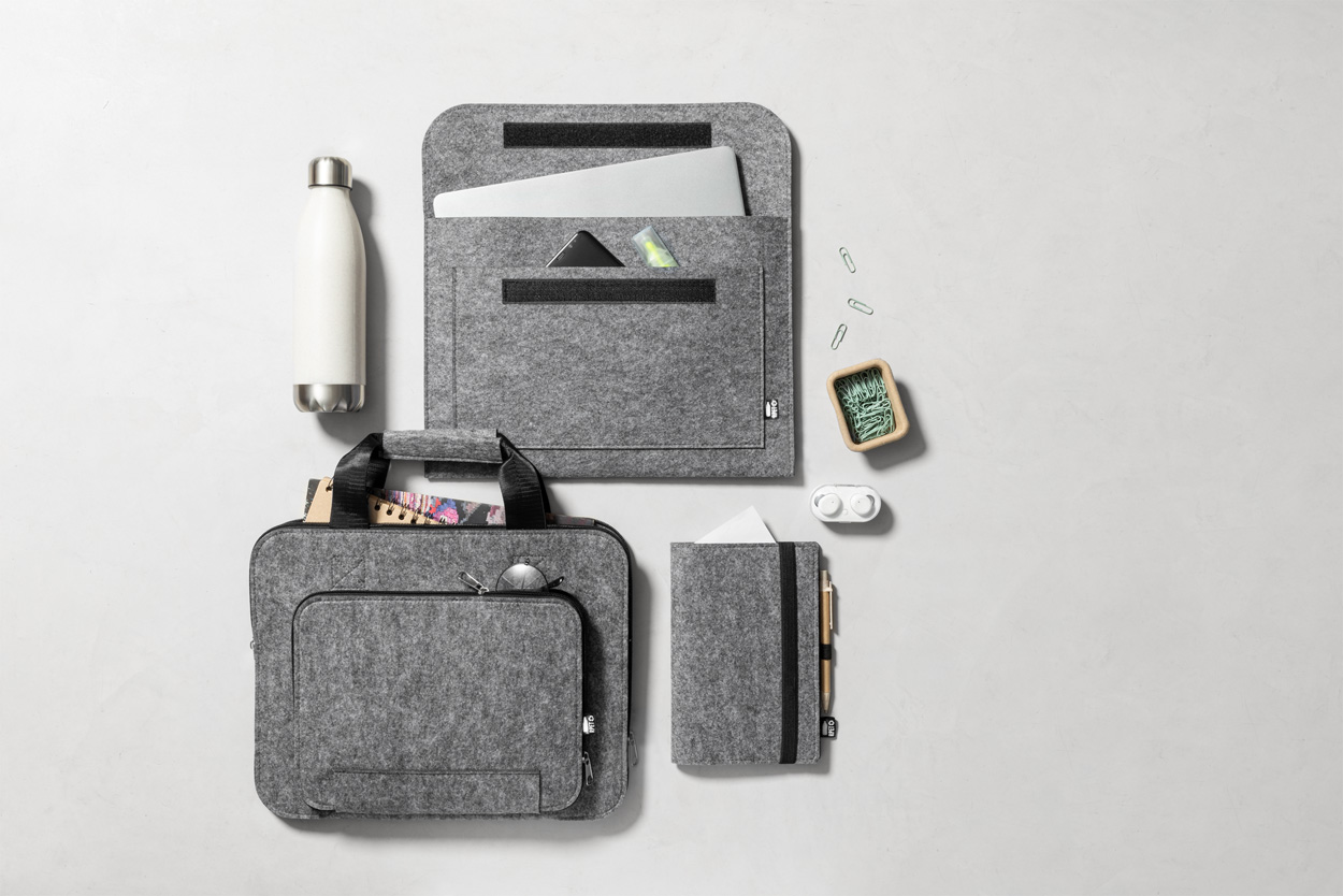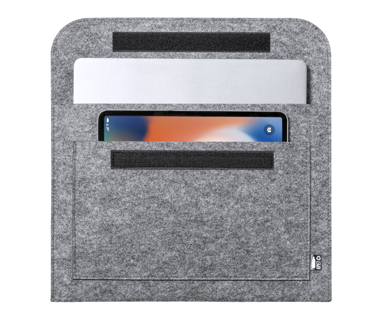 Laptoptasche aus RPET Filz mit Klettverschuss, Seitenfach und RPET-Label.
