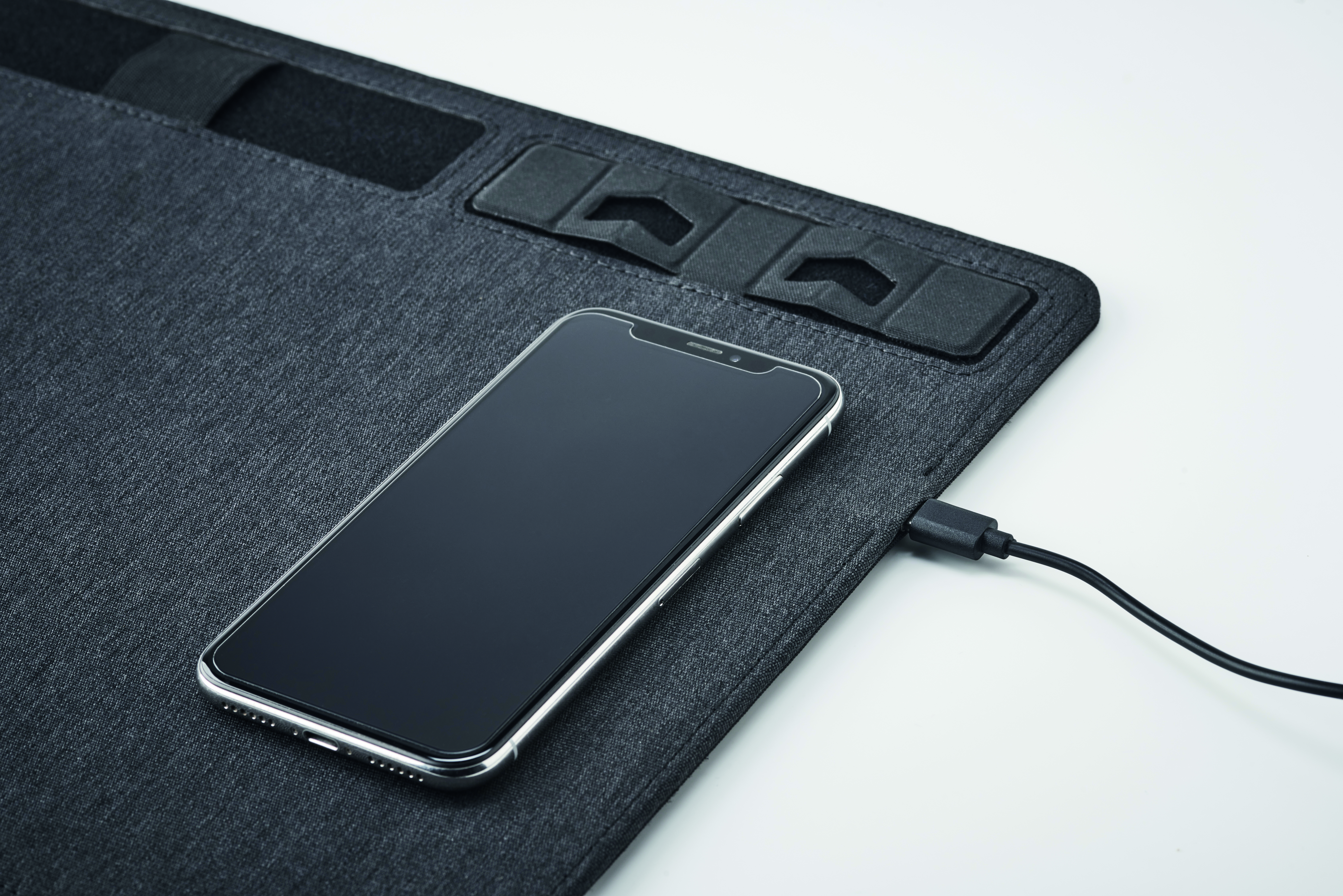 Multifunktionales 2tone Mousepad aus 300D-Polyester-RPET mit induktiver Ladestation und Smartphone-Halter. Ausgang: DC 9V/1.6A(15W) für schnelles Aufladen.