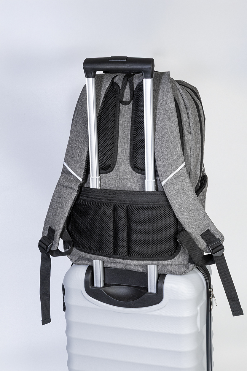 Rucksack aus RPET mit Reißverschluss-Hauptfächern, 2 Reißverschluss-Vordertaschen, Reißverschluss-Seitentaschen und gepolstertem Laptopfach (15"). Mit geposlterten Rücken und Schultergurten, Anti-Diebstahl-Fach und Trolley-Gurt. Material: 300D RPET Polyester. Mit Label RPET.