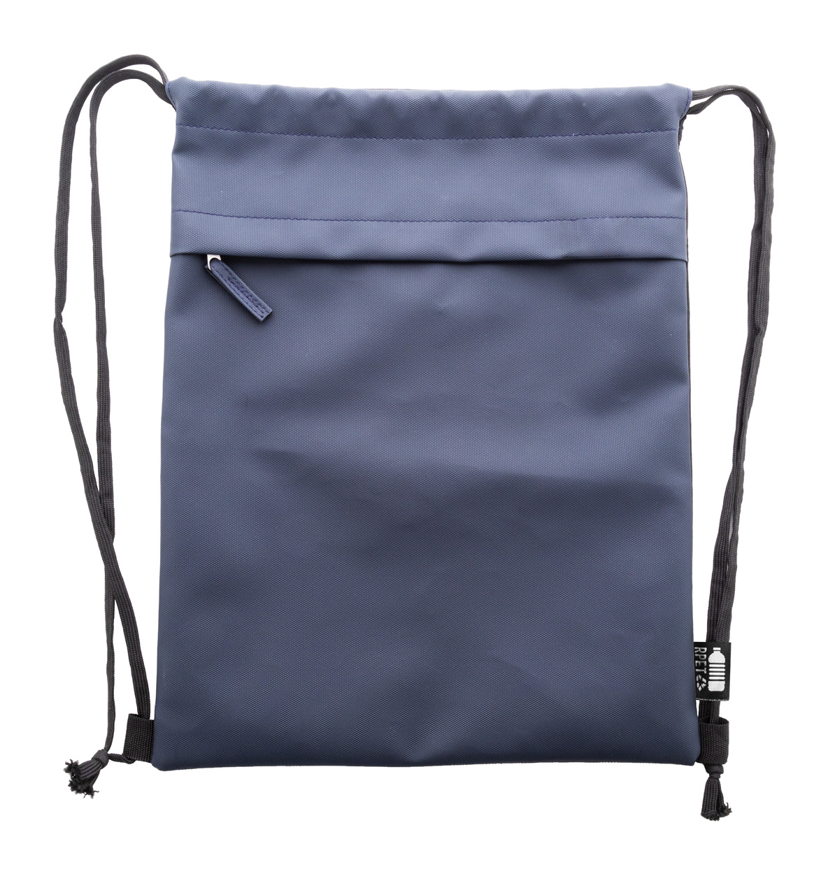 RPET-Kordelzugtasche mit PU-beschichteter Vorderseite und Vordertasche mit Reißverschluss. Material: PU-beschichtetes 600D RPET-Polyester. Mit RPET-Label.