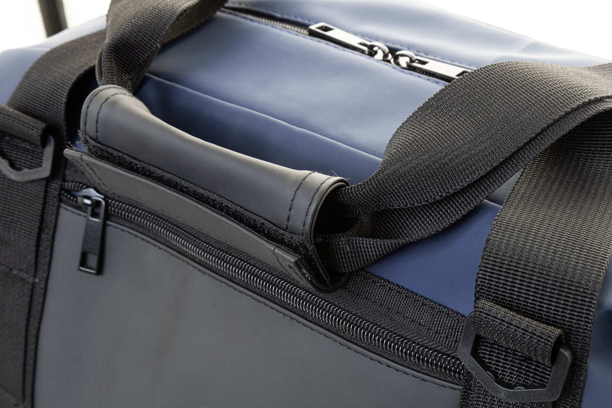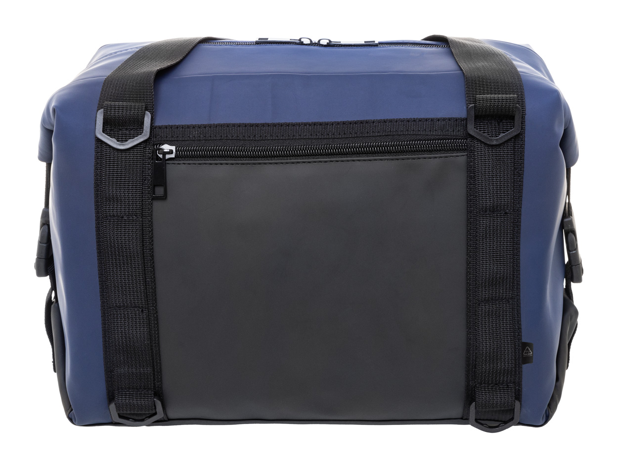 Faltbare Kühltasche mit Reißverschluss aus weichem, recyceltem PU-Leder mit Aluminiumpolsterung und Vordertasche mit Reißverschluss. Mit seitlichen Schnallen, Griffen und verstellbarem Schultergurt. Die Tasche kann zur einfachen Aufbewahrung flach zusammengefaltet oder während des Gebrauchs mit den seitlichen Schnallen in Form gehalten werden.