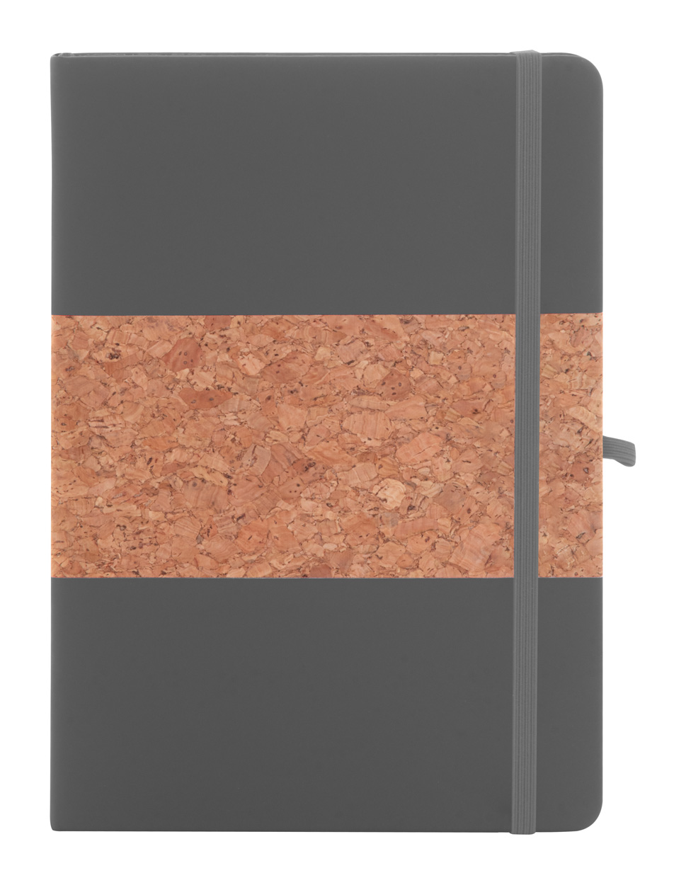 A5 Notizbuch mit Umschlag aus natürlichem Kork und Kunstleder mit farblich abgestimmten Lesezeichen, Gummiband und Stifteschlaufe sowie 80 linierten Seiten aus Recyclingpapier.