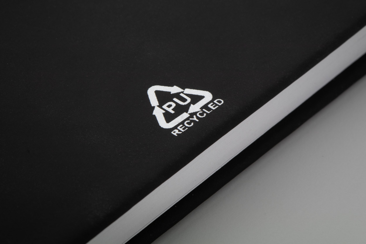 Notizbuch mit recyceltem PU-Lederbezug und 100 linierten Blättern aus Recyclingpapier. Mit farblich passendem Lesezeichen und Gummiband. A5-Größe.