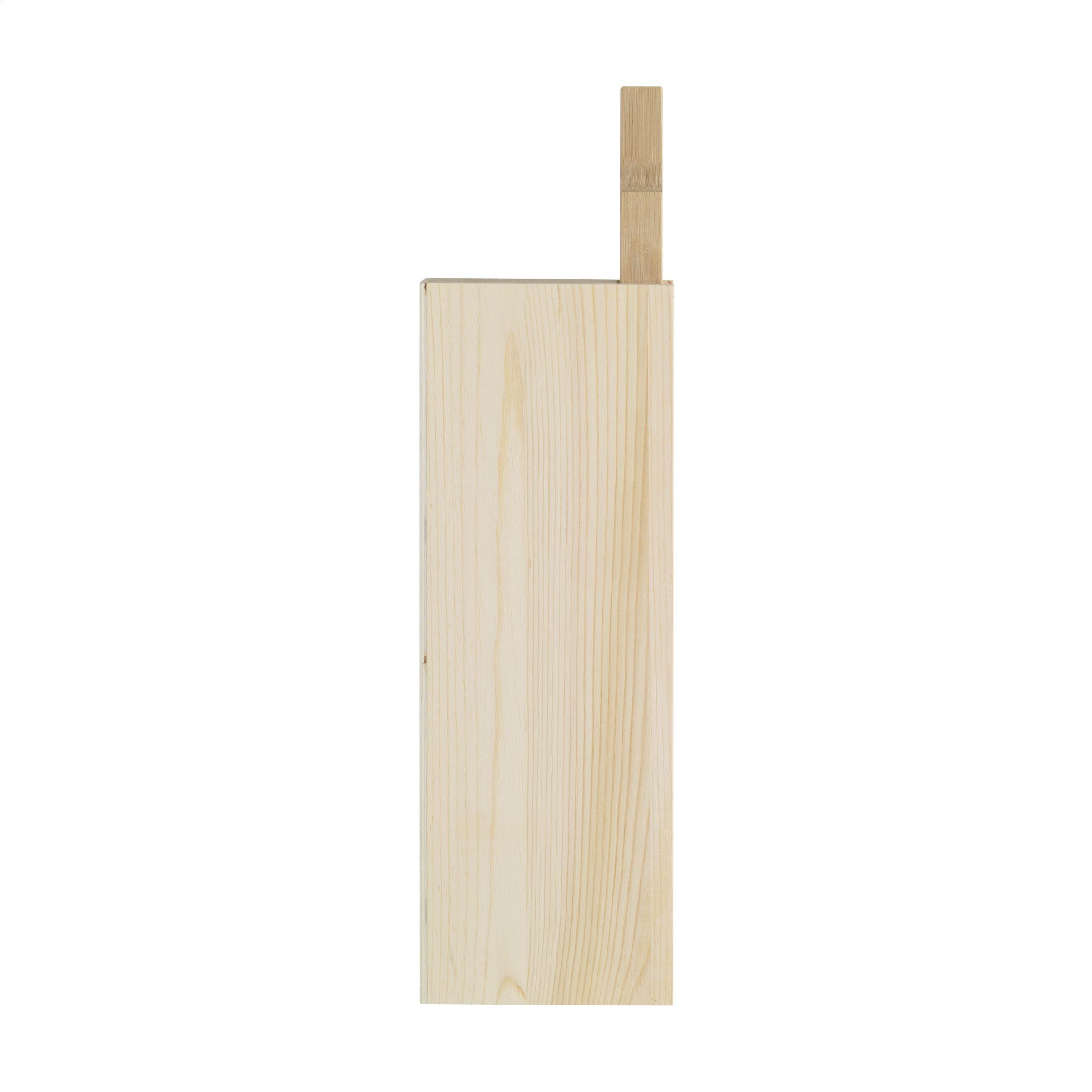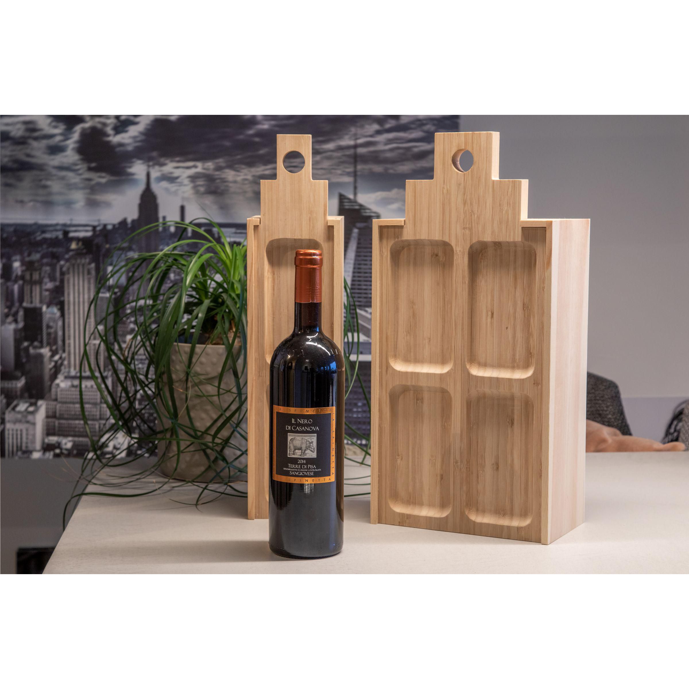Rackpack Casa de Tapas Small: Weinkiste und Snackplatte in einem. Der Bambus Deckel dieser Geschenkbox ist tatsächlich eine luxuriöse Tapasplatte in der Form eines holländischen Kanalhauses, die aus Bambus gefertigt wurde. Die Vorderseite des Bambustellers hat Fächer für Tapas, die Rückseite kann als Schneidebrett verwendet werden. Muchas gracias! Rackpack: eine Wein-Geschenkbox aus FSC 100% zertifiziertes Holz mit einem neuen zweiten Leben! • geeignet für eine Flasche Wein • 8-10 mm Kiefernholz • Bambusholz: eine Alternative zu Baumholz - Bambus kann innerhalb von 5 Jahren geerntet werden (Bäume brauchen 30 bis 120 Jahre!) und aus der verbleibenden Wurzel wachsen 4 bis 7 neue Pflanzen • Wein nicht inklusive.