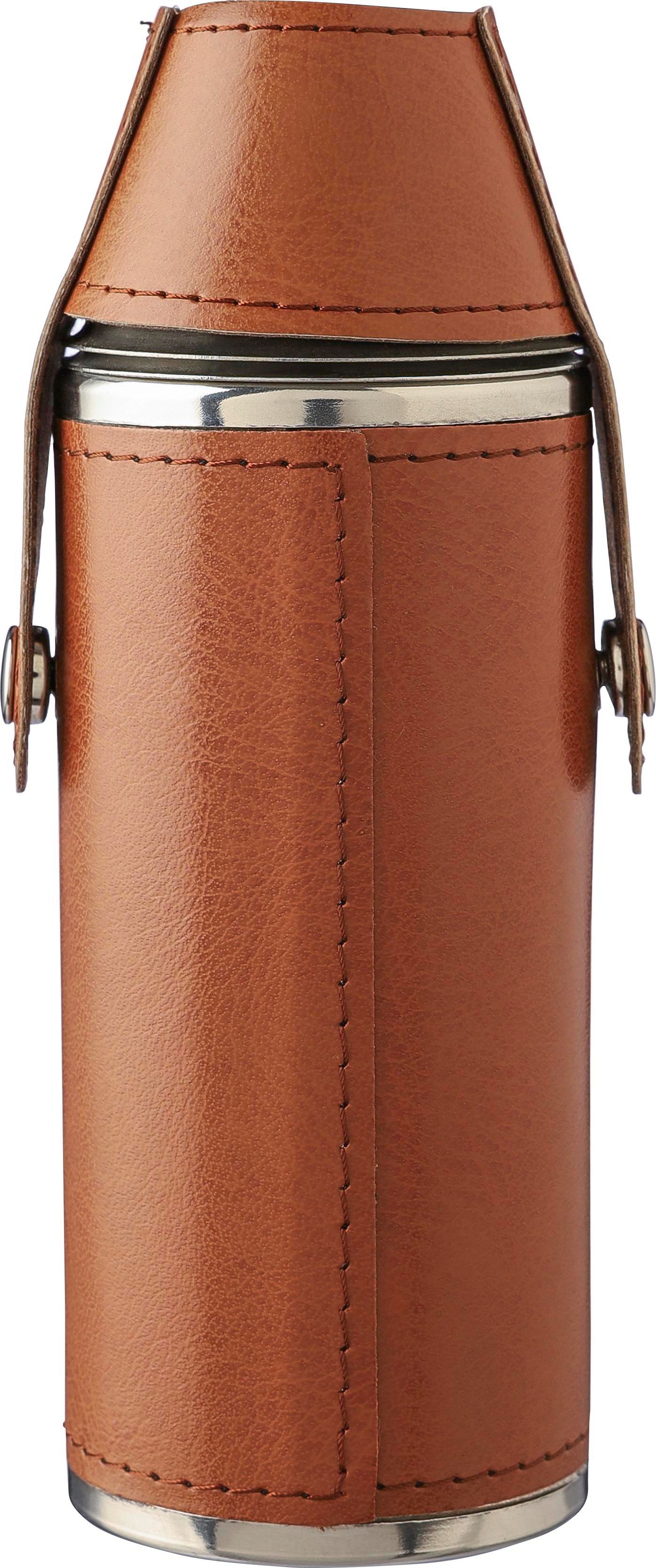 Recycelte Edelstahlflasche (230 ml) mit zwei Bechern (40 ml) und PU-Außenhülle. Hergestellt aus rostfreiem Stahl 304. Die Becher werden oben mit Druckknöpfen befestigt. Einzeln verpackt in einer braunen Pappschachtel.