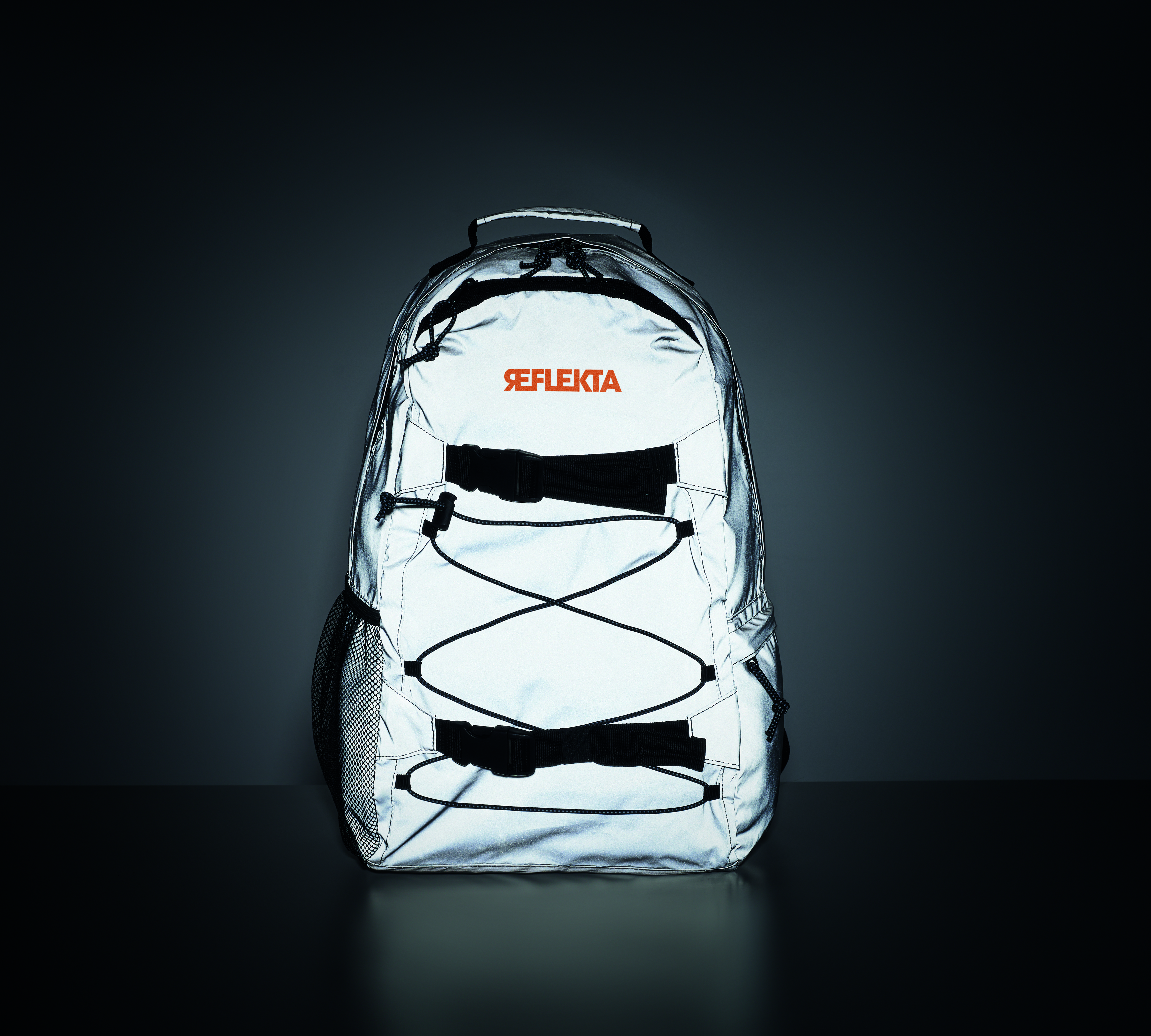 Rucksack aus reflektierendem 190T Polyester mit Schnürung auf der Vorderseite. 15'' Laptopfach. Seitliche Netztasche und Tasche mit Reißverschluss. Gepolsterter Rücken, Schultergurte und Boden.