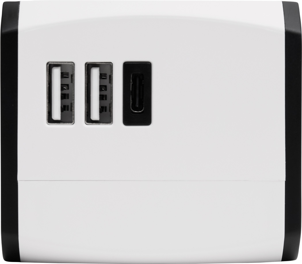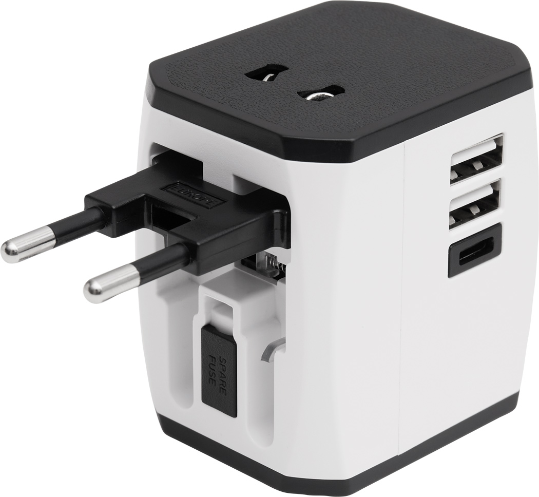 Reiseadapter TRAVEL POWER: mit Umschaltregler für UK, Europa, USA, Australien und Asien (nicht geeignet für die Schweiz), ausklappbare Stecker, mit 3 USB-Ladeanschlüssen (2 Ports USB Typ A und 1 Port USB Typ C, Gesamt-Ausgangsleistung max. 2,4 A) für z. B. Smartphone, Tablets etc., nur für nicht geerdete Geräte zu verwenden, in Box