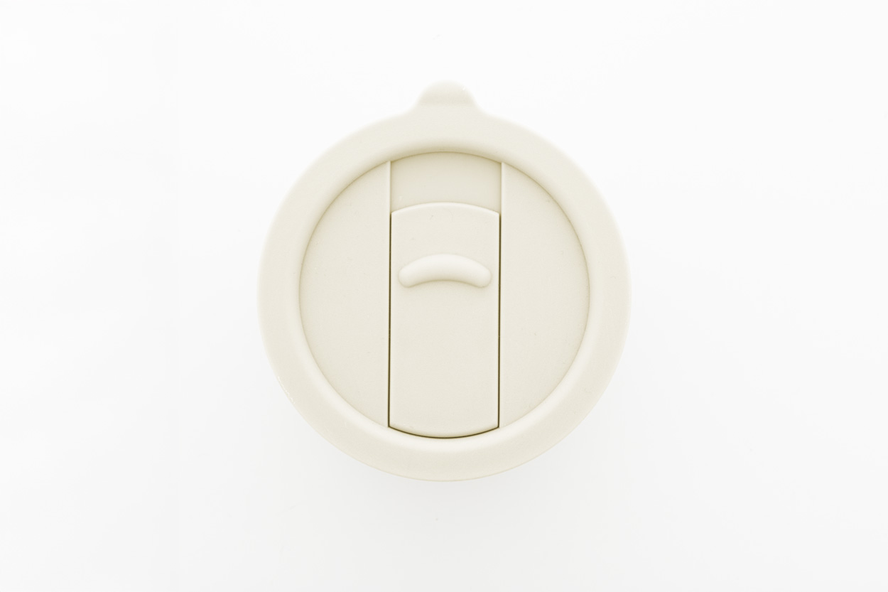 Reisebecher aus Keramik mit Silikonummantelung mit Trinkdeckel aus PP Kunststoff. Füllmenge: 300 ml.