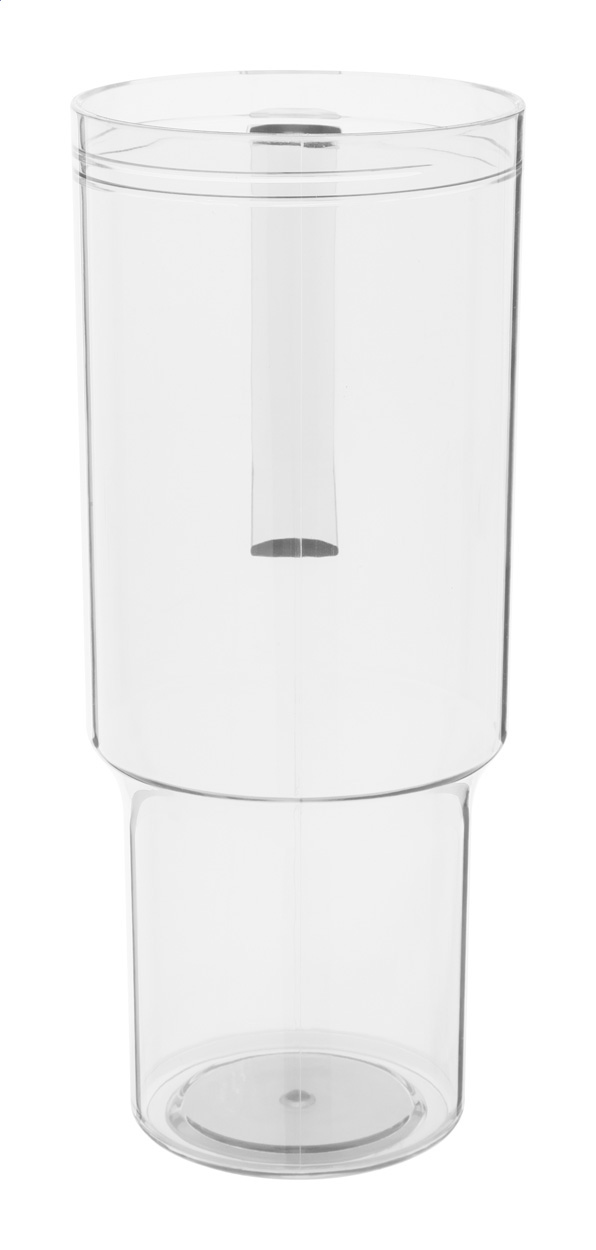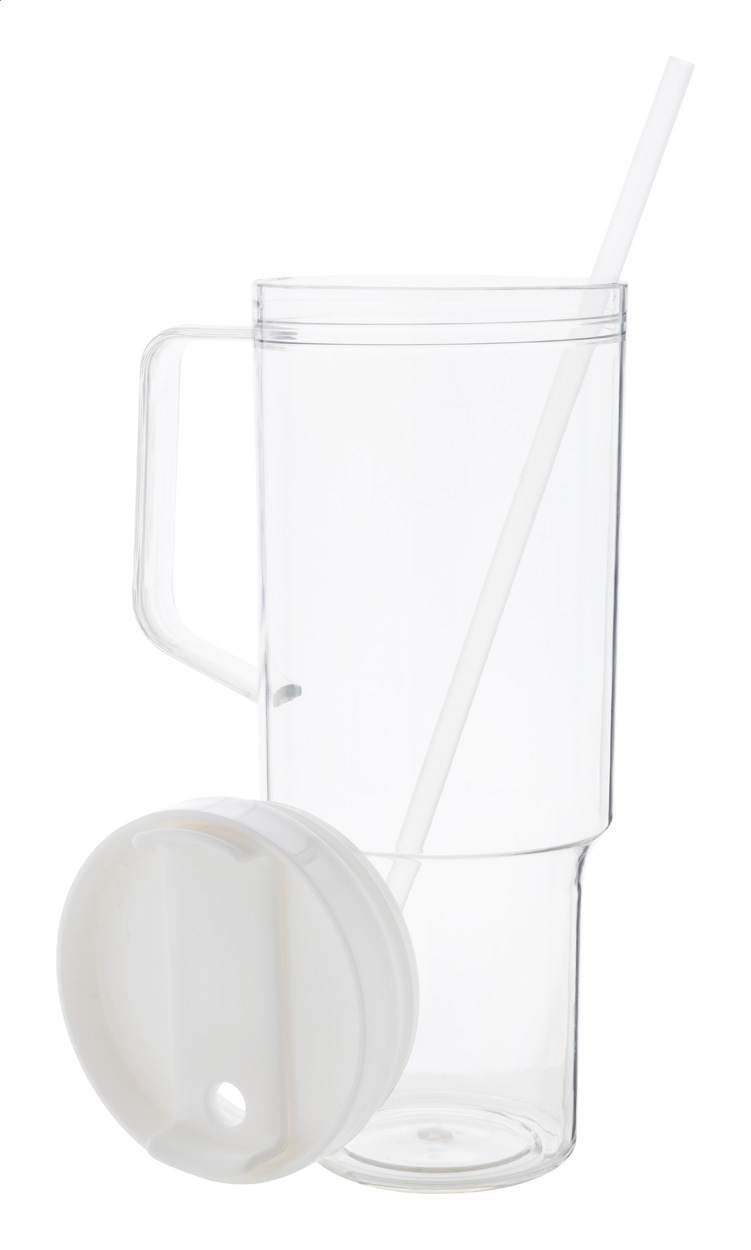 Einwandiger RPET-Reisebecher mit farblich passendem PP-Trinkdeckel und Strohhalm. Füllmenge: 1200 ml.
