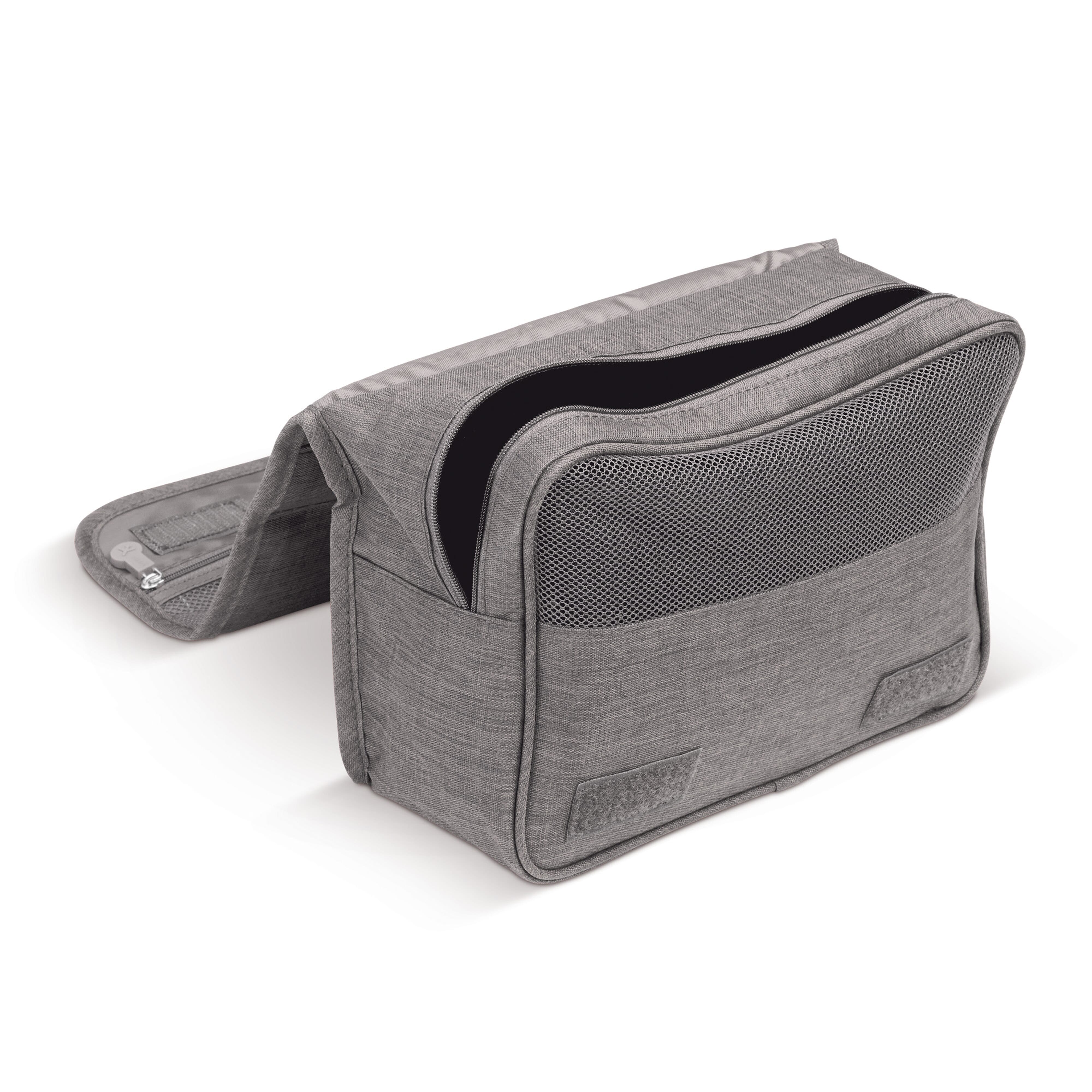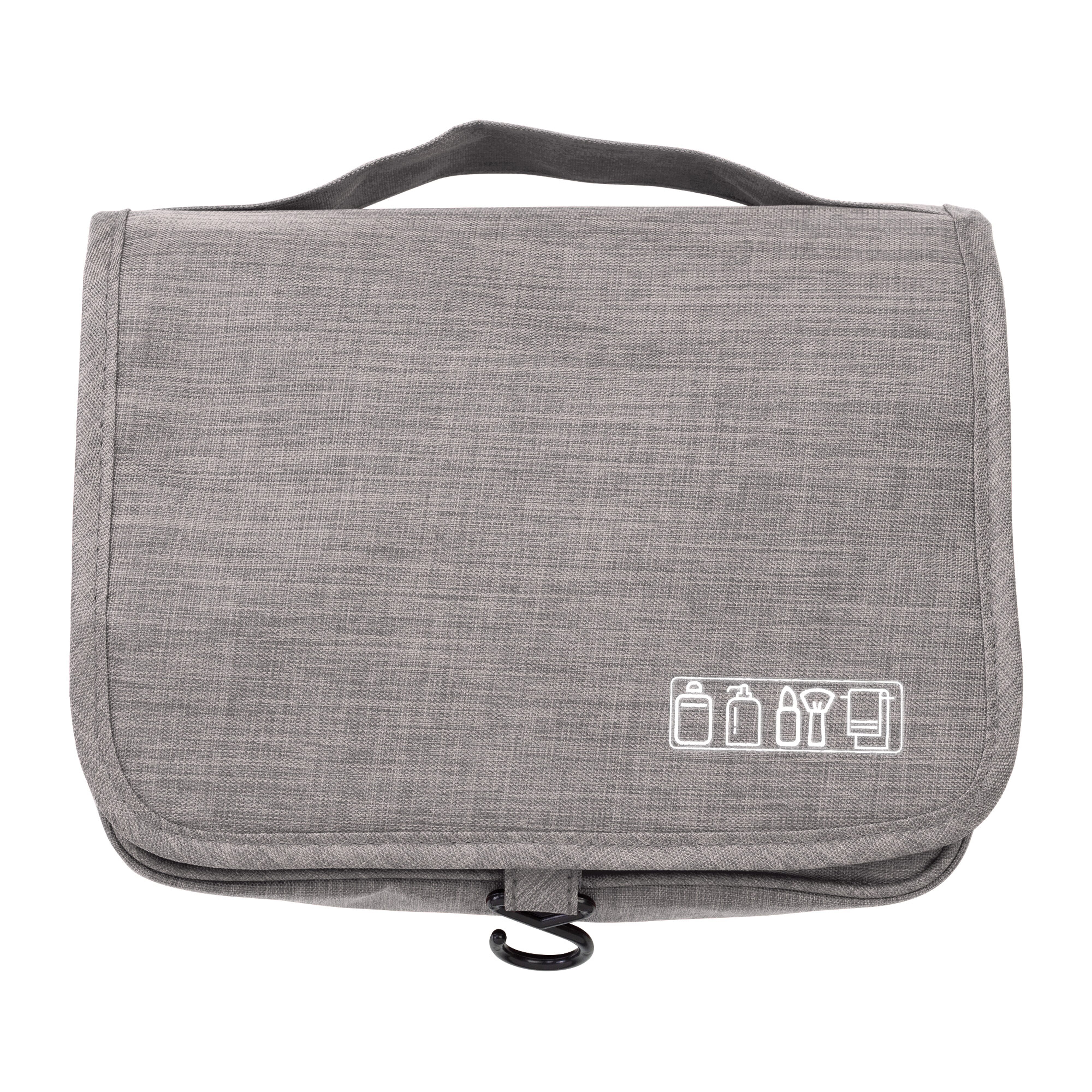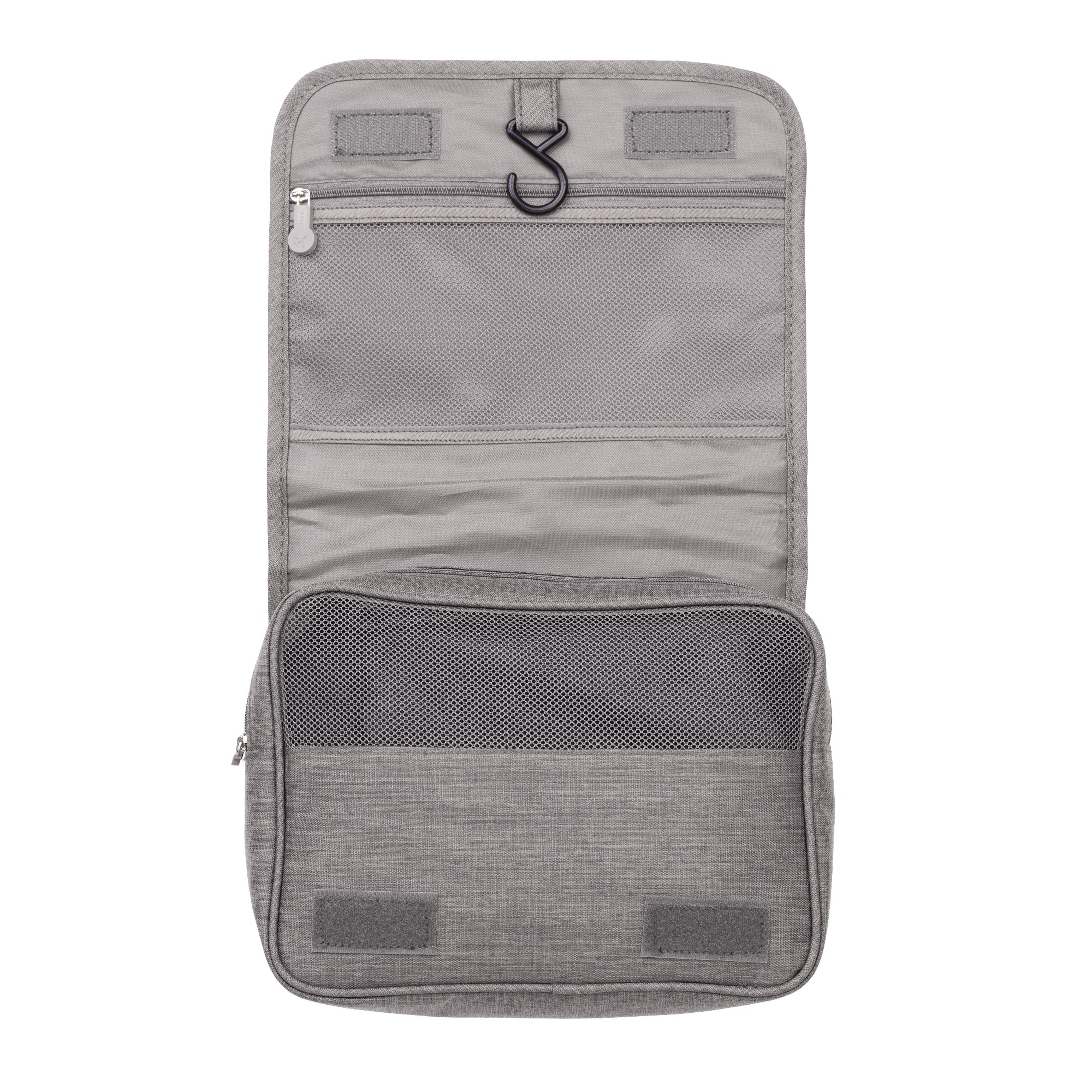Praktischer Kulturbeutel mit verschiedenen Fächern. Der Haken ermöglicht es, ihn aufzuhängen.