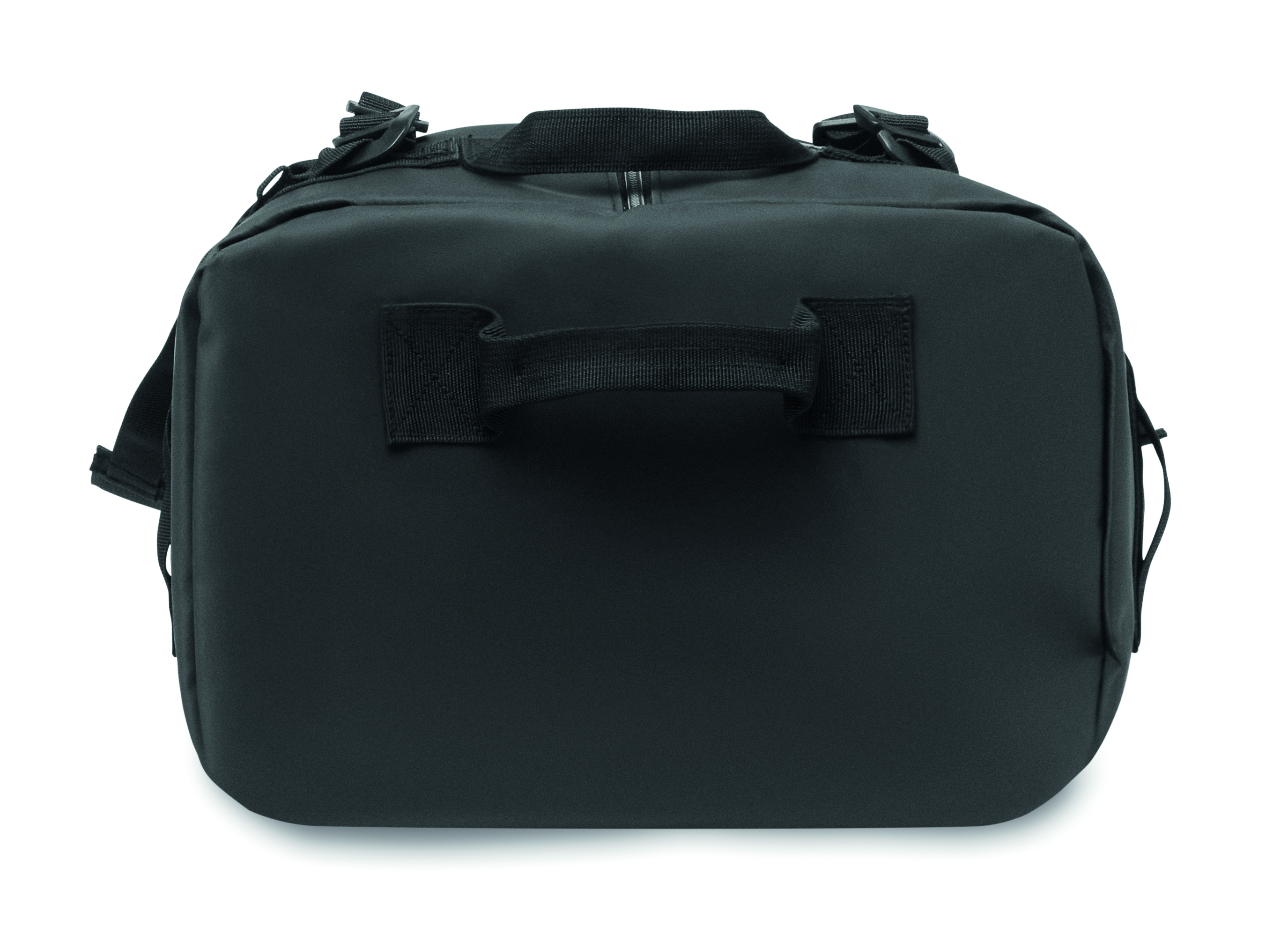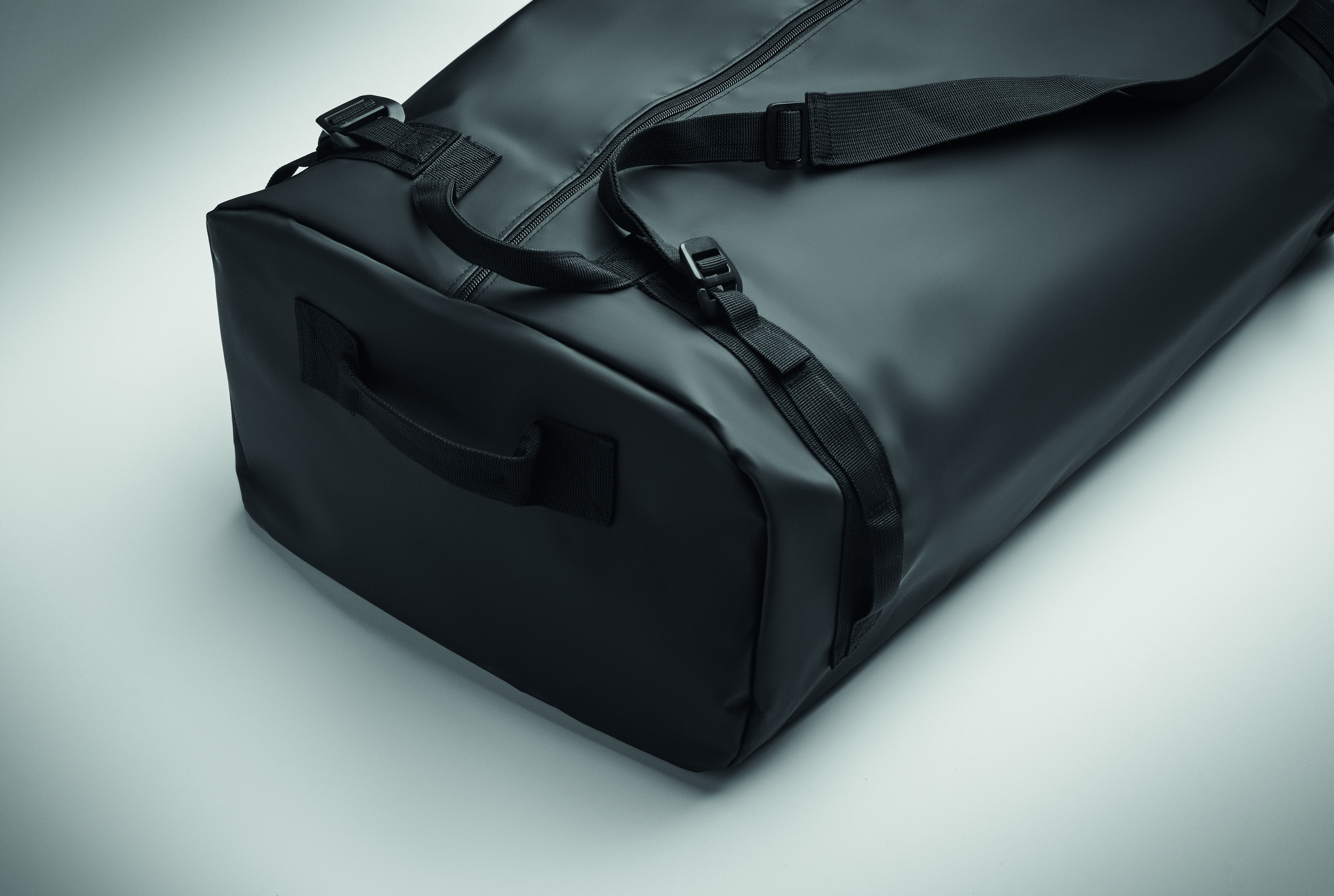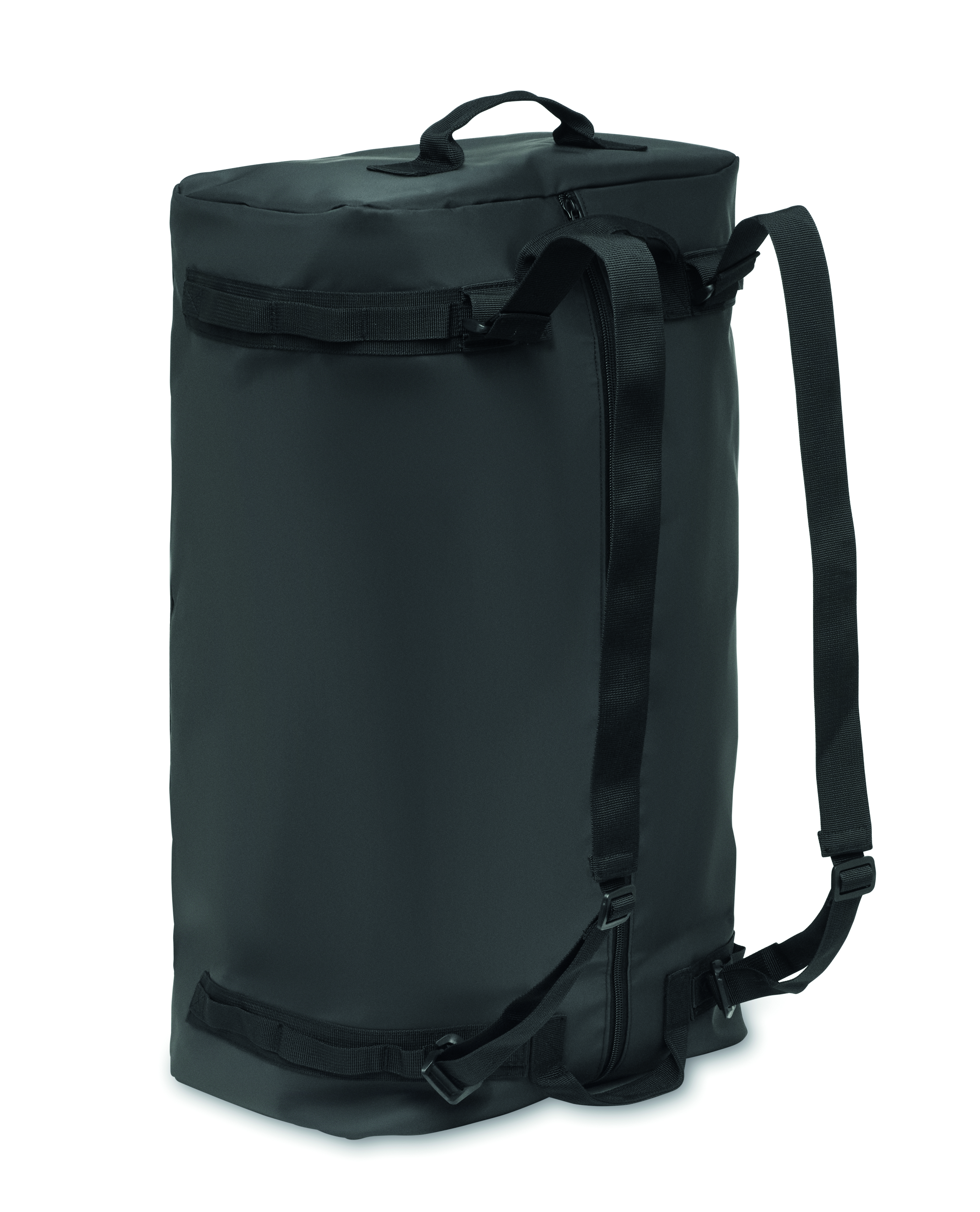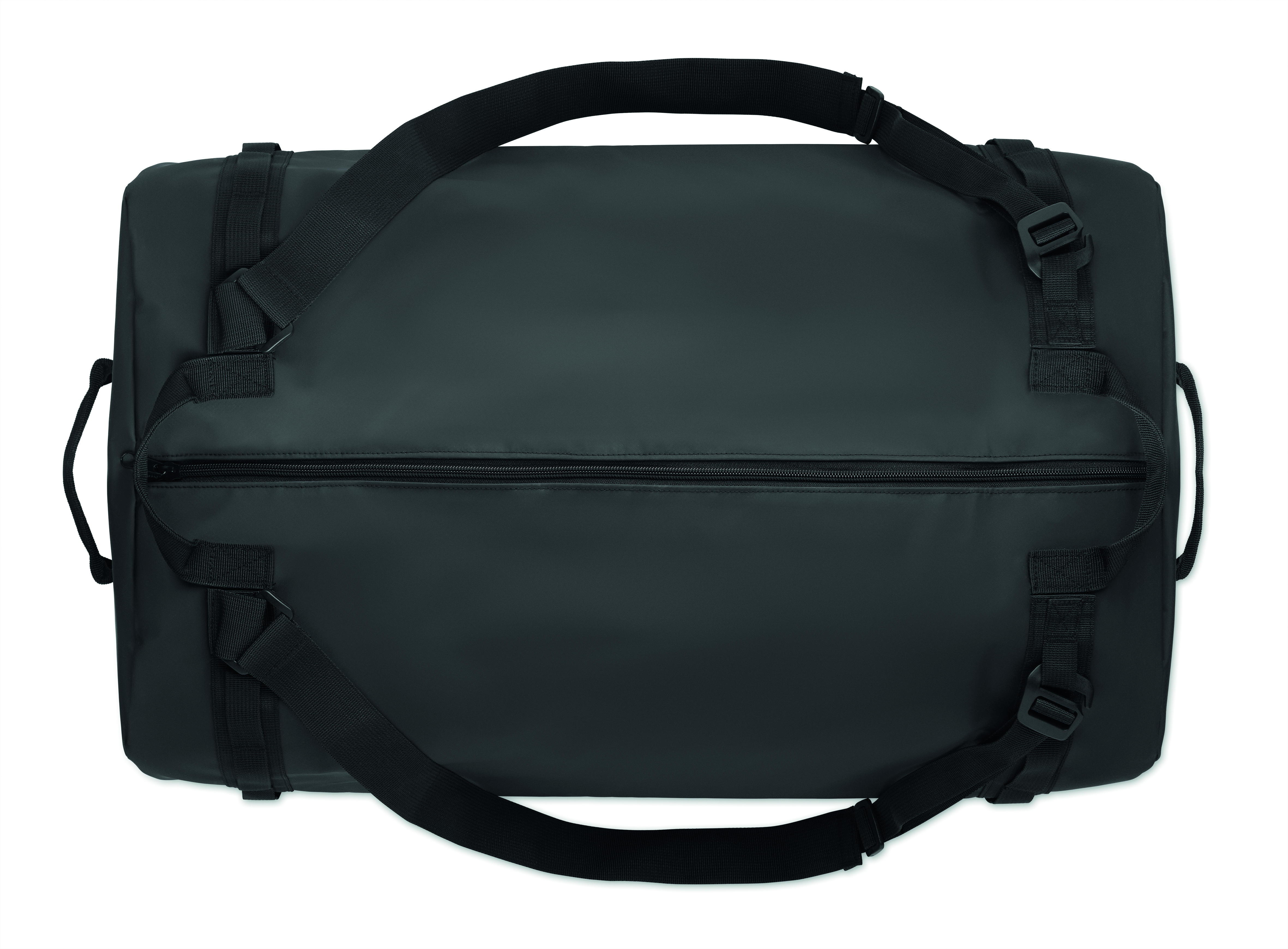 Große Sport- oder Reisetasche, auch als Rucksack verwendbar. 50C-Plane. Innenfach mit Reißverschluss. Abnehmbarer, verstellbarer Schultergurt. Futter aus RPET.