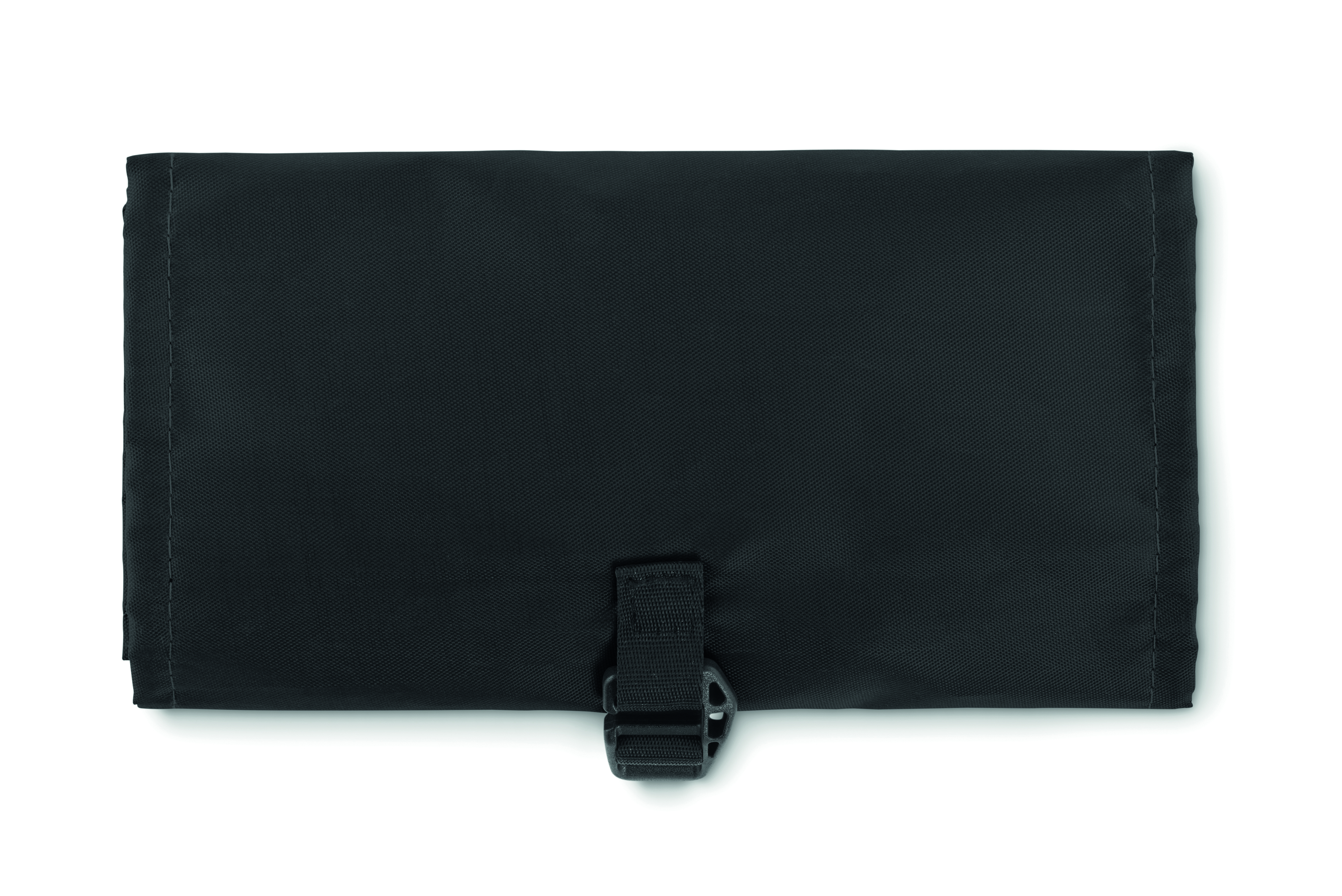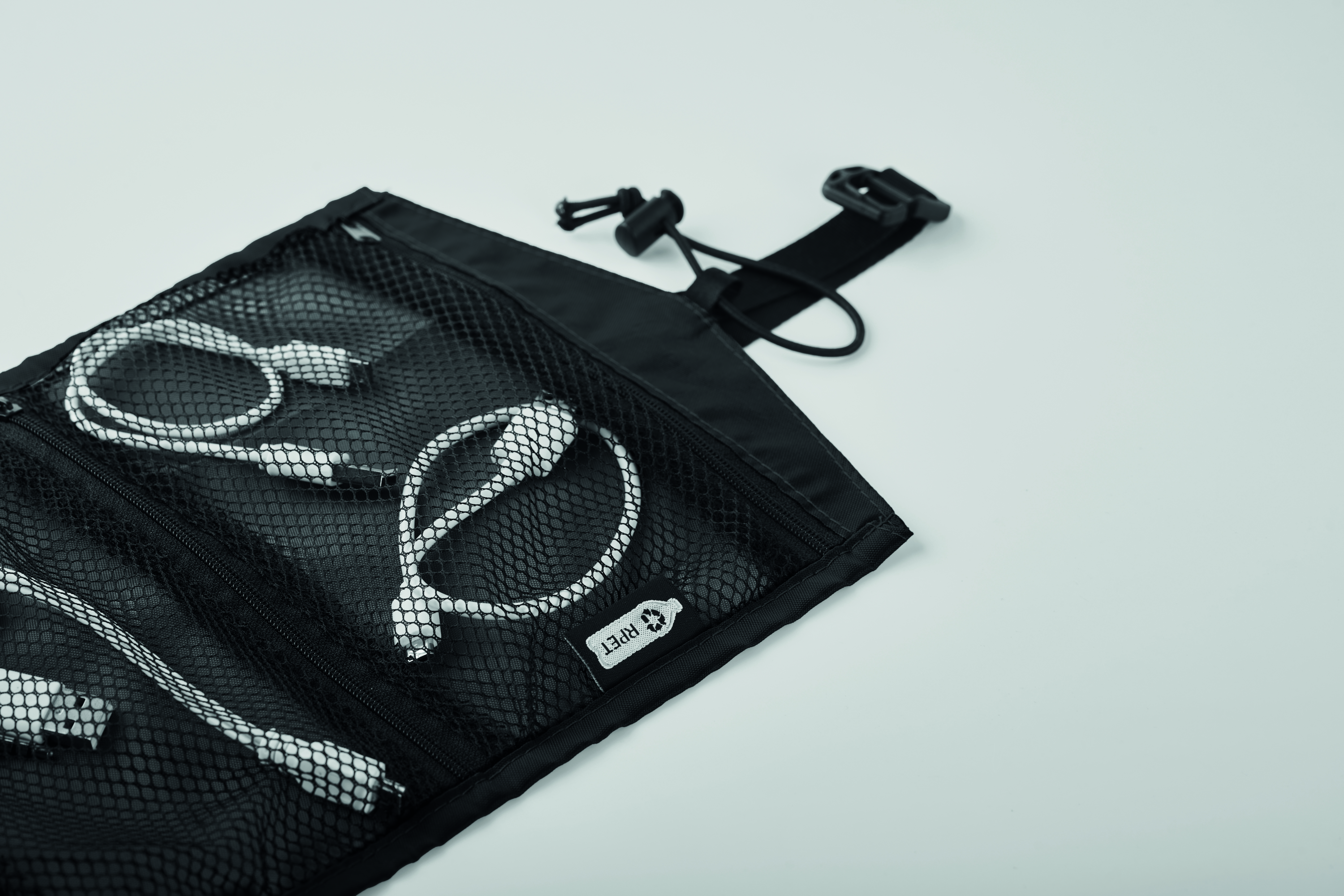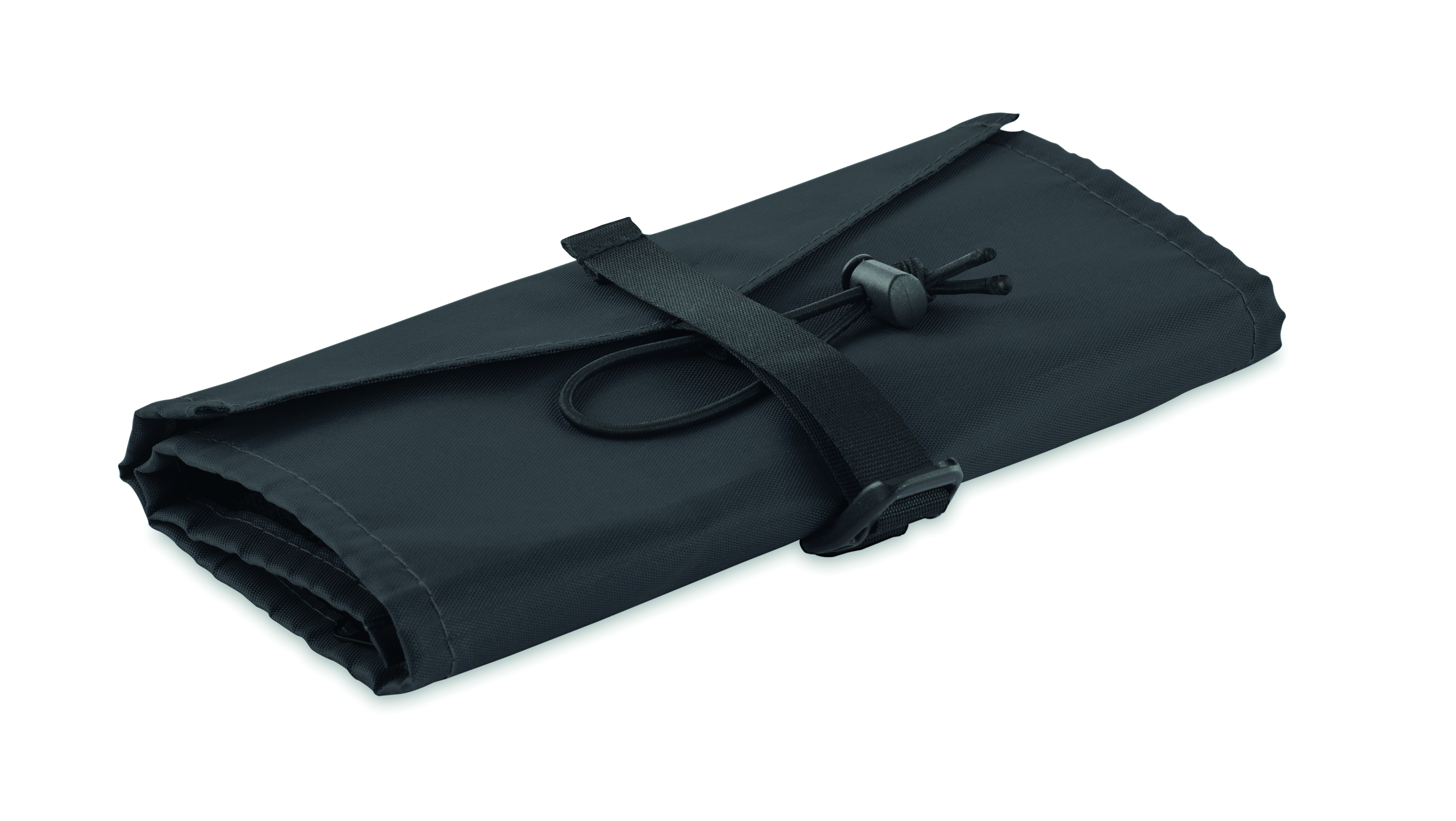 Rolltasche aus 210D RPET zur Aufbewahrung von Kabeln. 3 Reißverschlussfächer mit REPT-Netz. Auch ideal als Kosmetiktasche.