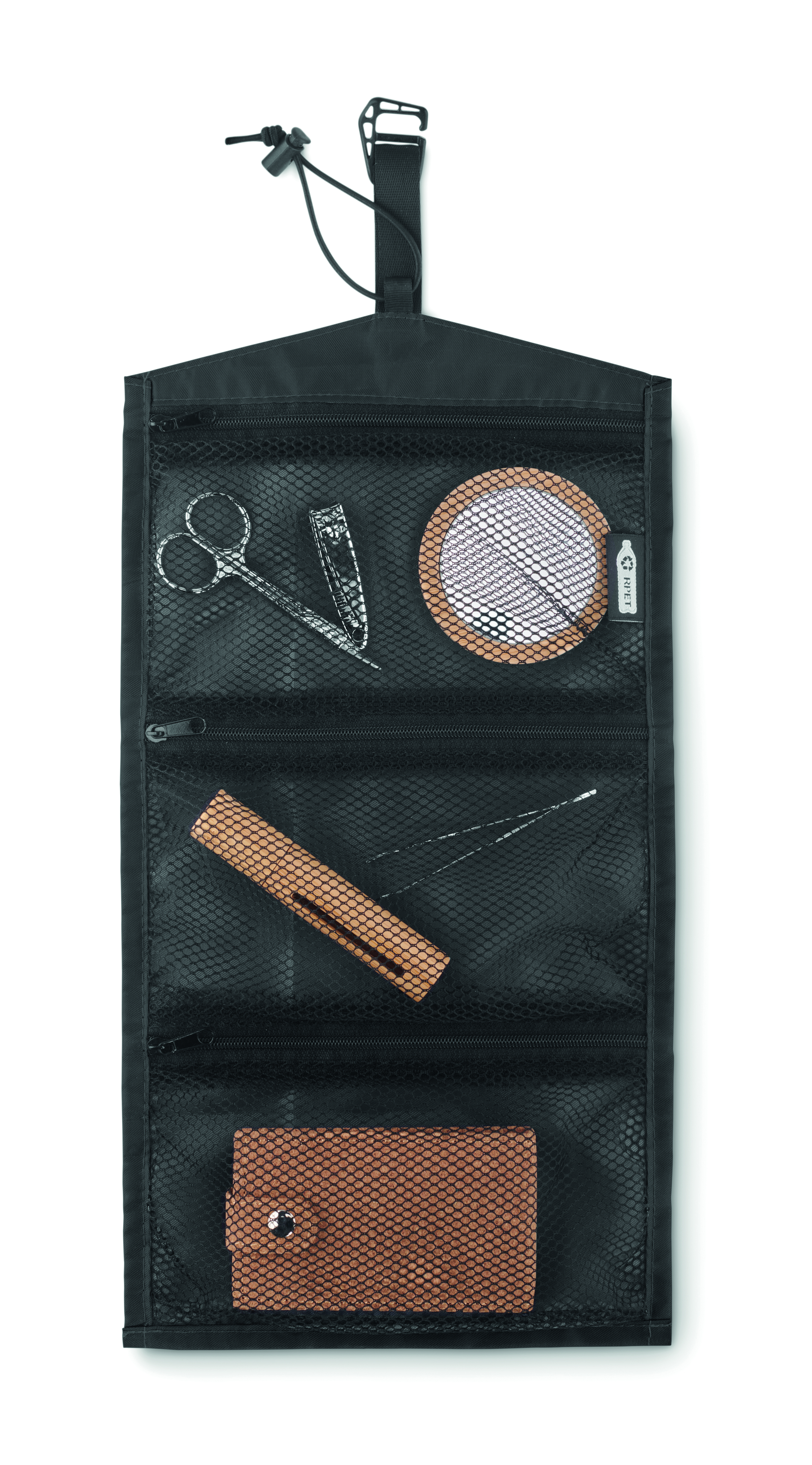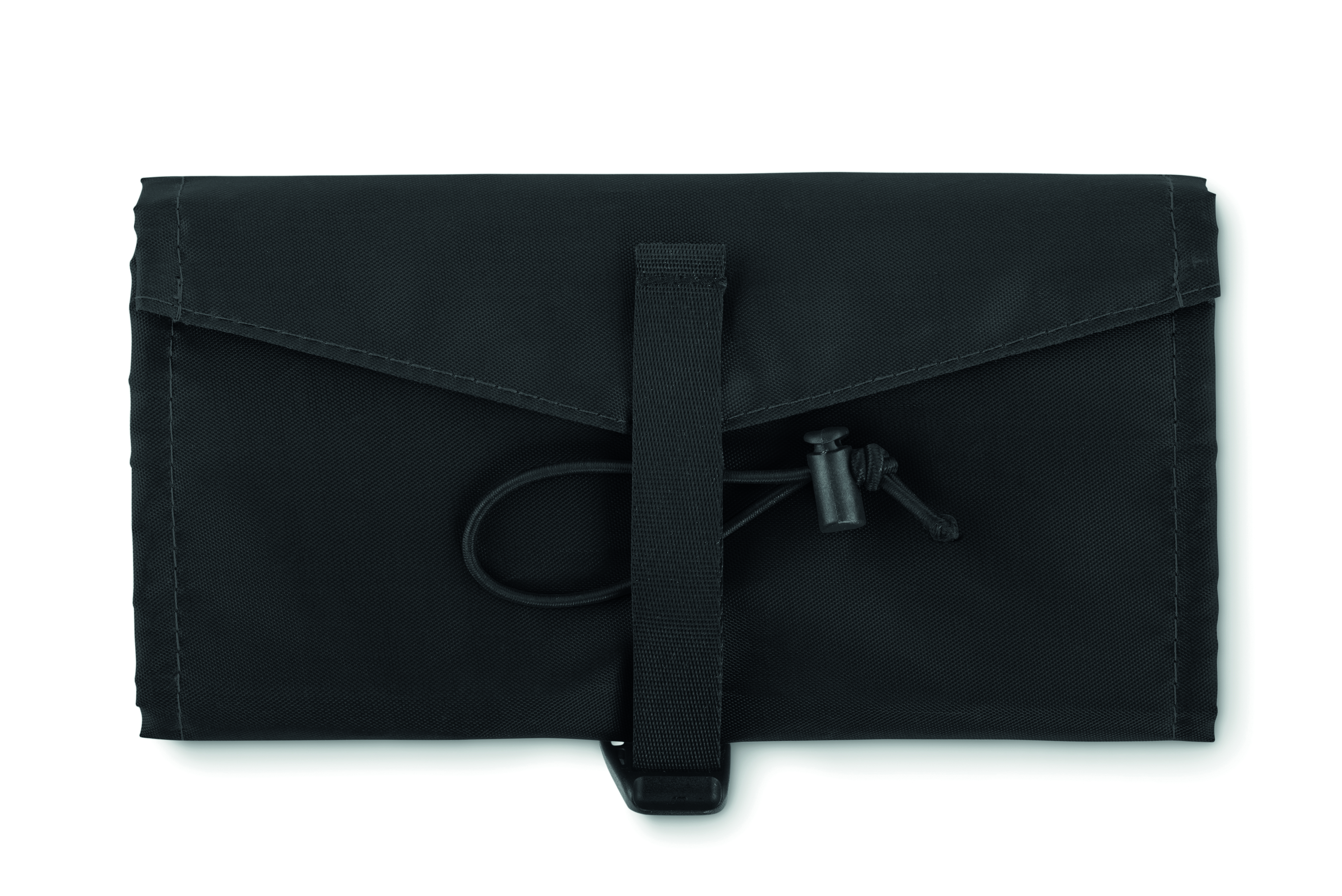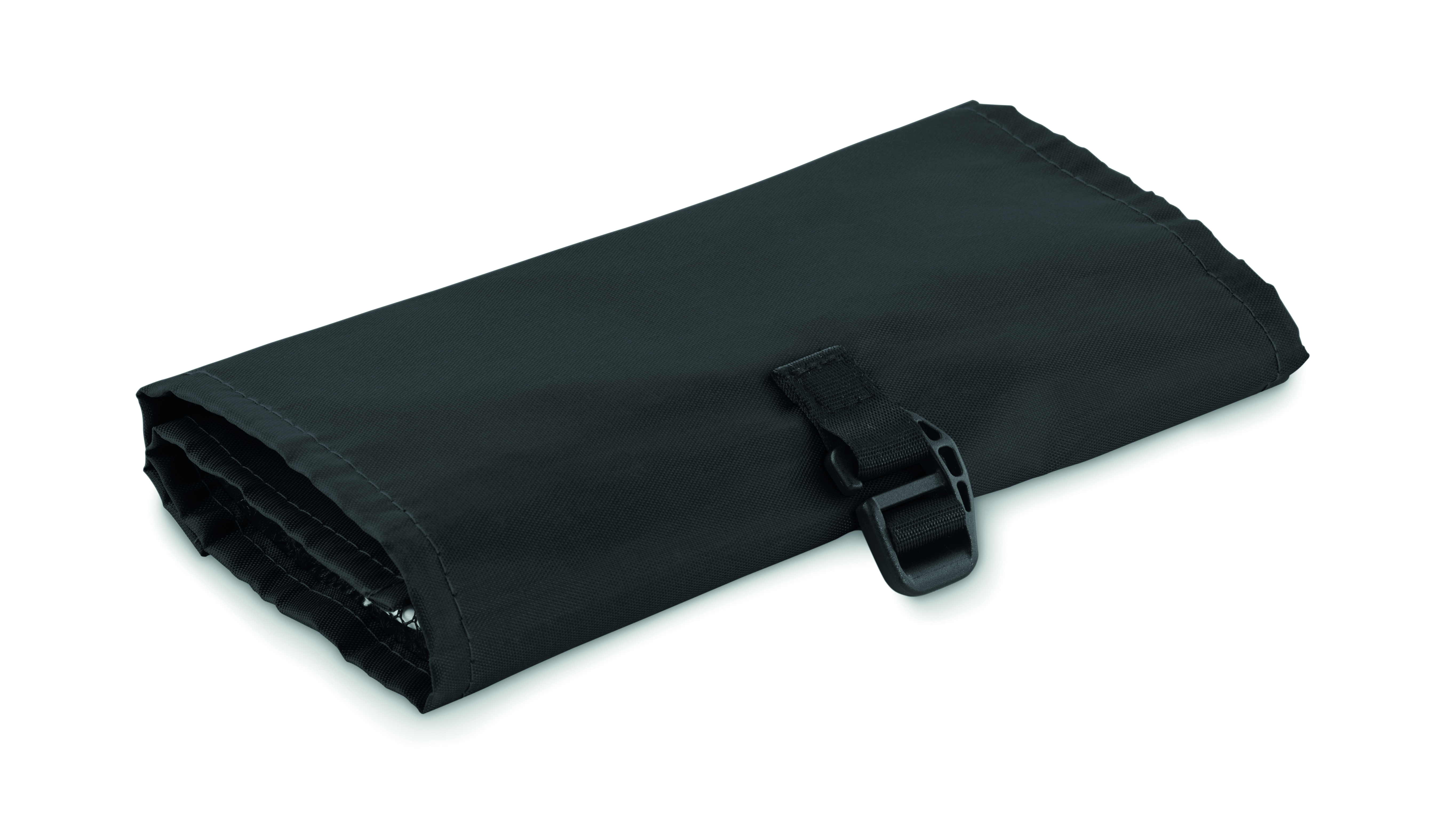 Rolltasche aus 210D RPET zur Aufbewahrung von Kabeln. 3 Reißverschlussfächer mit REPT-Netz. Auch ideal als Kosmetiktasche.