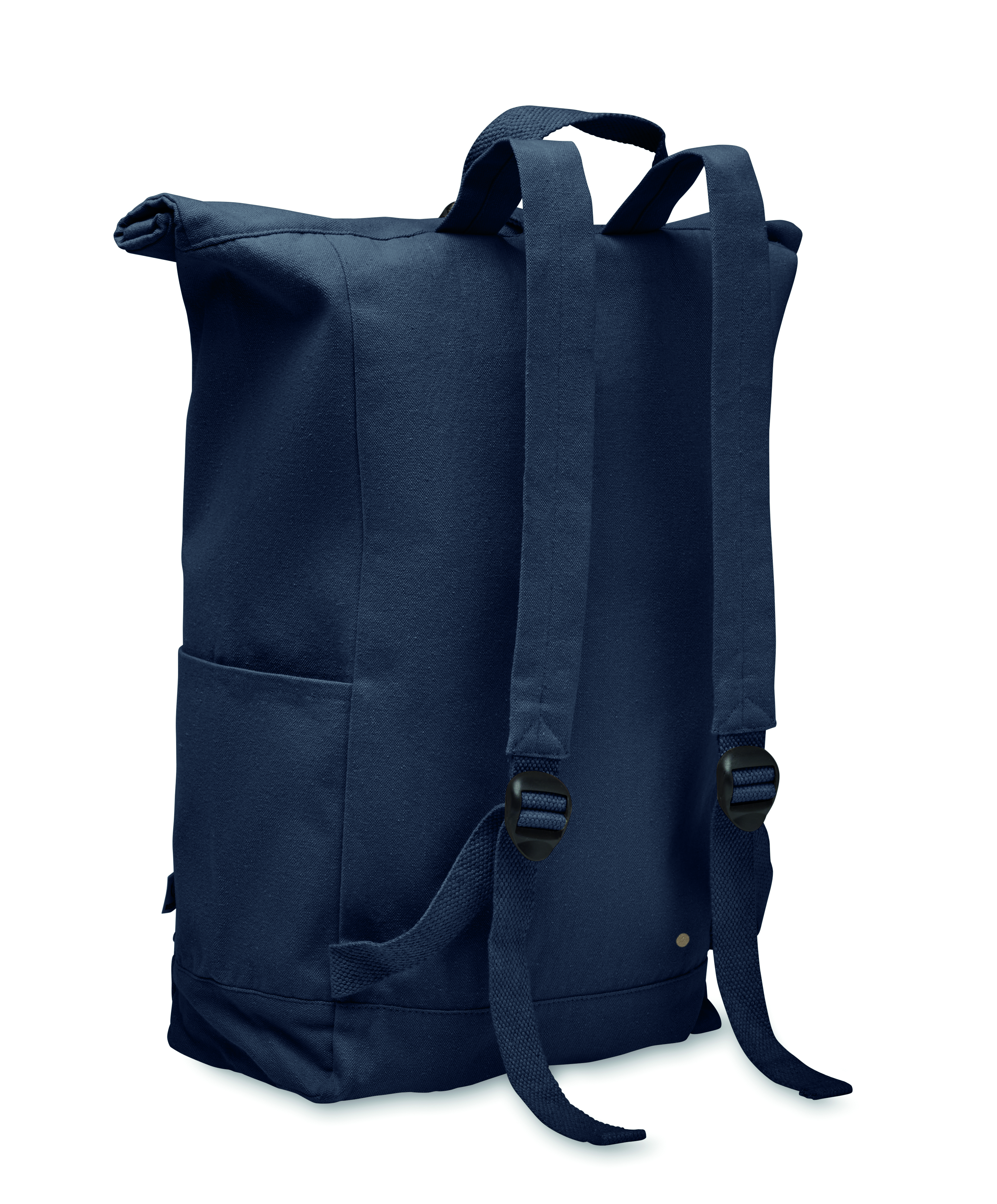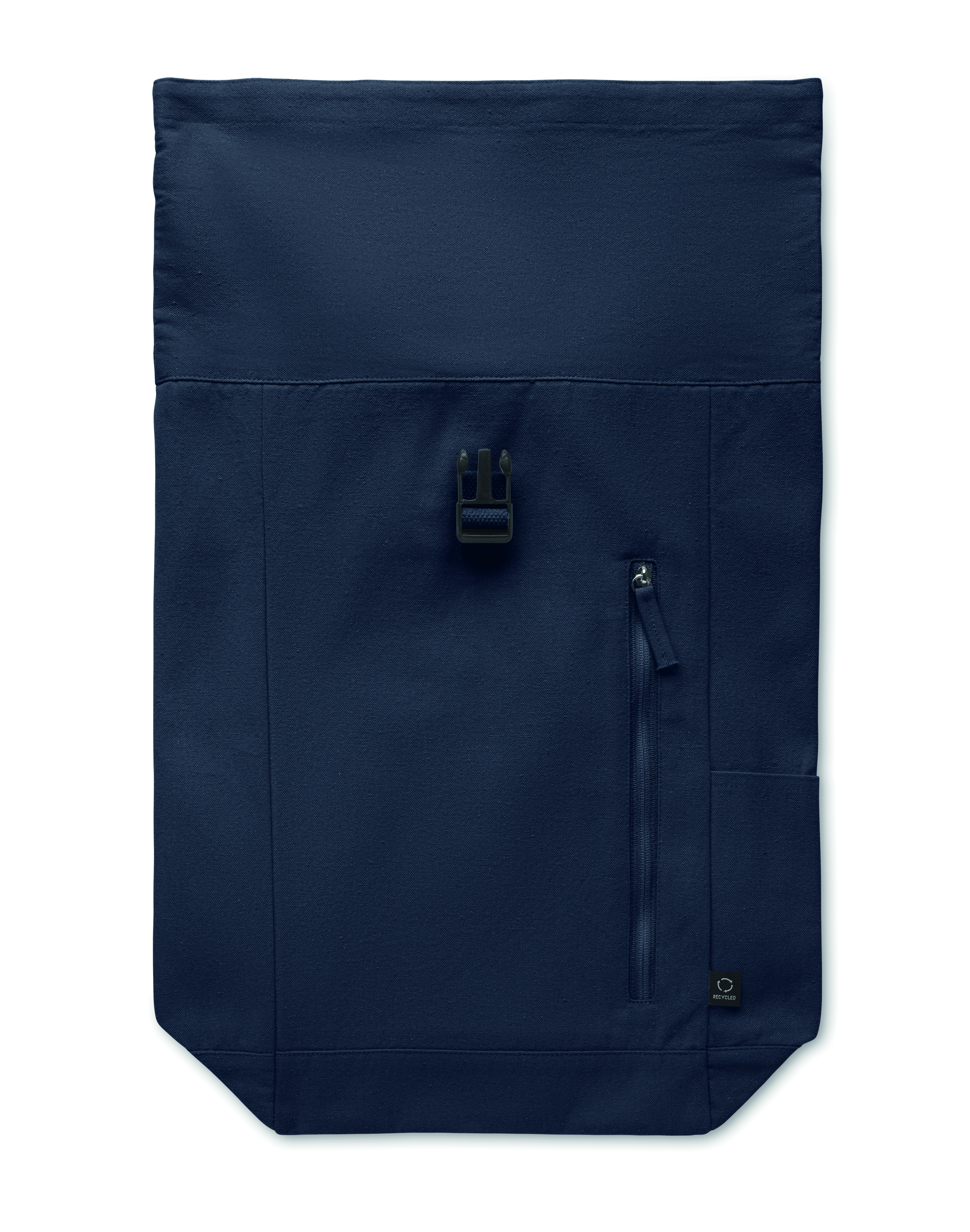 Rolltop-Rucksack mit Klettverschluss aus 390 g / m² (recycelte Baumwolle 80% und recycelter Polyester 20%). Fronttasche mit Reißverschluss.