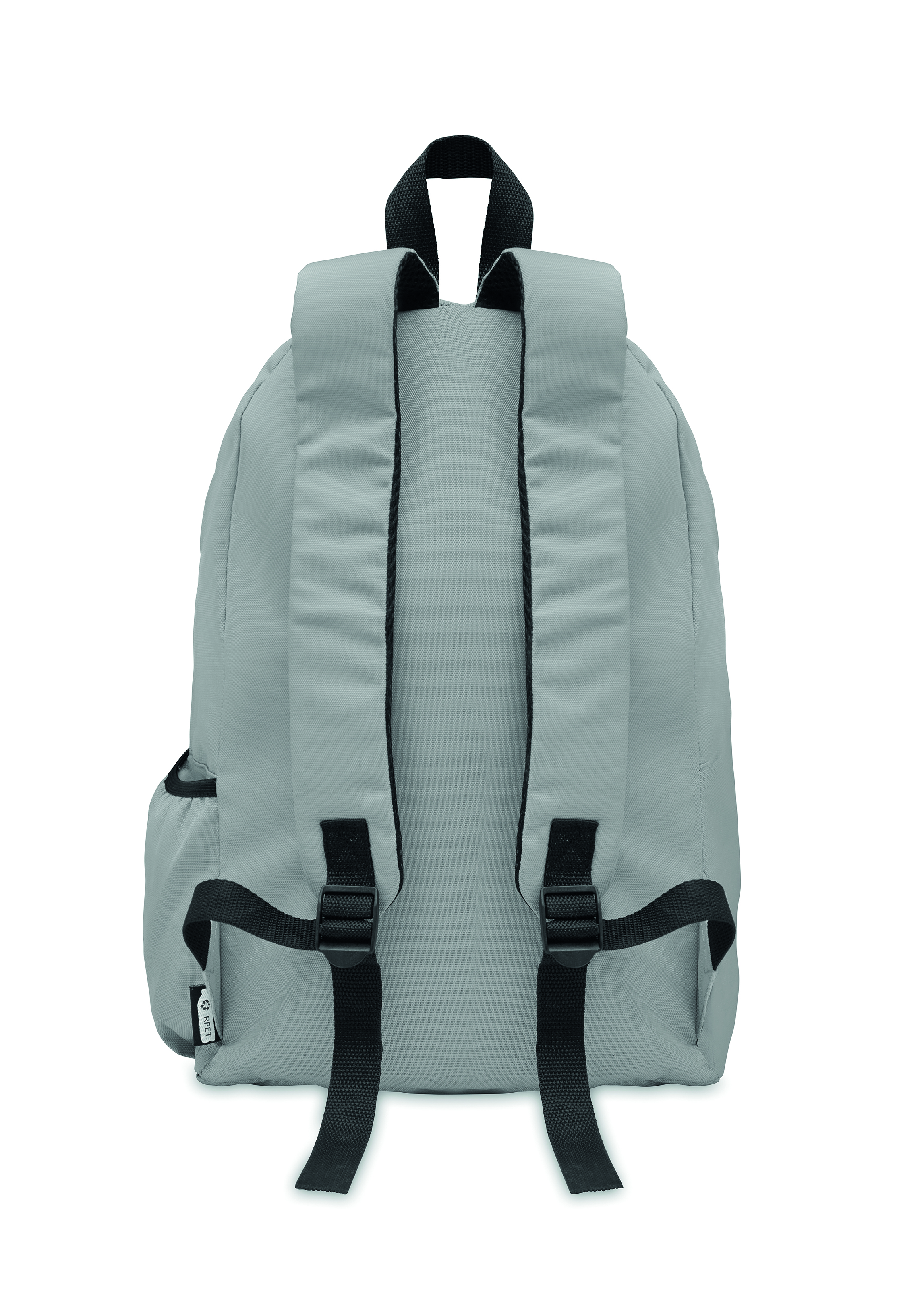 Rucksack mit Reißverschluss-Außentasche. Gepolsterter Rücken und seitliches Flaschenfach. 600D RPET-Polyester.