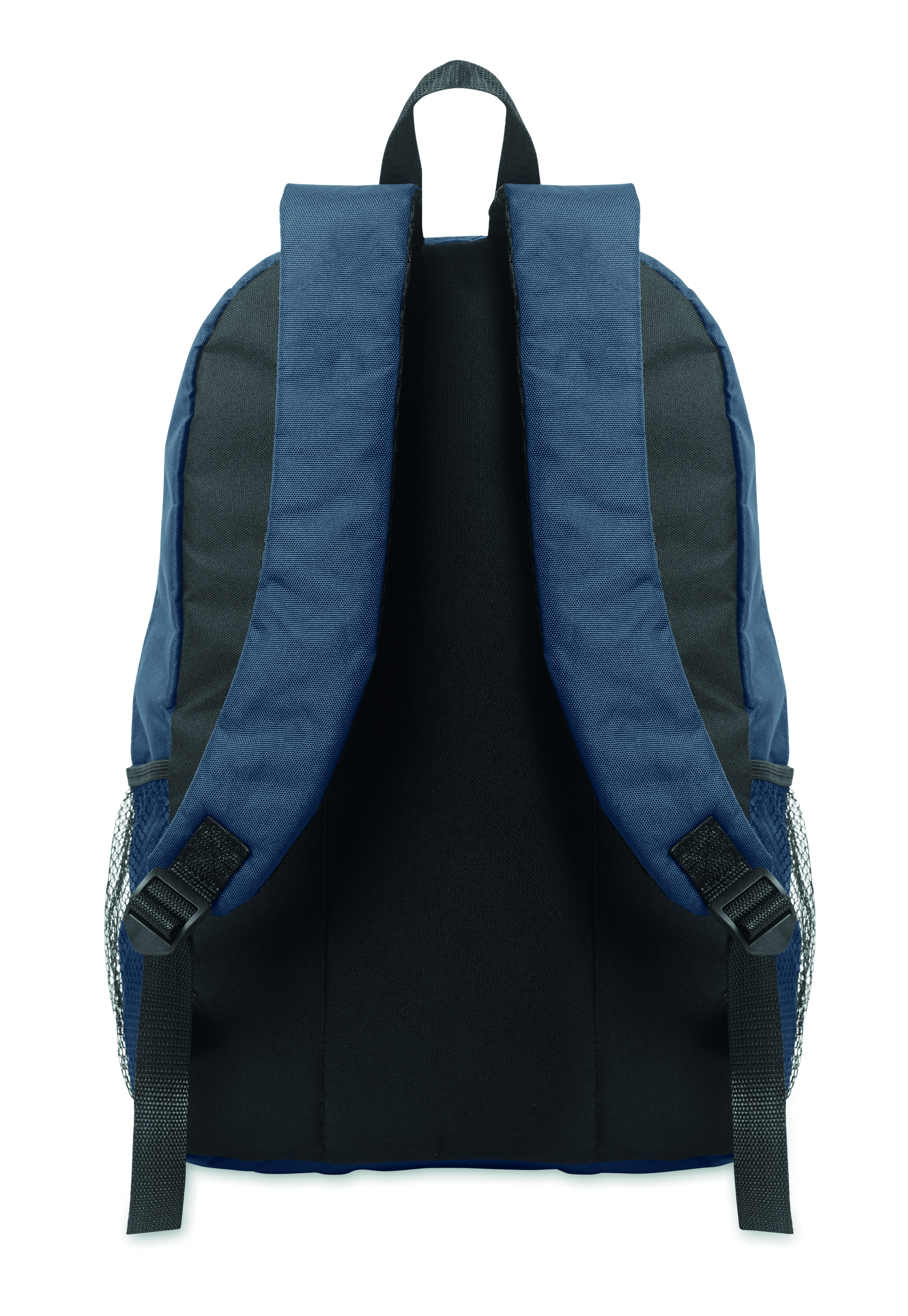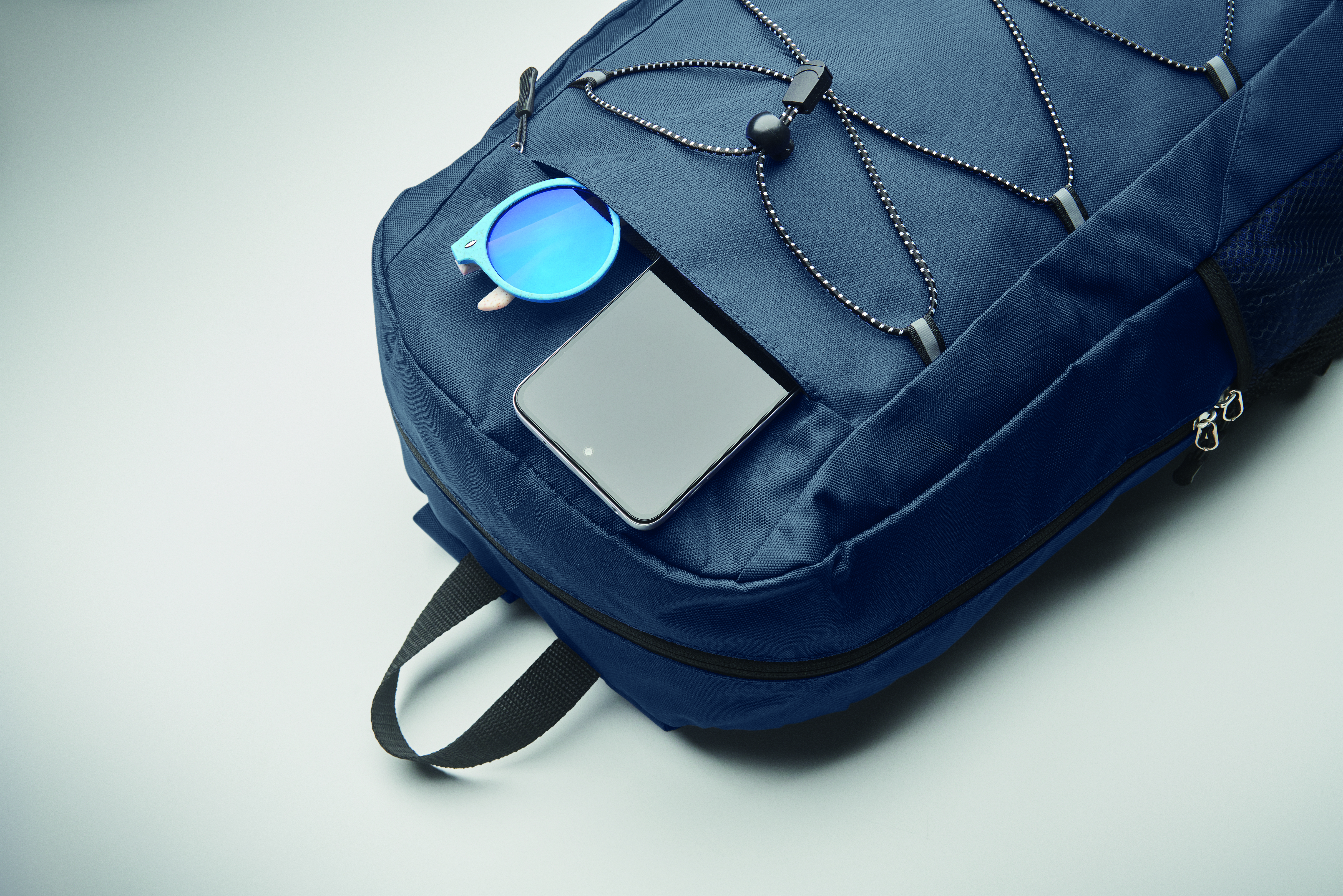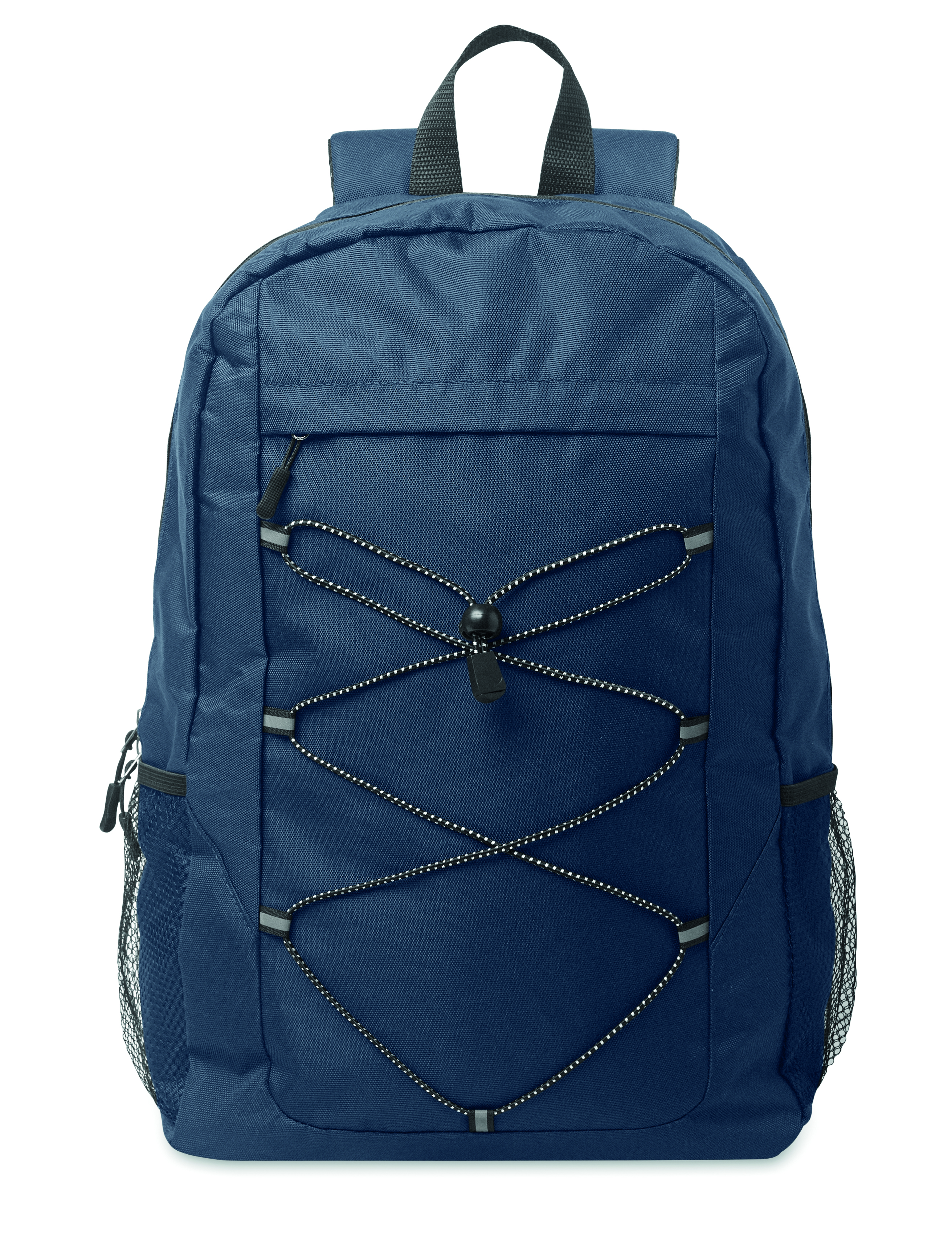 Rucksack mit Schnürung. Fronttasche mit Reißverschluss. Netztaschen auf beiden Seiten. 600D RPET-Polyester.