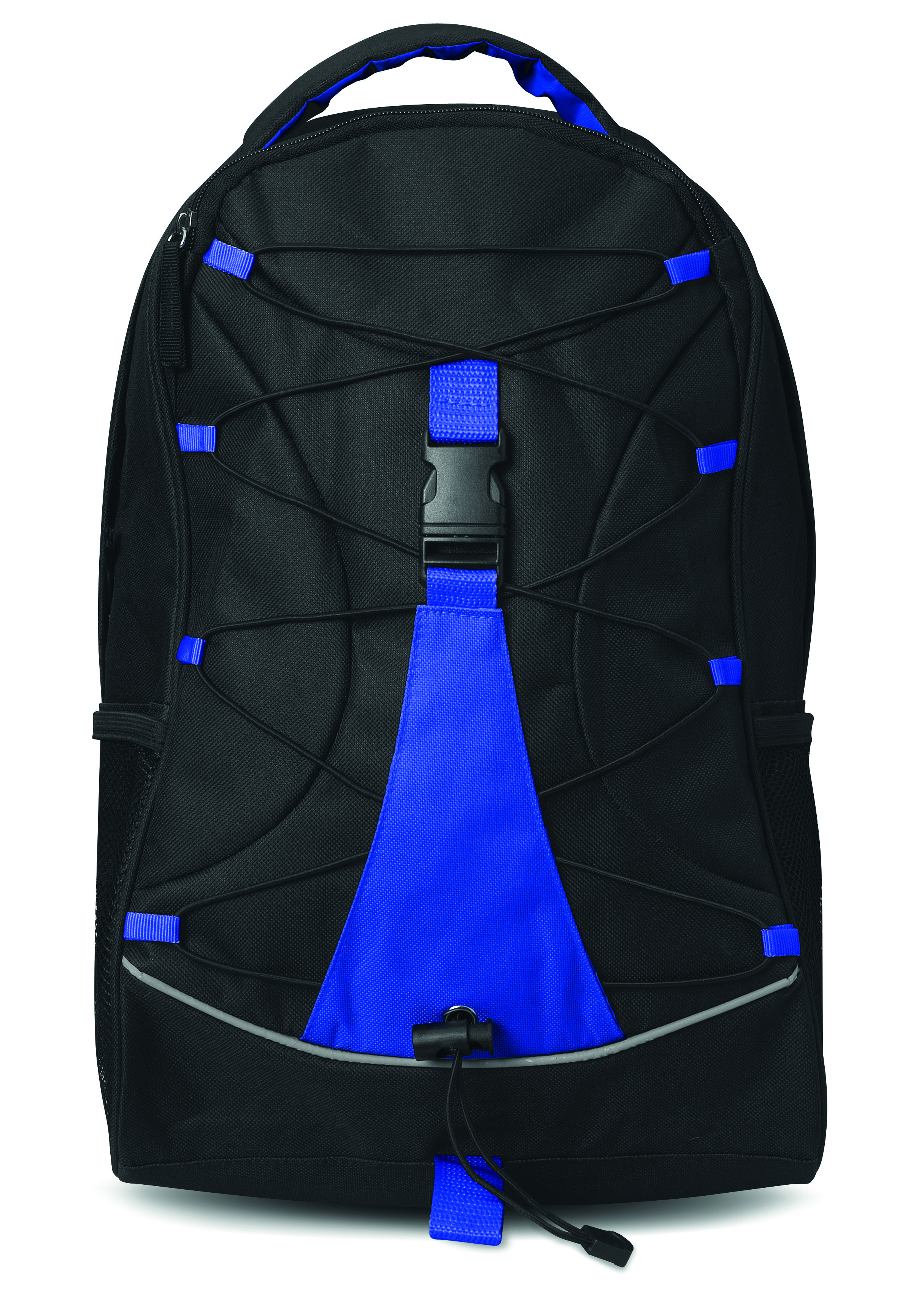 Schwarzer Rucksack mit farbigen Applikationen. Schnürung auf der Vorderseite. Netztaschen an den Seiten. 600D Polyester.