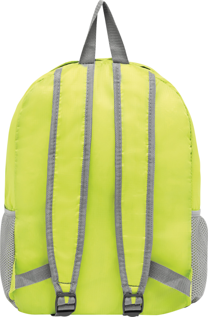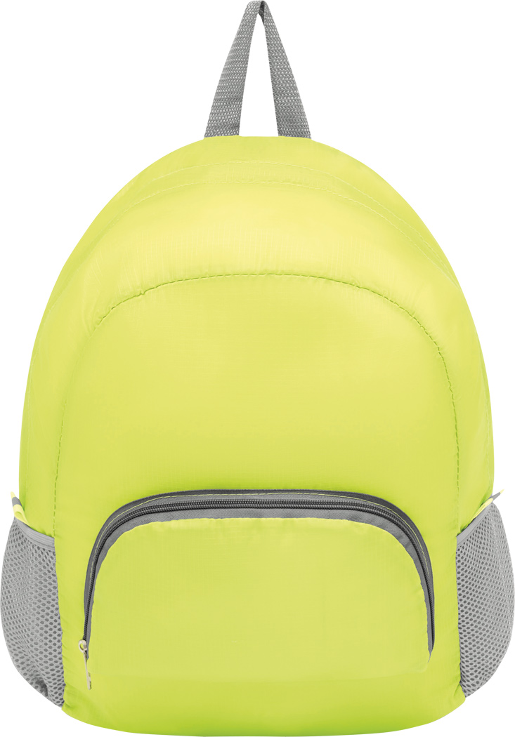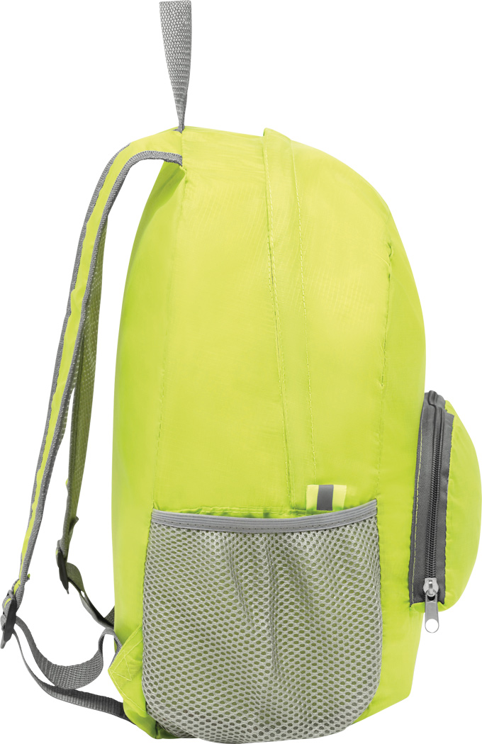 Rucksack VOLUNTEER, faltbar: Reißverschluss-Vorfach mit Trageschlaufe, geräumiges Reißverschluss-Hauptfach, 2 seitliche Netzfächer, 2 Reflektor-Etiketten, Trageschlaufe, verstellbare gepolsterte Schultergurte – lässt sich platzsparend zu einer Mini-Tasche zusammenfalten und passt perfekt in die Handtasche