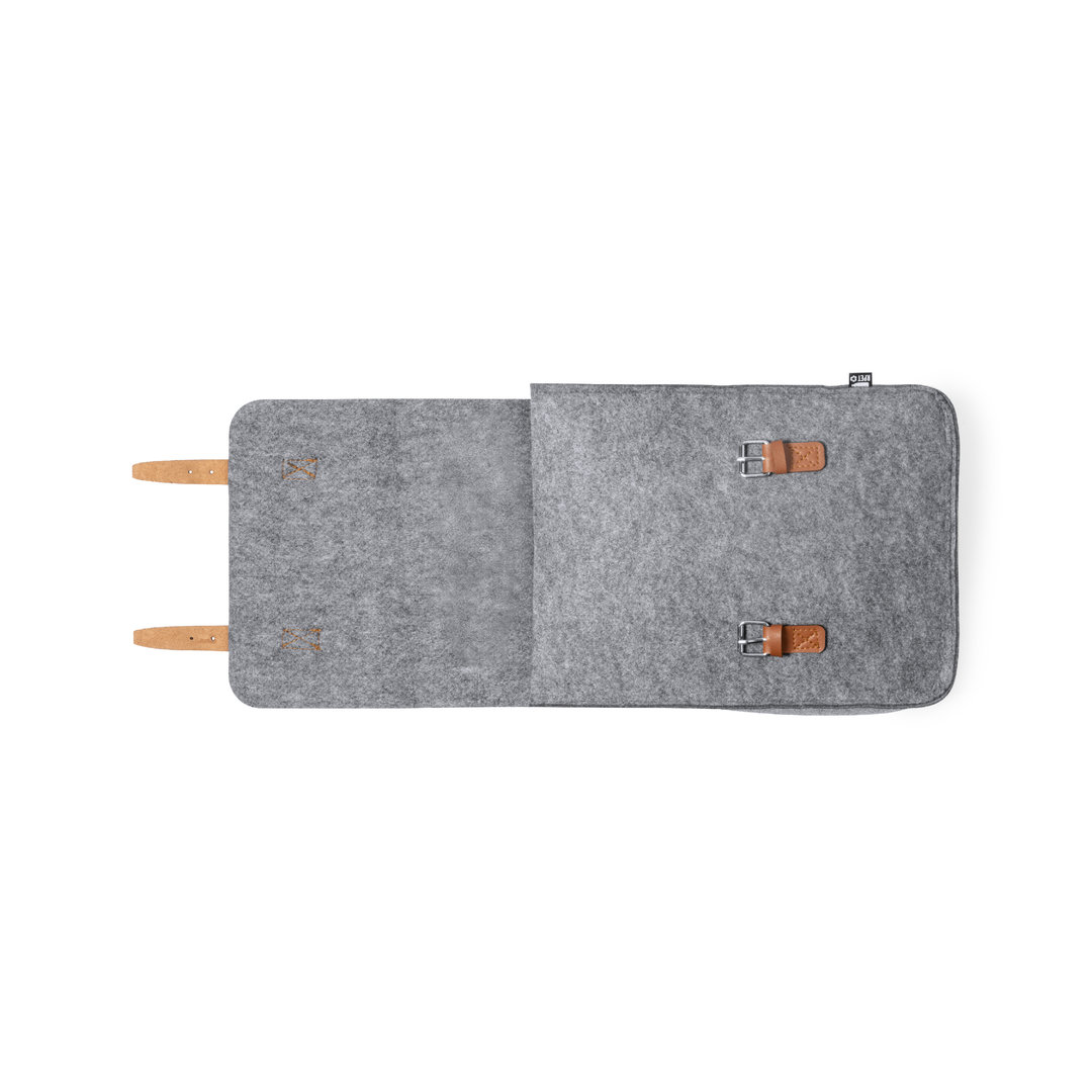 Design-Rucksack aus strapazierfähigem RPET-Filz, mit Reißverschluss, Tragegriff und Schulterriemen aus Kunstleder. Großes Hauptfach, Klappe mit verstellbaren Riemen und Metallschnallenverschluss. Mit verstellbaren Schulterriemen und RPET-Zeichen auf dem Außenetikett. RPET-Filz ist das Ergebnis der Kombination des Recyclingprozesses von Kunststoffen mit der jahrtausendealten Technik der Filzherstellung. Das Ergebnis ist ein Öko-Trendmaterial, das nicht nur recycelt, sondern auch wiederverwertbar ist.