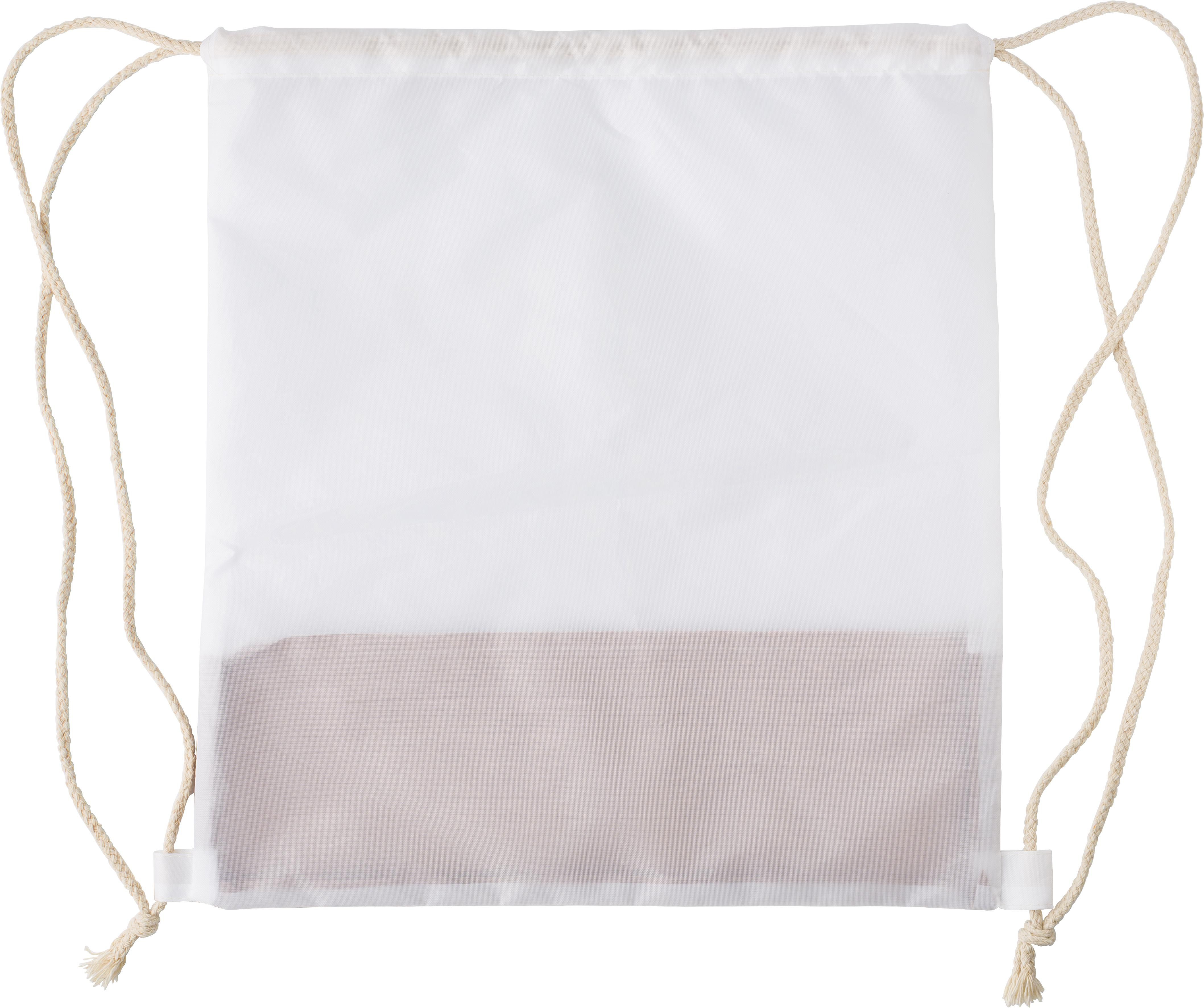 Rucksack aus rPET und Kordelzug aus Kork und Kordelzug aus Baumwolle.
