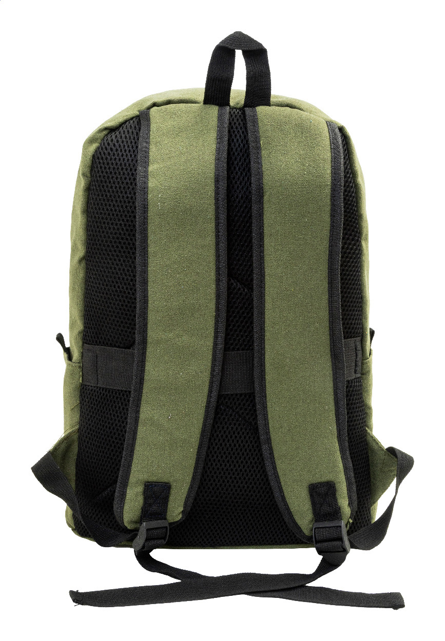 Rucksack aus recyceltem Canvas mit Reißverschluss-Hauptfach, gepolstertem Laptopfach (15"), 2 vorderen Reißverschlusstaschen, Seitentaschen, Trolley-Gurt sowie gepolsterten Rücken- und Schultergurten. Hergestellt aus 70 % recycelter Baumwolle und 30 % RPET-Polyester. Mit Label recycelte Baumwolle.