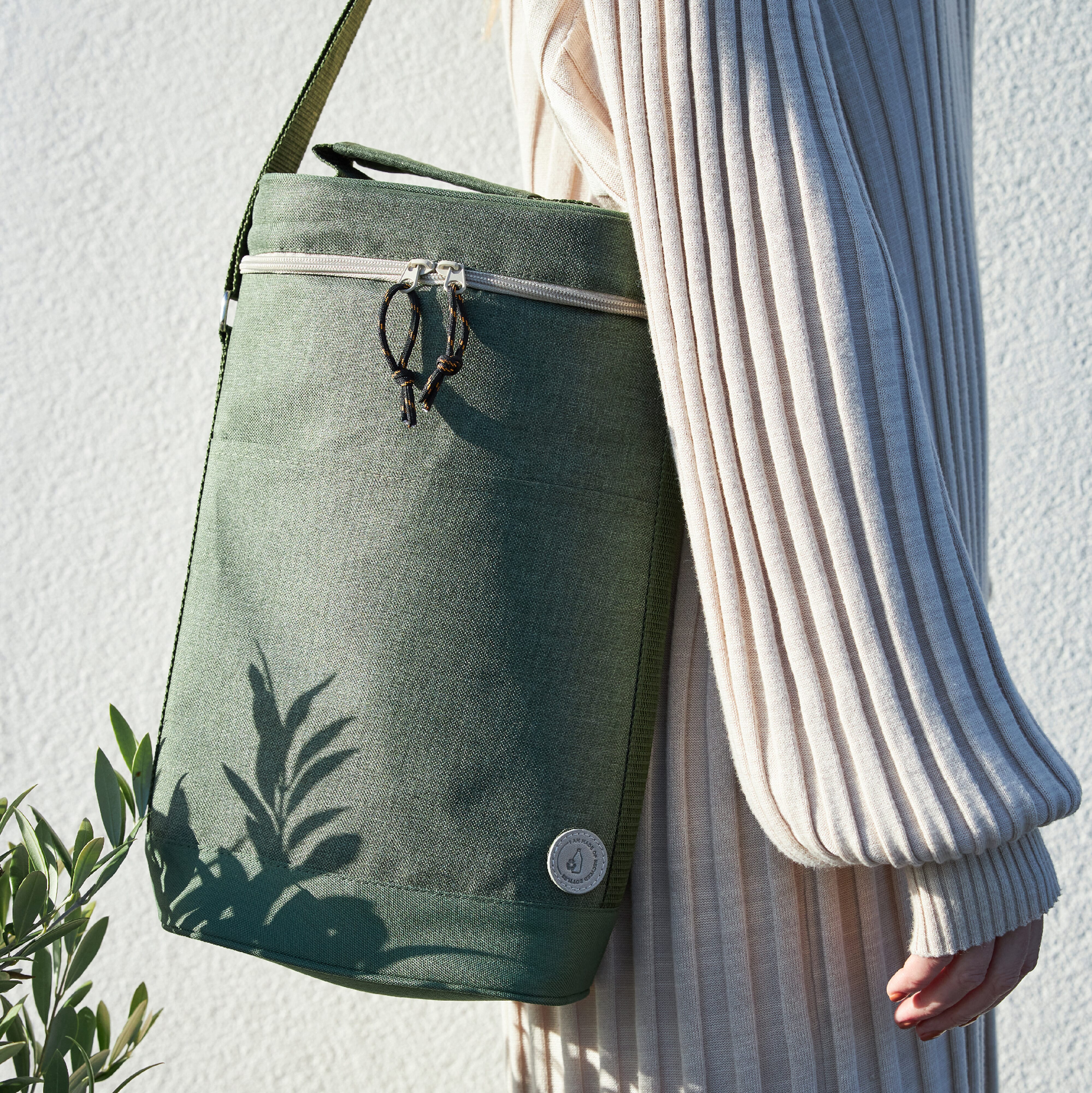 Praktische und sportliche Kühltasche aus grünem rPET-Material. Stilvolle Details in Beige und Schwarz. Ein Modell, das z. B. für zwei Weinflaschen oder 1,5-Liter-PET-Flaschen verwendet werden kann. Sie hat sowohl einen Griff als auch einen verstellbaren Schultergurt.