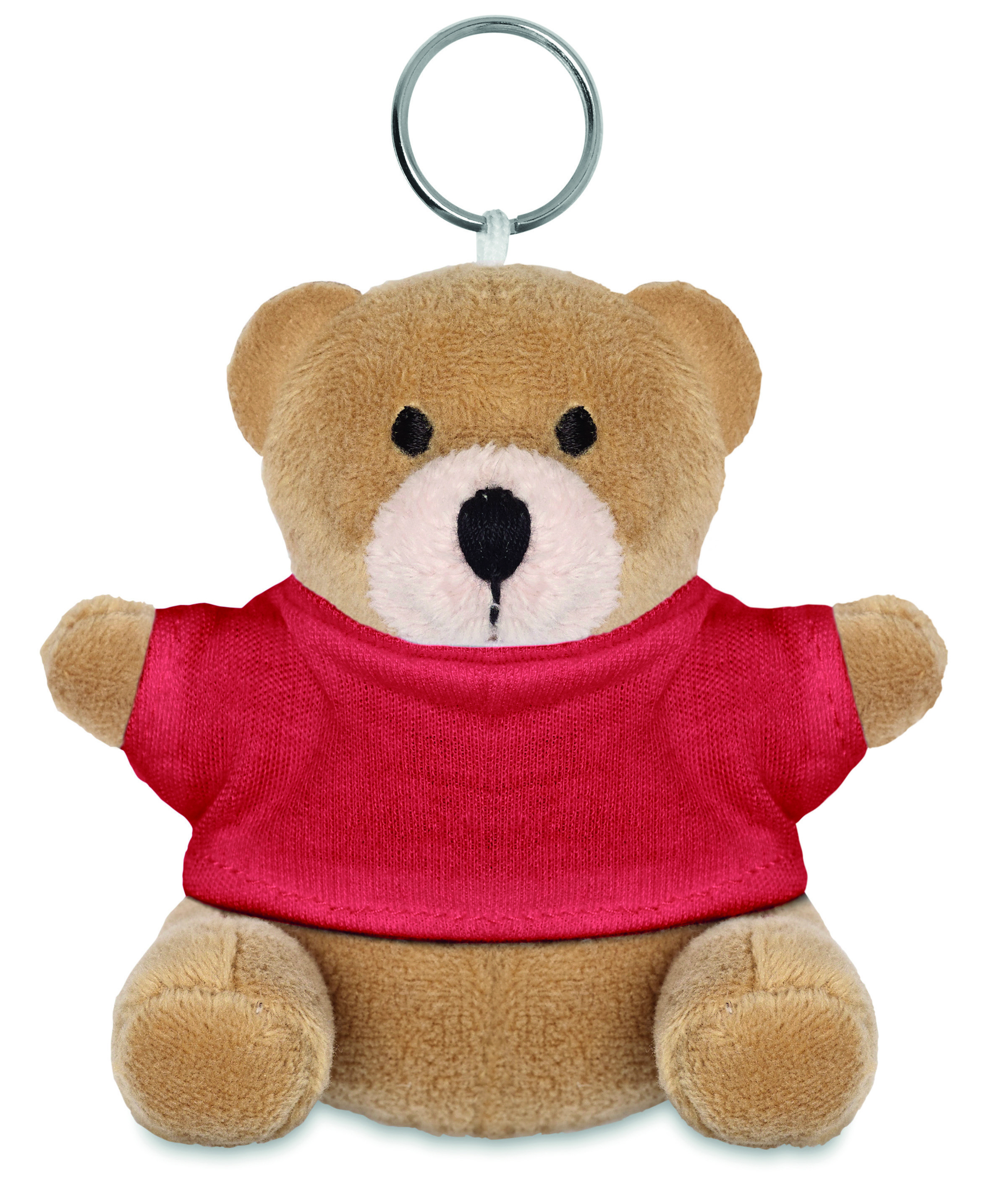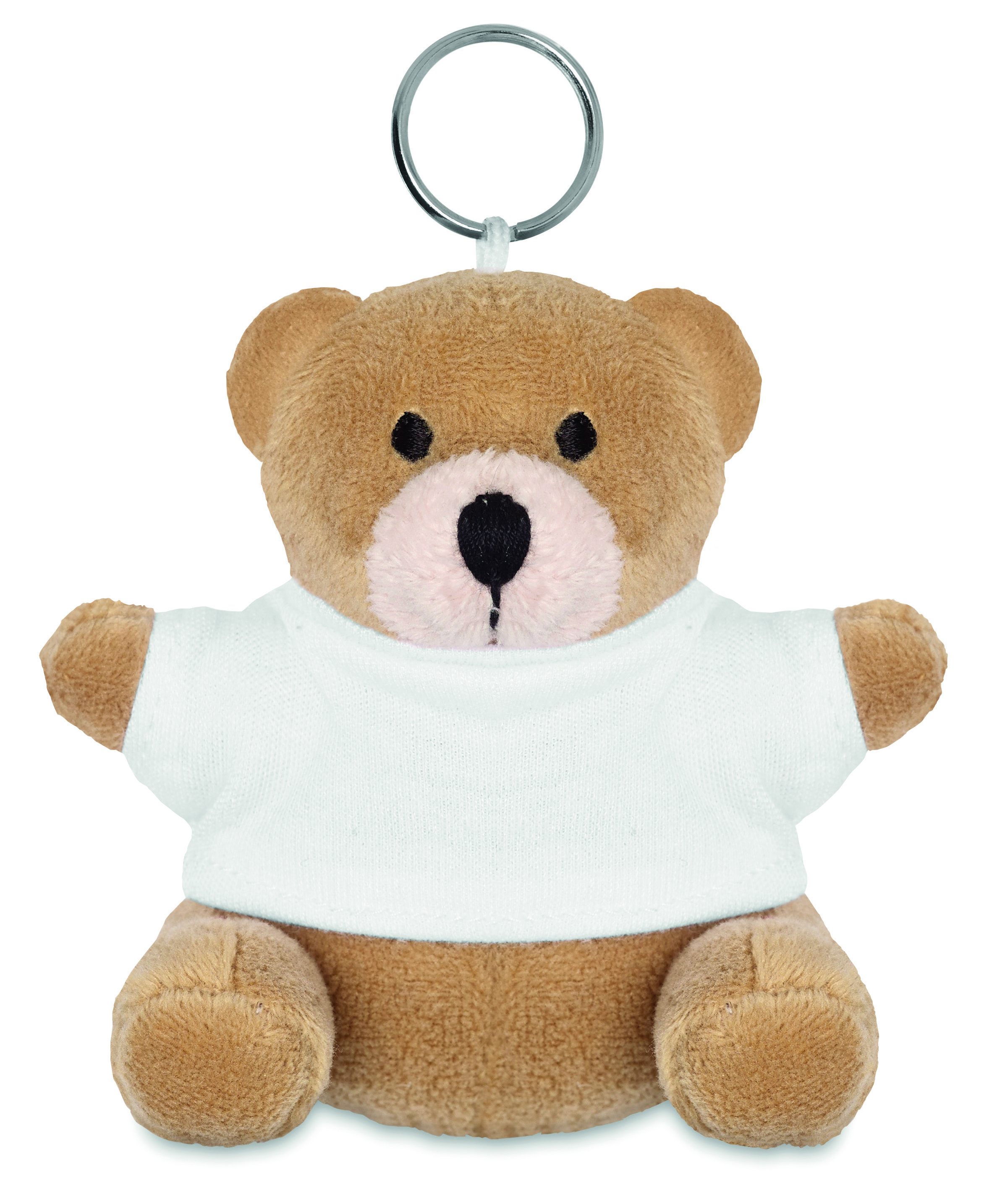 Schlüsselring mit Teddy-Bär. Der Bär trägt ein T-Shirt aus 100% Baumwolle. Ideal zum Veredeln.