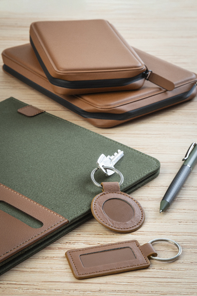 Rechteckiger Schlüsselanhänger aus recyceltem PU-Leder mit Metallring und Logoplatte aus Edelstahl mit gummierter Oberfläche. Mit Spezialbeschichtung für Spiegelgravur.