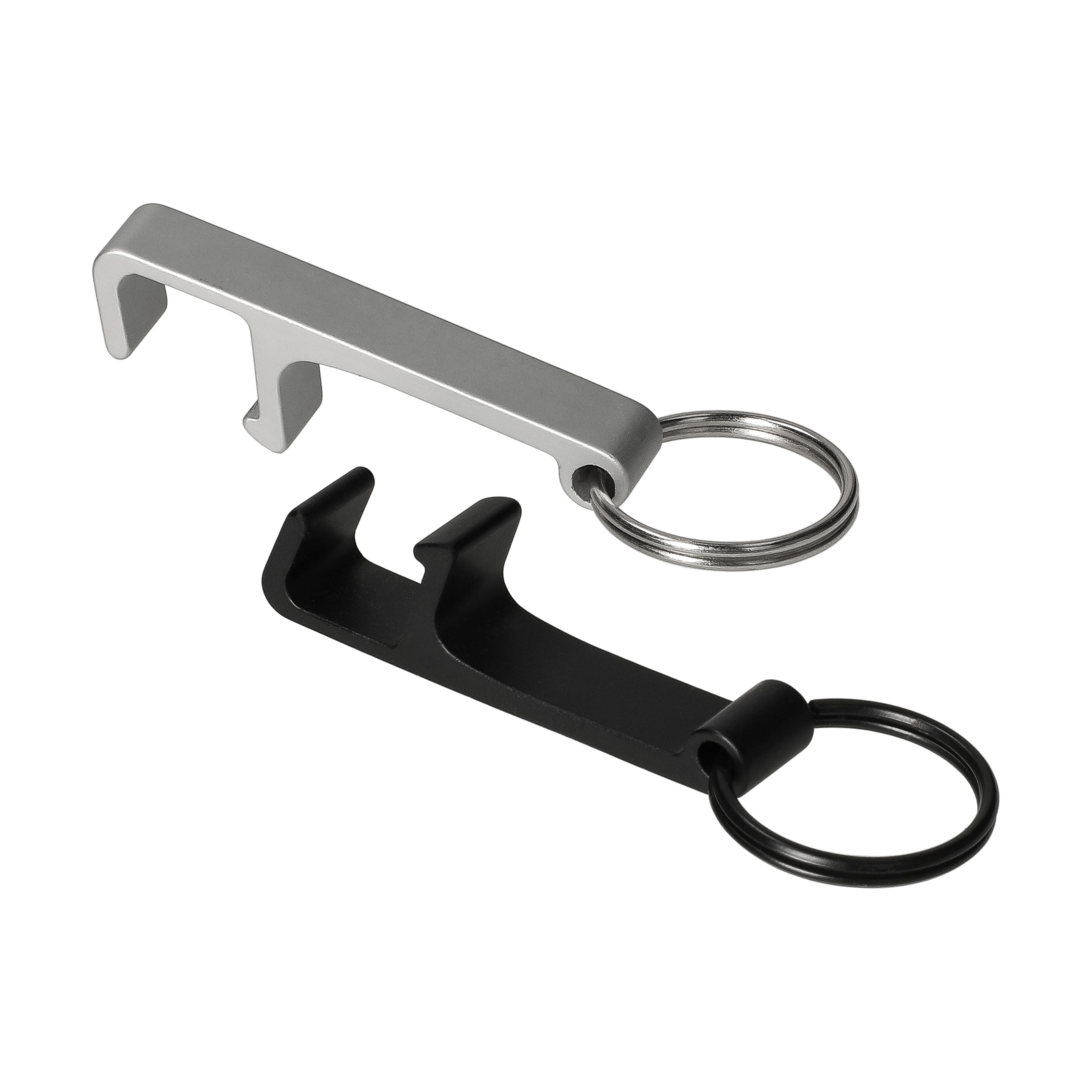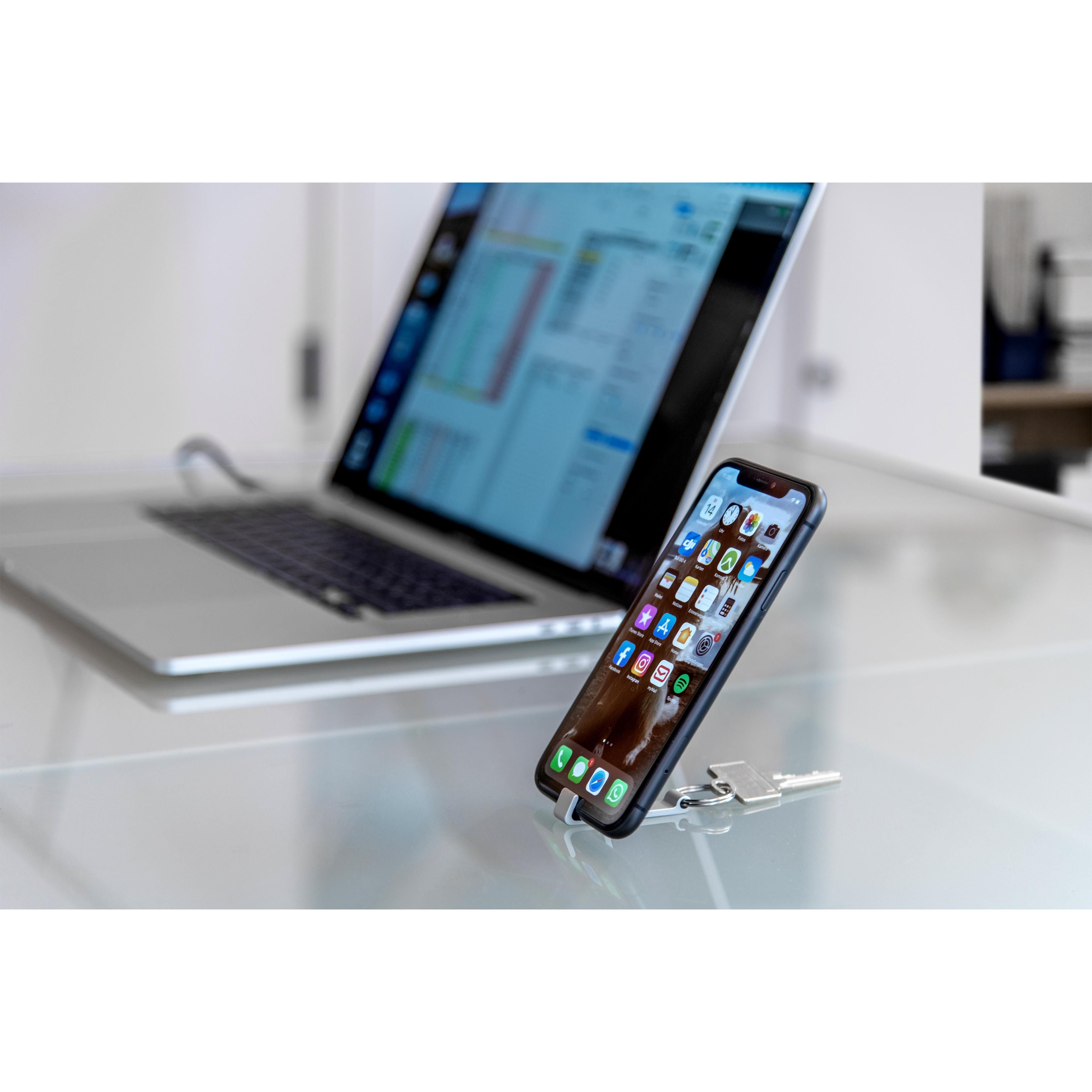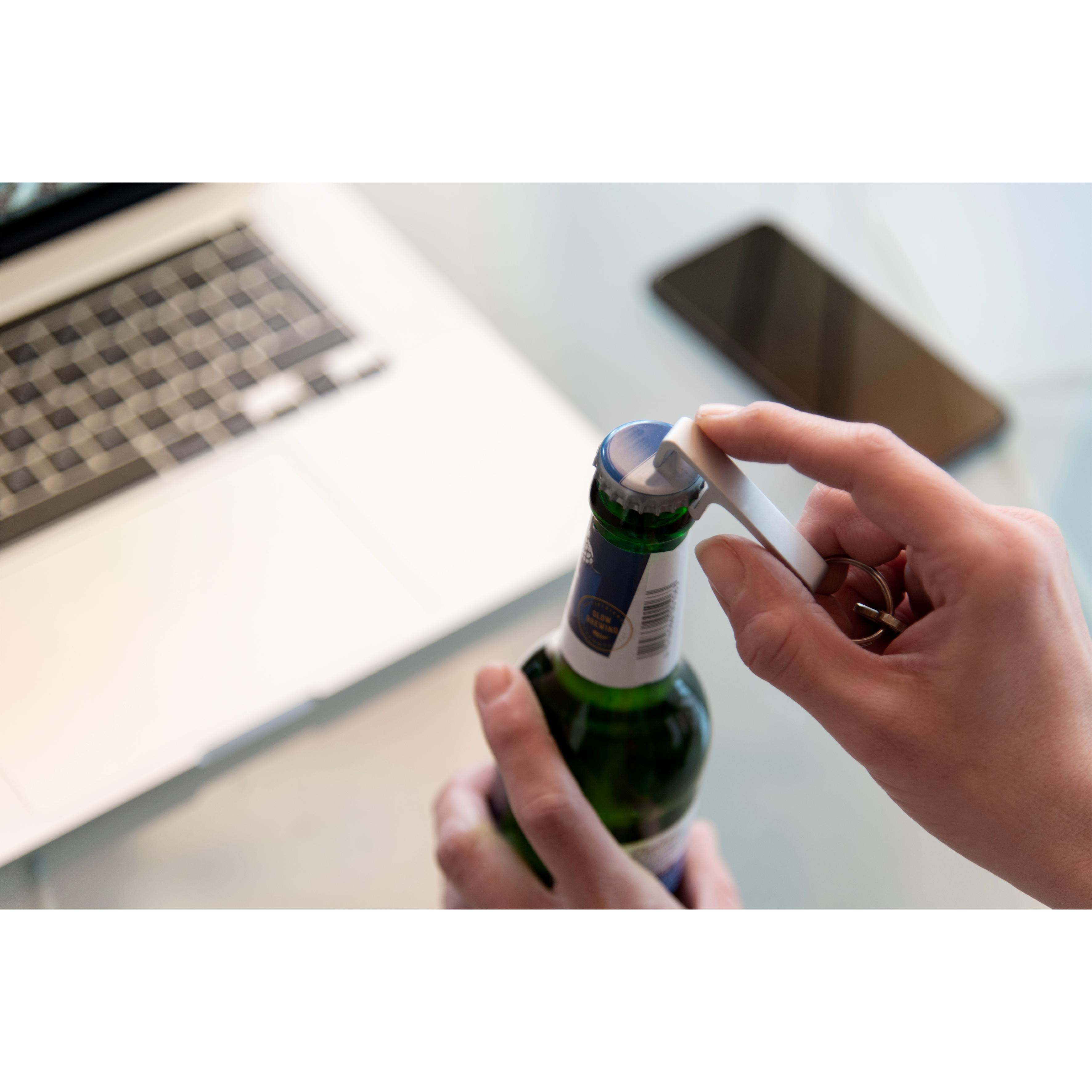 2 in 1. Der Schlüsselanhänger in smartem Design dient sowohl als Flaschenöffner, als auch als Smartphone-Halterung.
