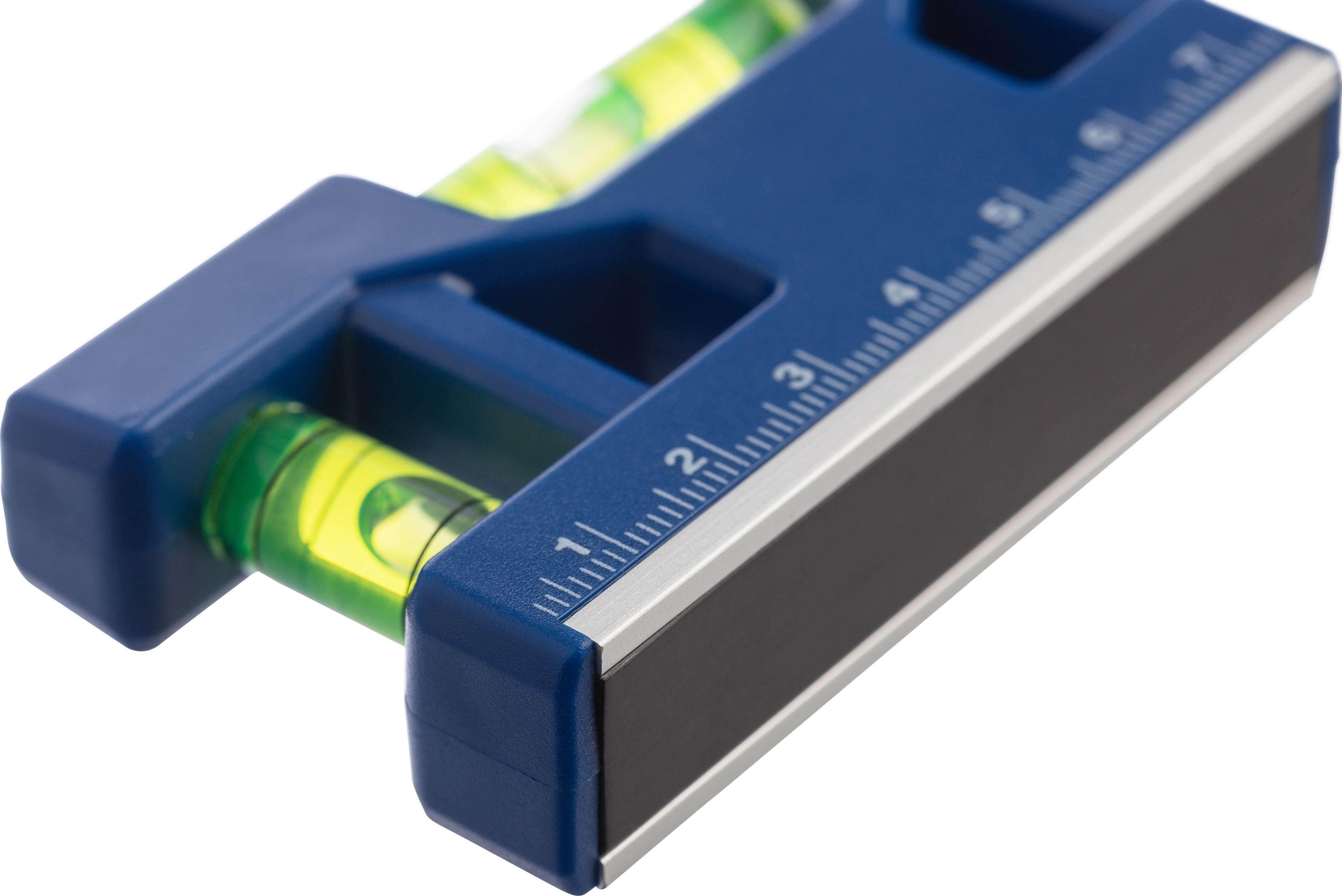 Schlüsselanhänger aus recyceltem ABS mit Magnet-Wasserwaage und Größenangabe auf der Vorderseite. Dank des Magnetstreifens an der Unterseite kann er an Metalloberflächen befestigt werden. Er verfügt über einen Schlüsselring und ein recyceltes ABS-Logo auf der Rückseite. Er ist einzeln in einem braunen Karton verpackt.