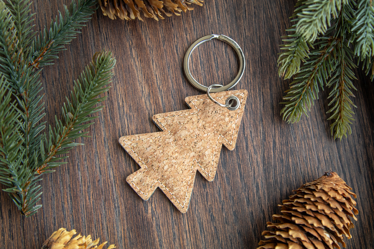 Schlüsselanhänger in Weihnachtsbaumform aus natürlichem Kork und Kunstleder, mit Metallring.