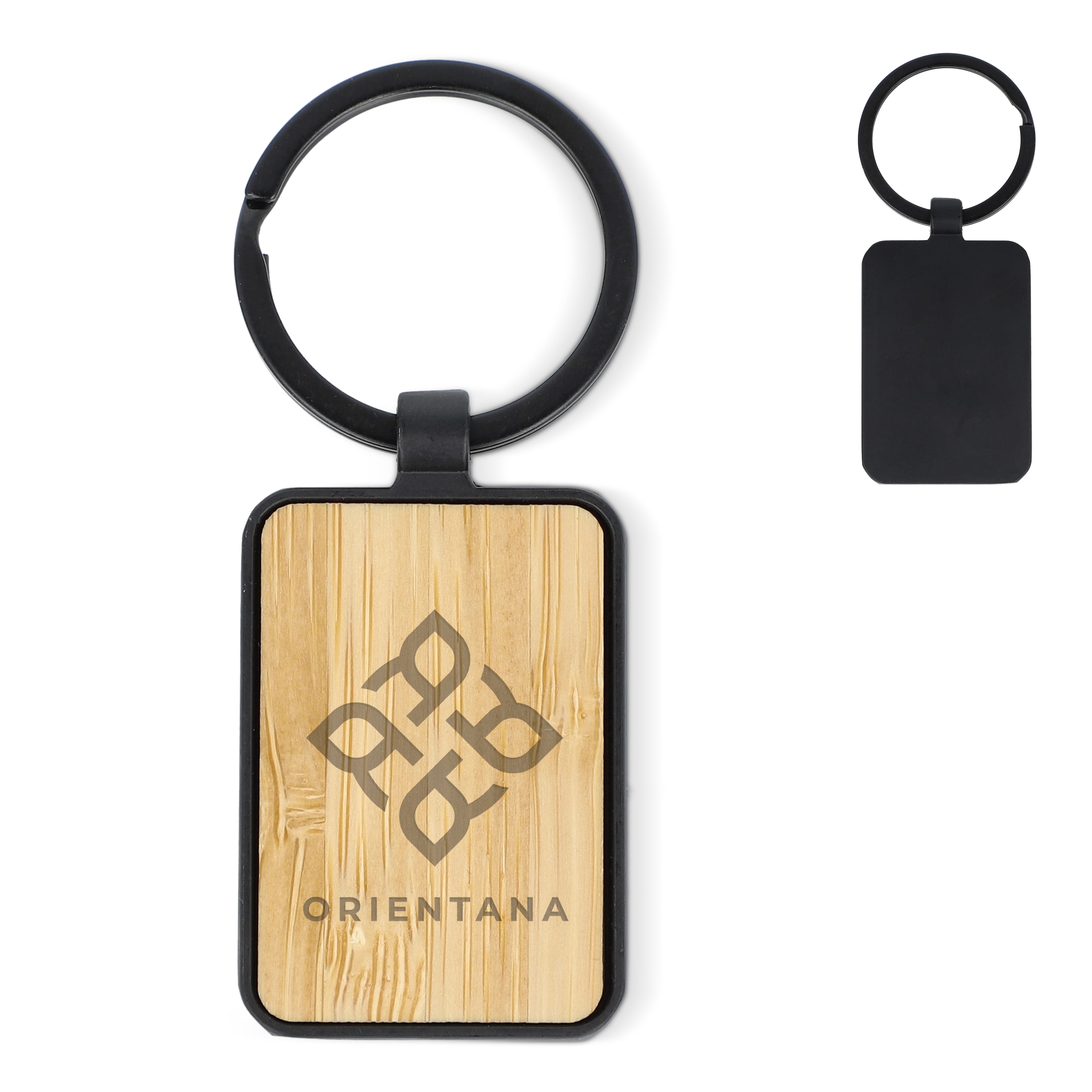 Schlüsselanhänger aus Bambus und Metall rechteckig mit individuellem Logo und Expresslieferung.