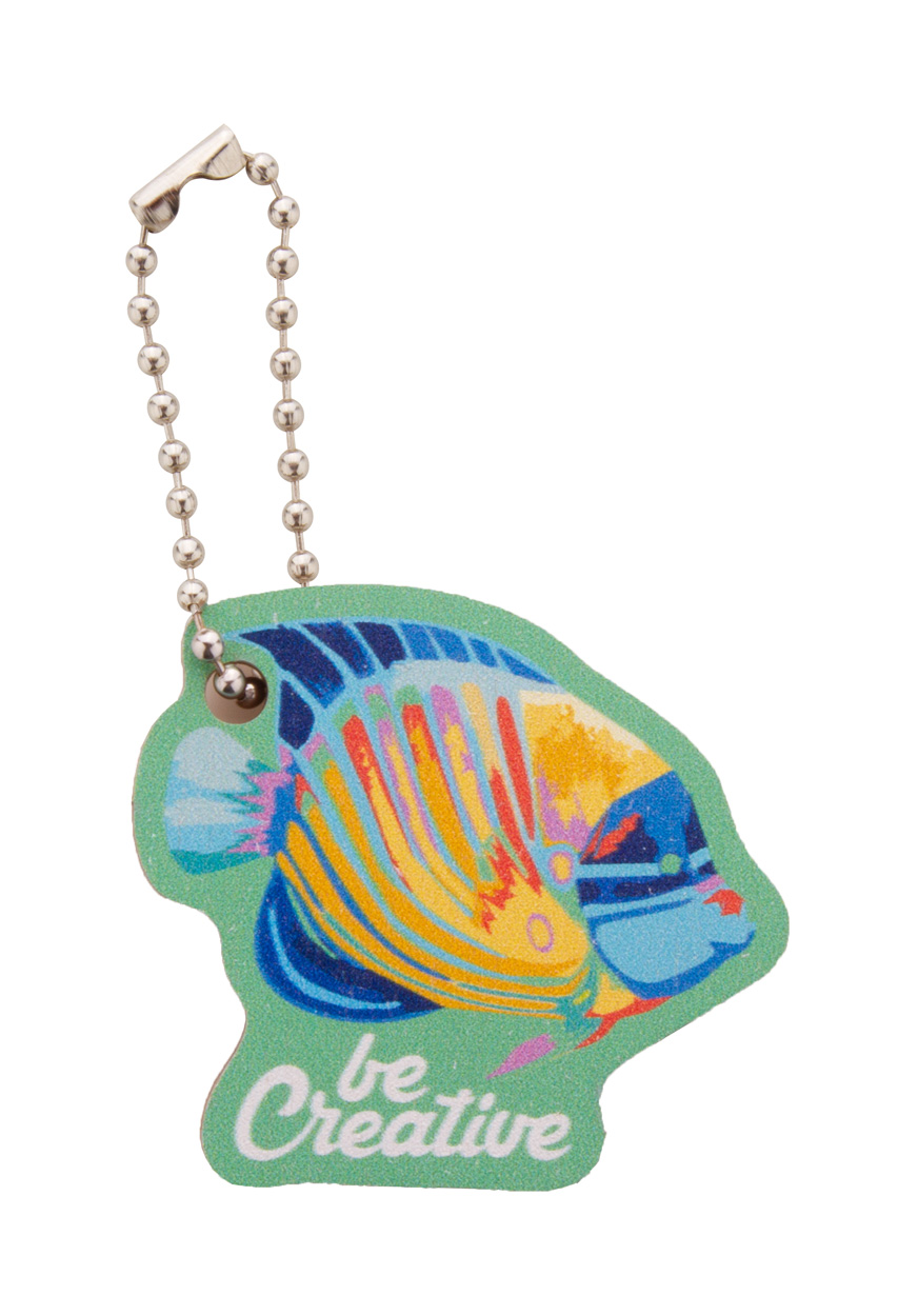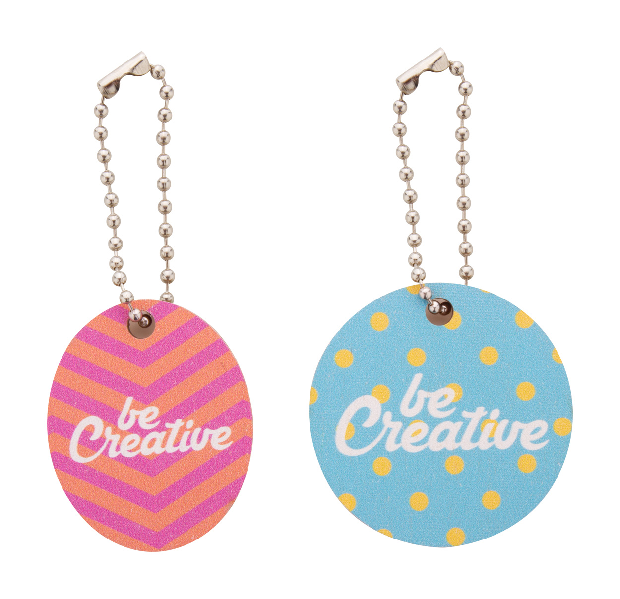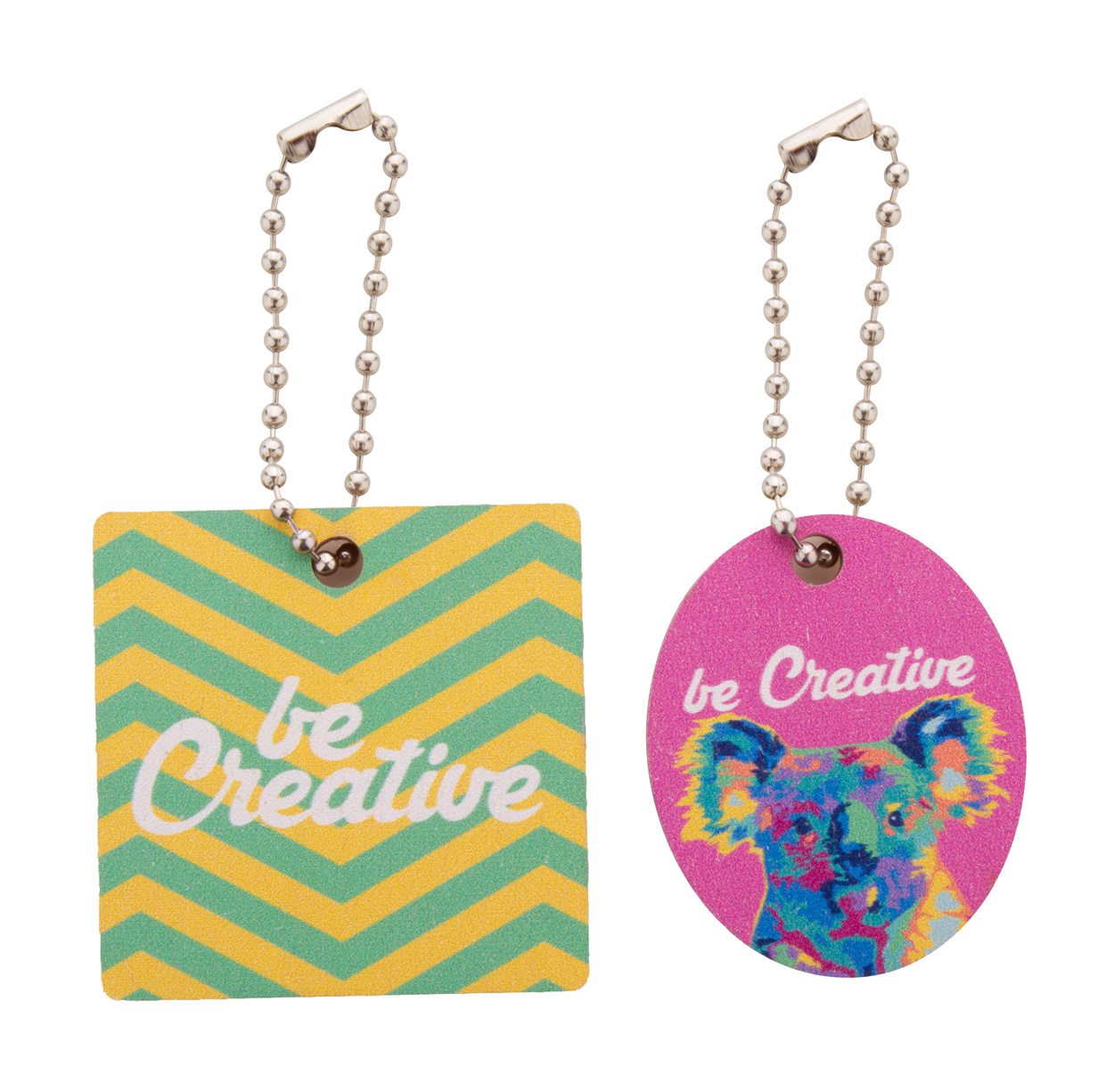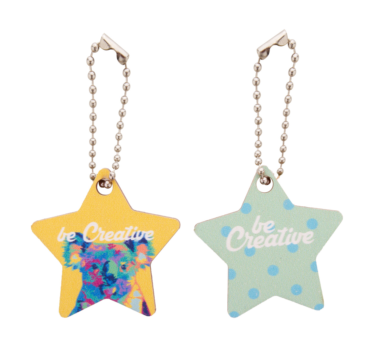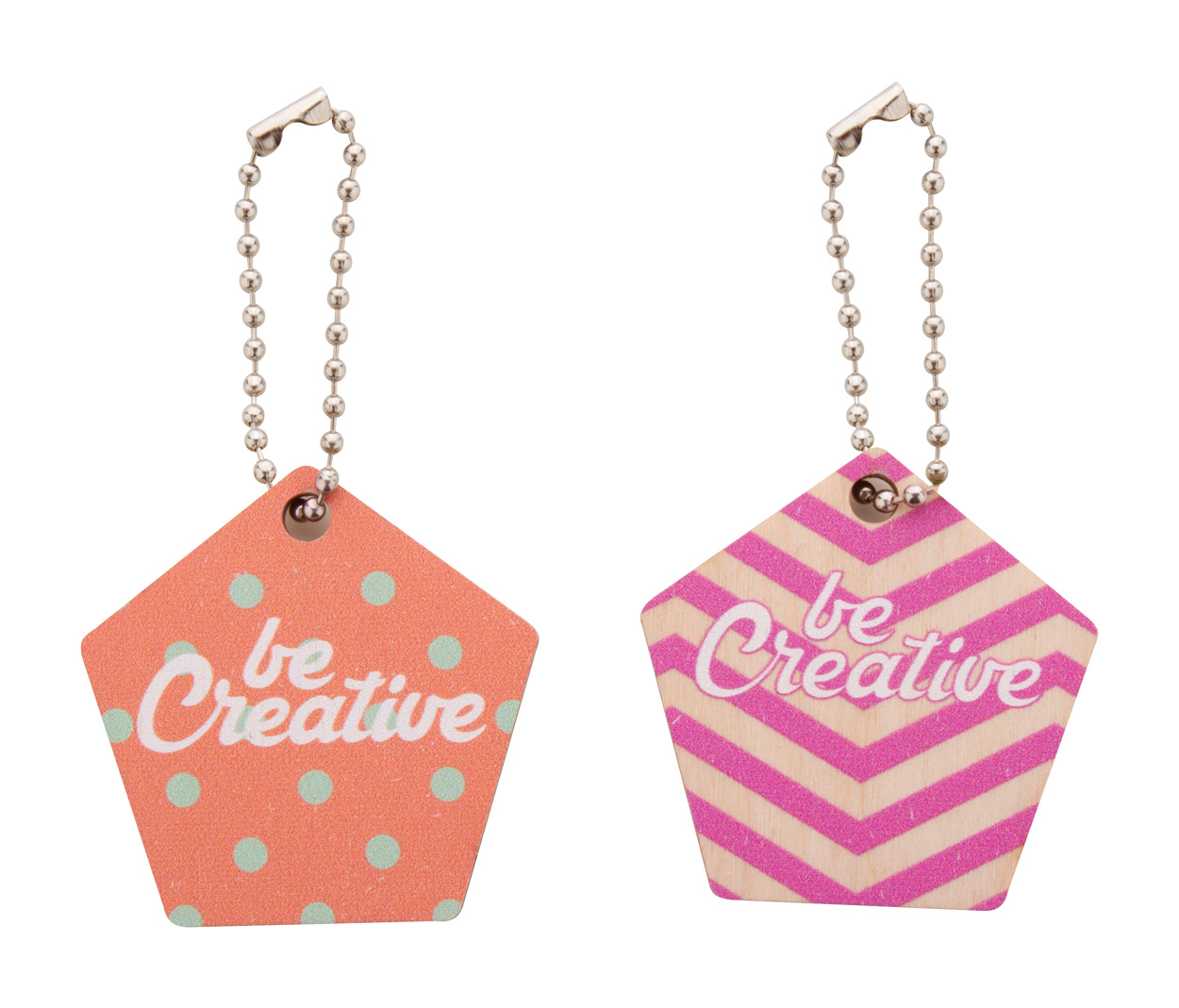 Schlüsselanhänger in Sonderform aus Birkensperrholz und mit Vollfarbdruck und Metallkette. Maximales Format: 45x45 mm. Preis inkl. UV LED-Druck auf einer Seite. Mindestmenge: 200 Stk.