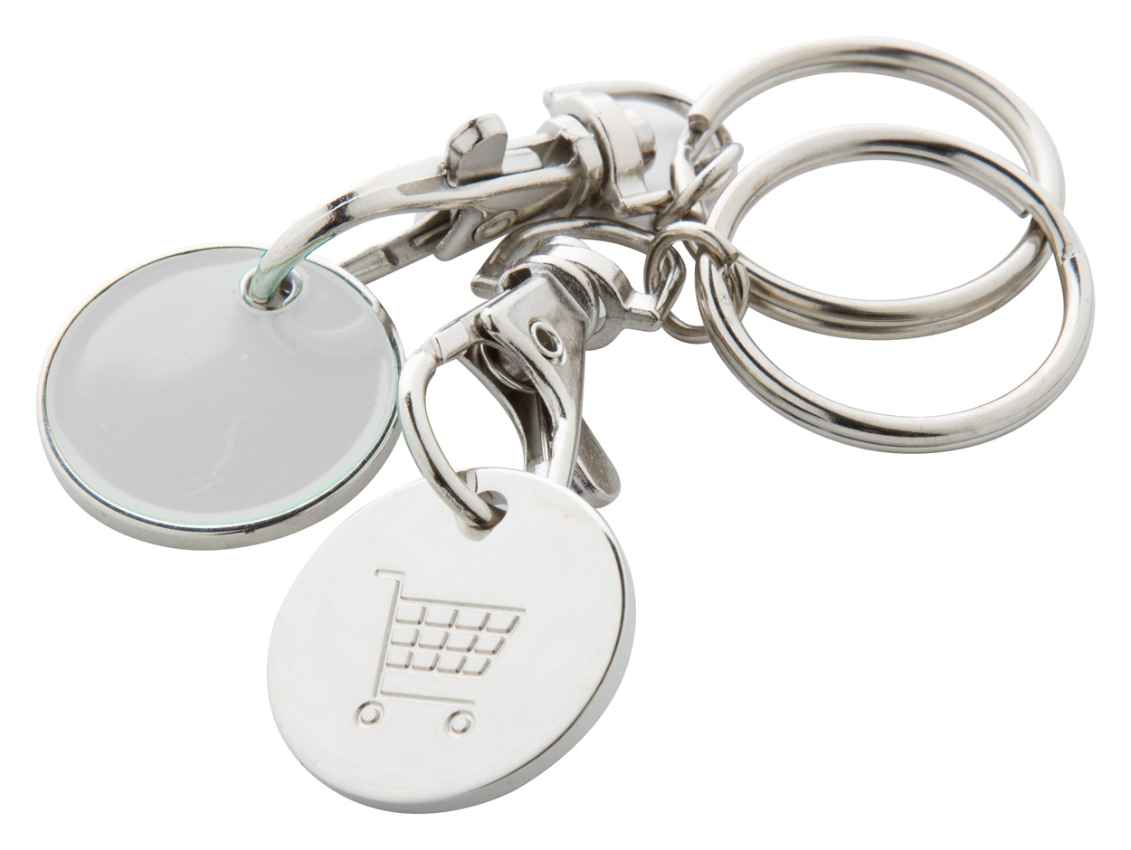 Metall-Schlüsselanhänger mit Einkaufswagen-Chip. Chip mit einer farbigen Seite und Einkaufswagen-Motiv auf der Rückseite. Chipgröße: ø23×1,7 mm.