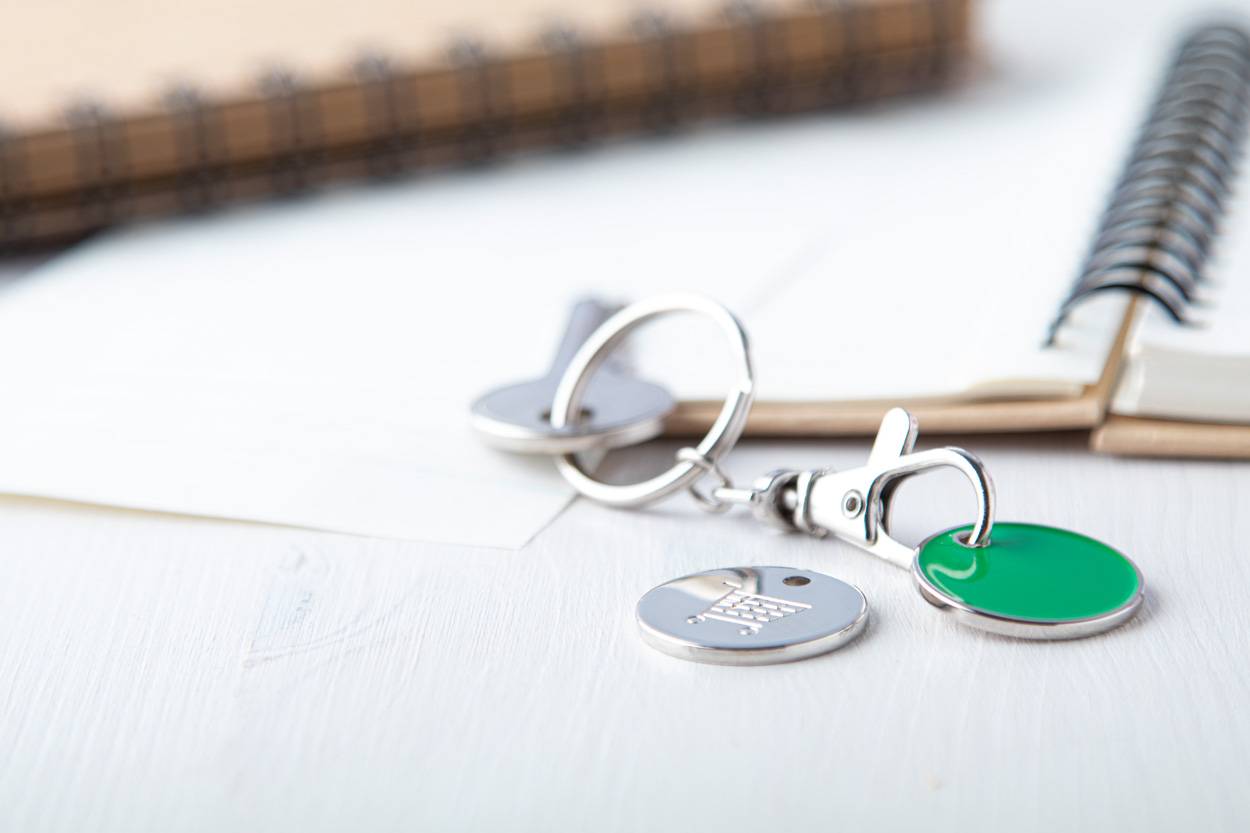 Metall-Schlüsselanhänger mit Einkaufswagen-Chip. Chip mit einer farbigen Seite und Einkaufswagen-Motiv auf der Rückseite. Chipgröße: ø23×1,7 mm.
