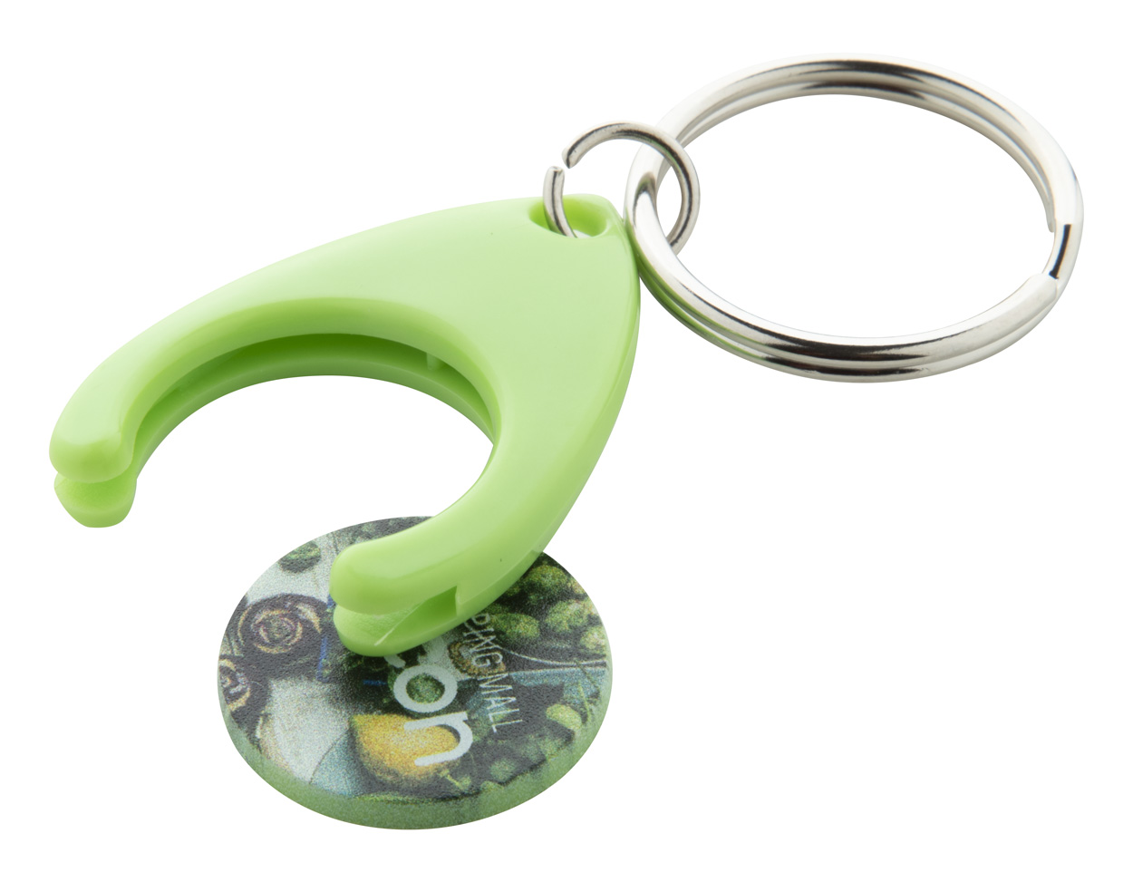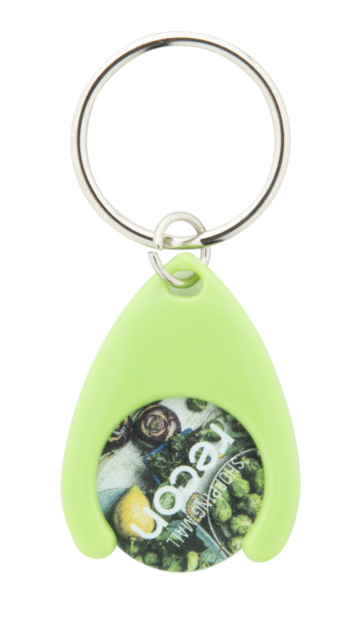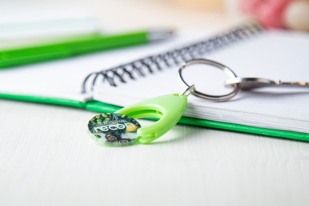 Schlüsselanhänger mit Einkaufswagen-Chip Nelly mit Firmenlogo für Promotions.