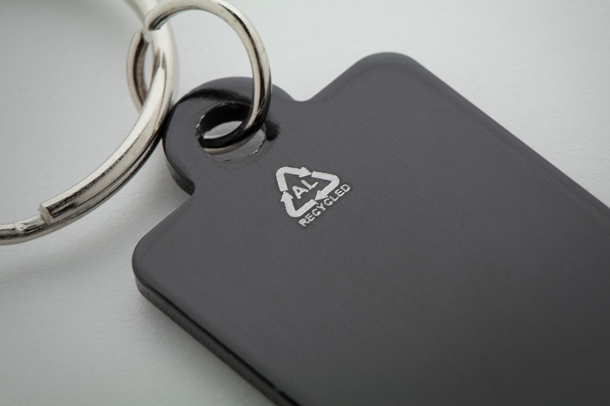 Schlüsselanhänger aus recyceltem Aluminium mit Einkaufswagenmünze.