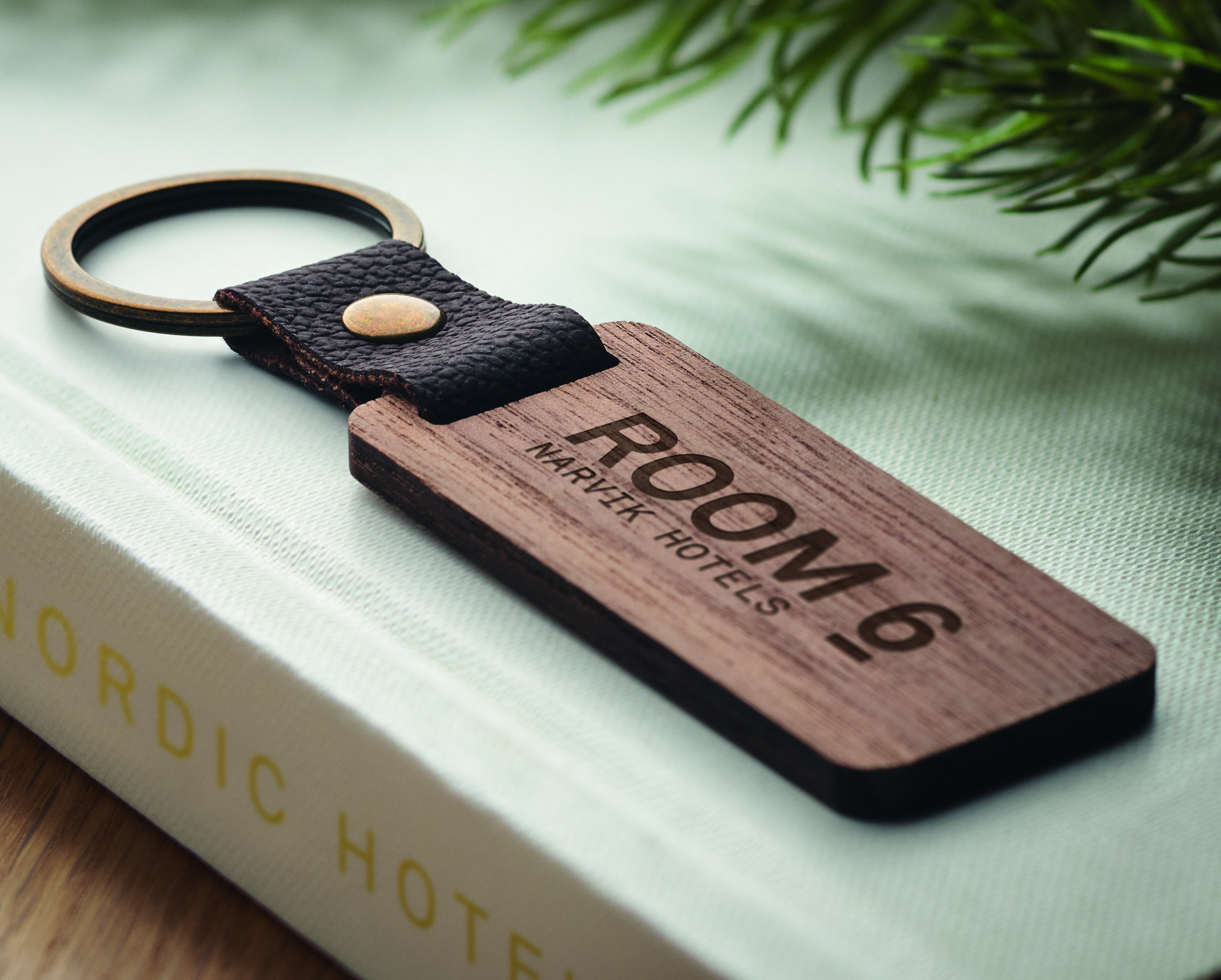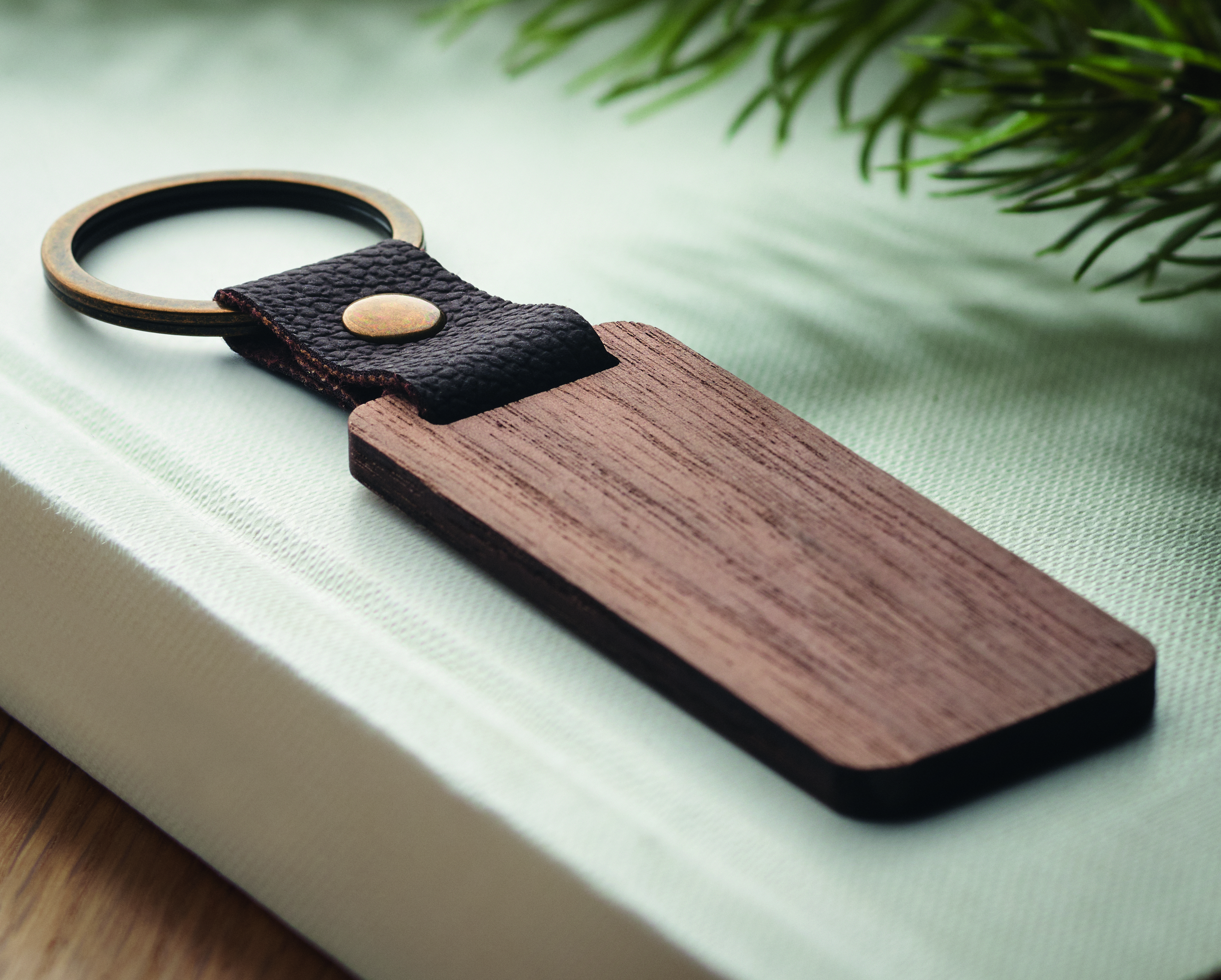 Schlüsselring Walnuss und PU NAWKEY als Werbeartikel für Kundenbindung.