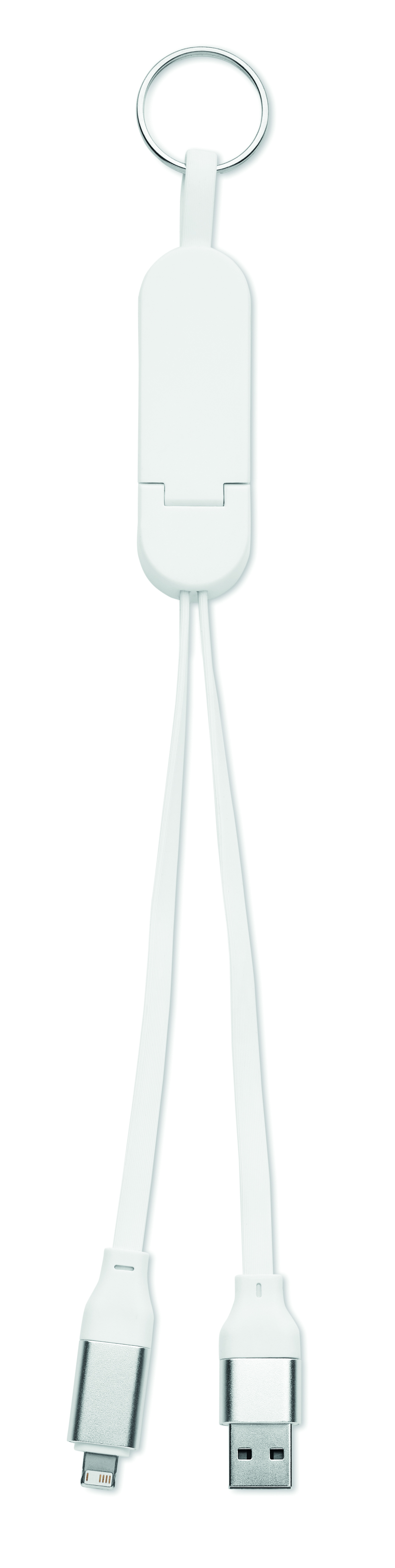 Schlüsselring mit Smartphone-Halter und 60W-Kabel. Gehäuse aus recyceltem ABS. Eingang: 2-in-1 Typ C und Typ A. Ausgang: Typ C und Mikro-B (2-in-1-Pin). Kabellänge: 26 cm.