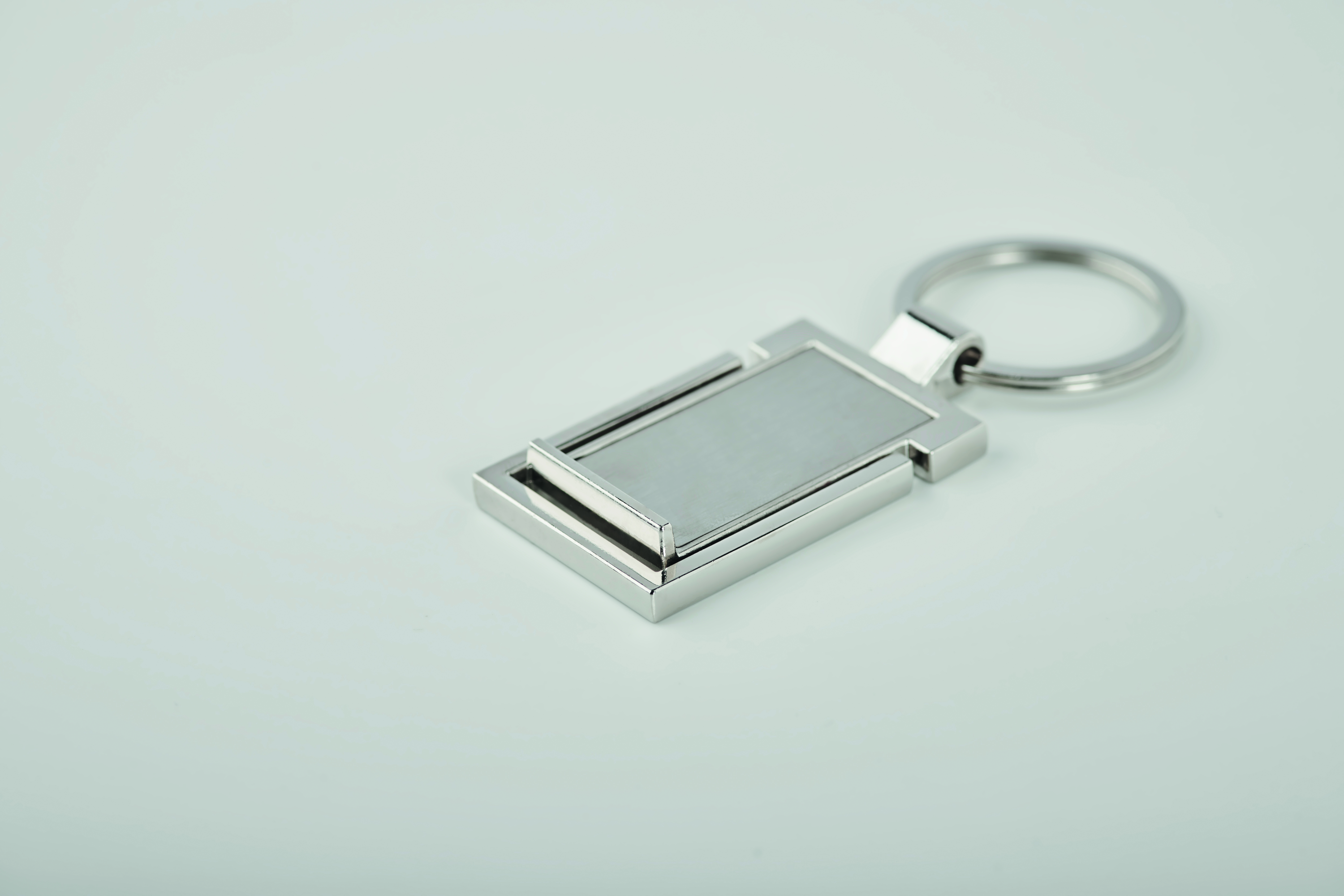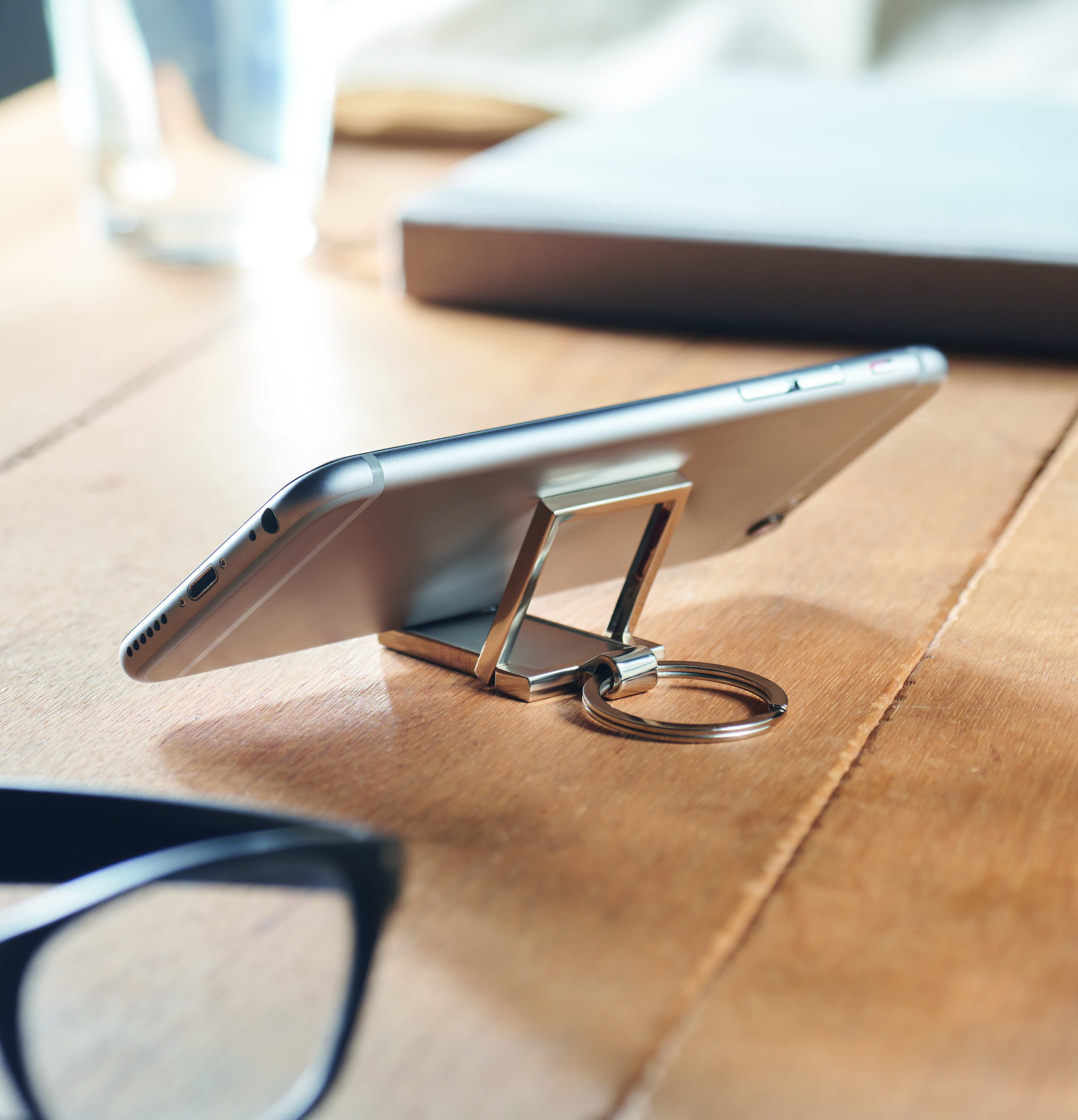 Schlüsselring mit Anhänger aus Metall mit Funktion eines Smartphone-Halters.