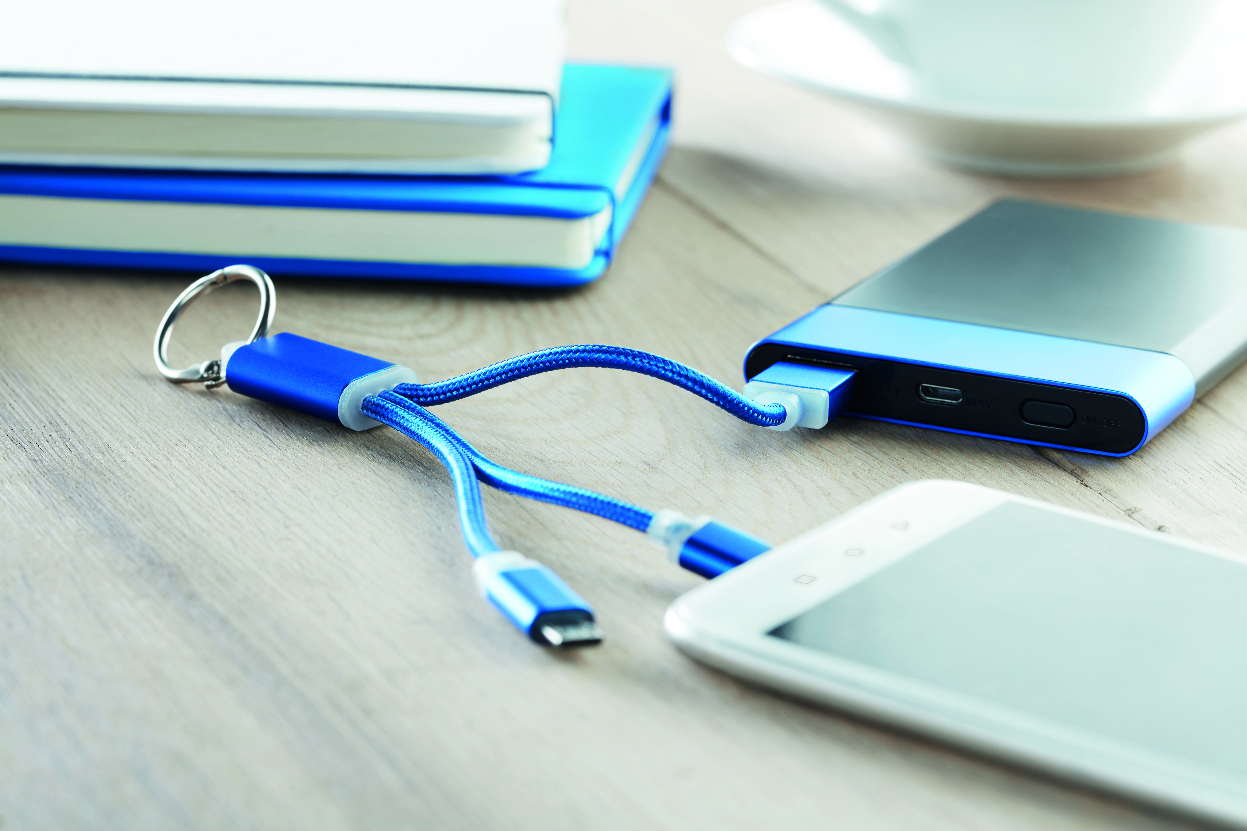 Schlüsselring mit Anhänger und Ladekabel USB-A, Mikro-B (2-in-1) und Typ-C.