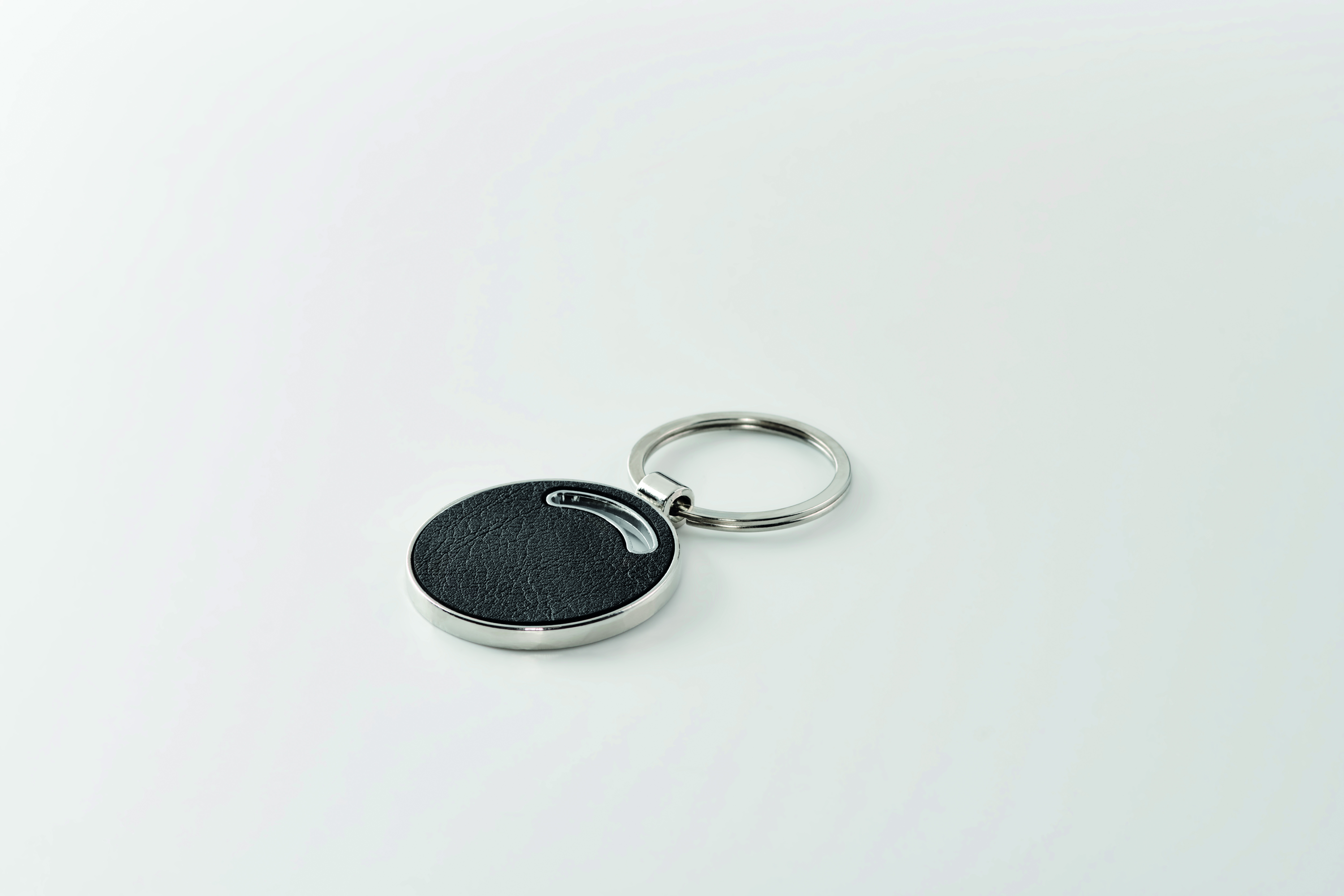 Schlüsselring mit rundem Anhänger. Metall mit Einlage aus recyceltem PU.