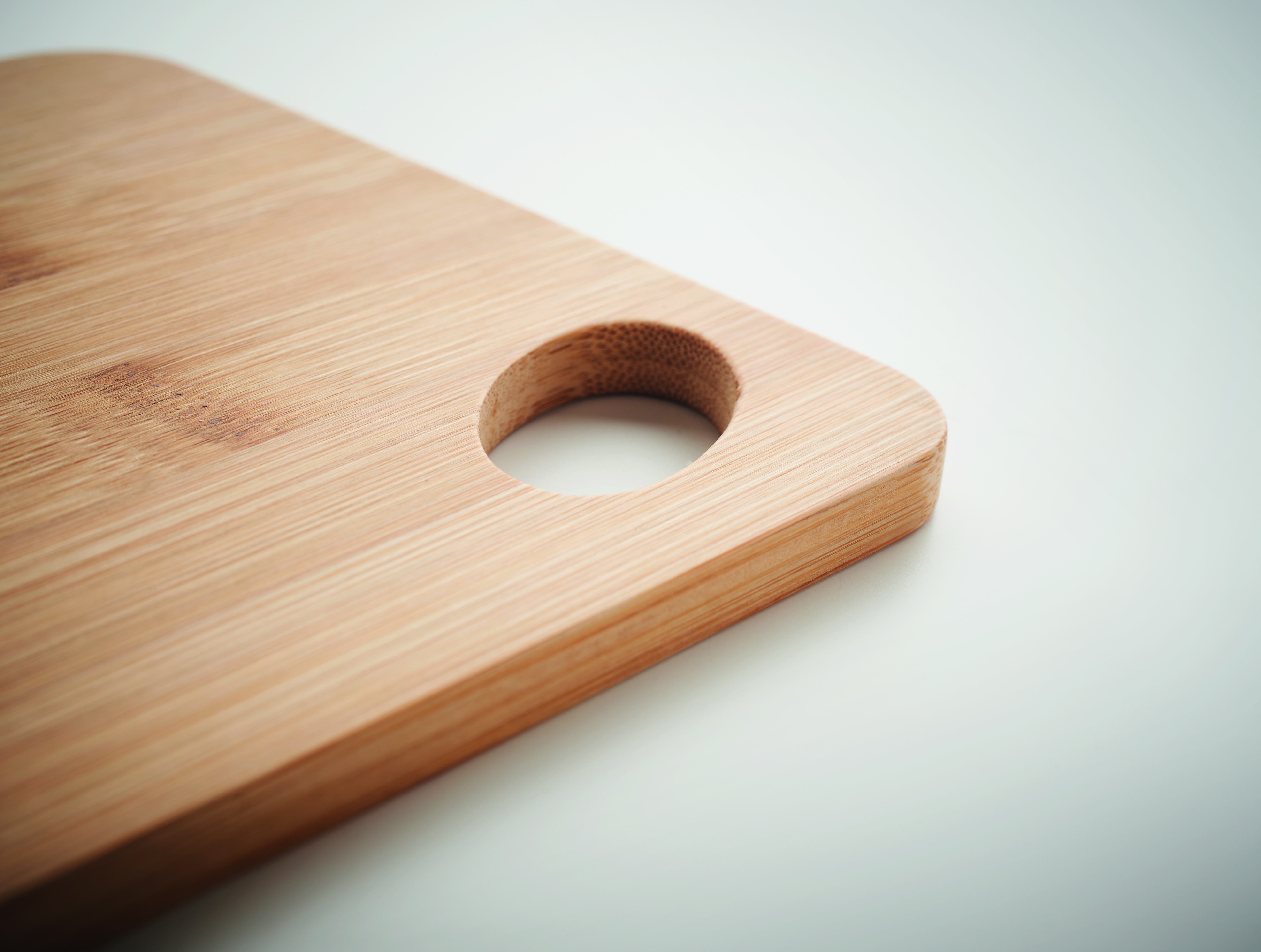 Schneidebrett aus Bambusholz mit Aussparung zum praktischen Aufhängen. Bambus ist ein natürliches Produkt, es kann daher zu leichten Abweichungen in Farbe, Dekor und Maßen kommen.