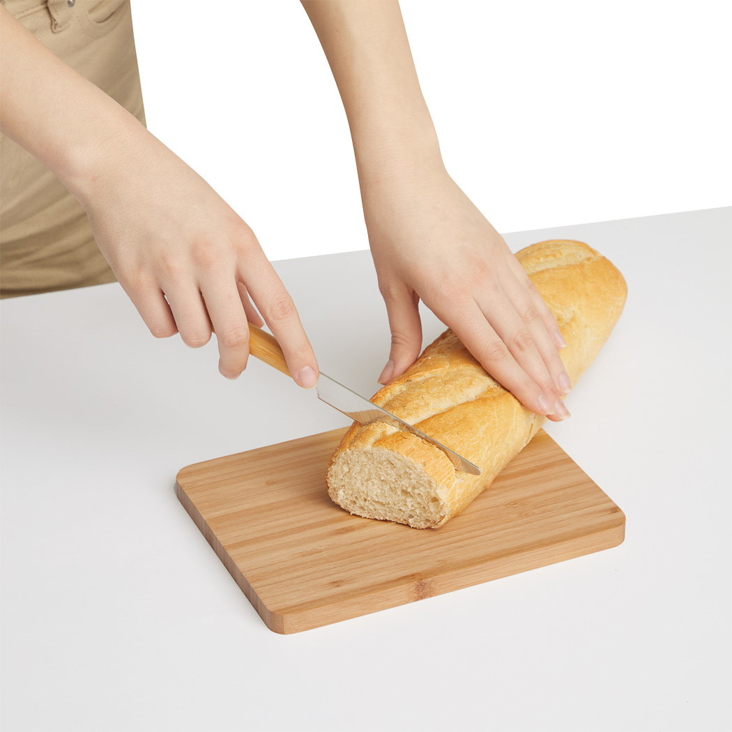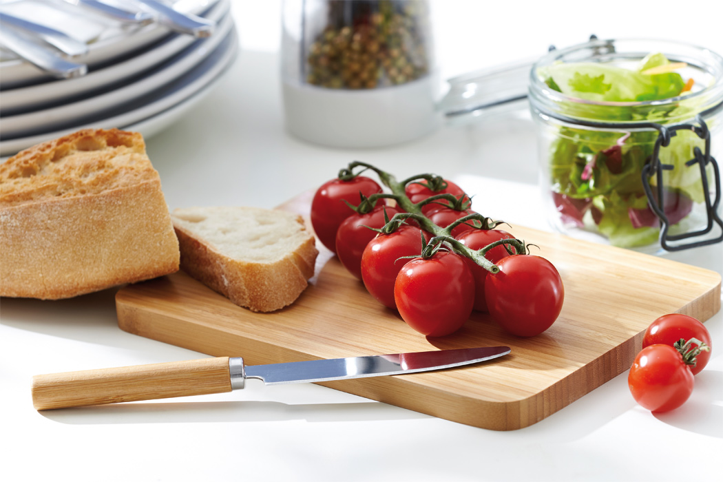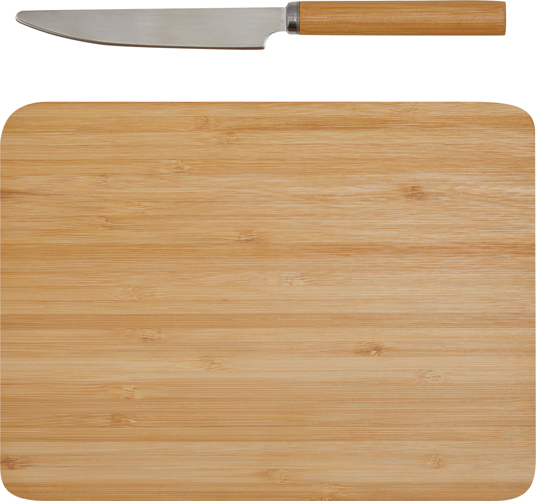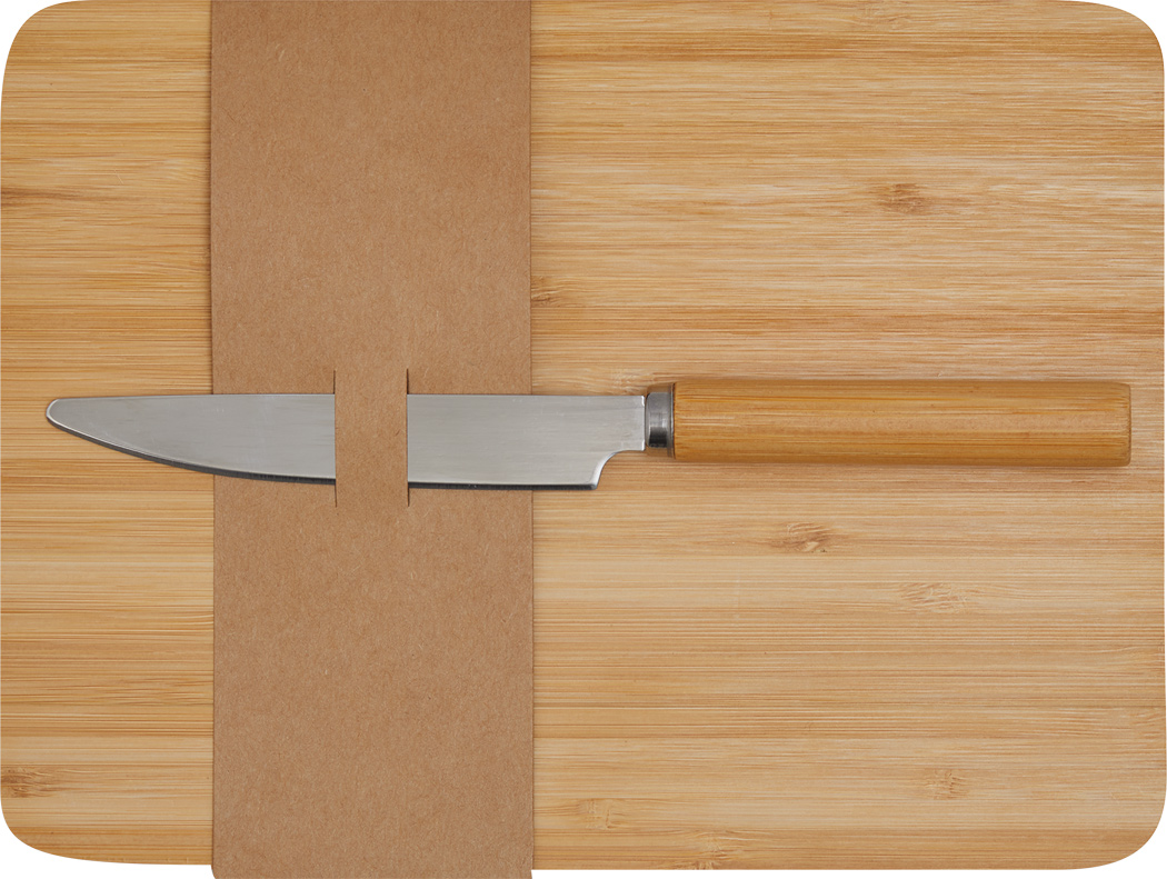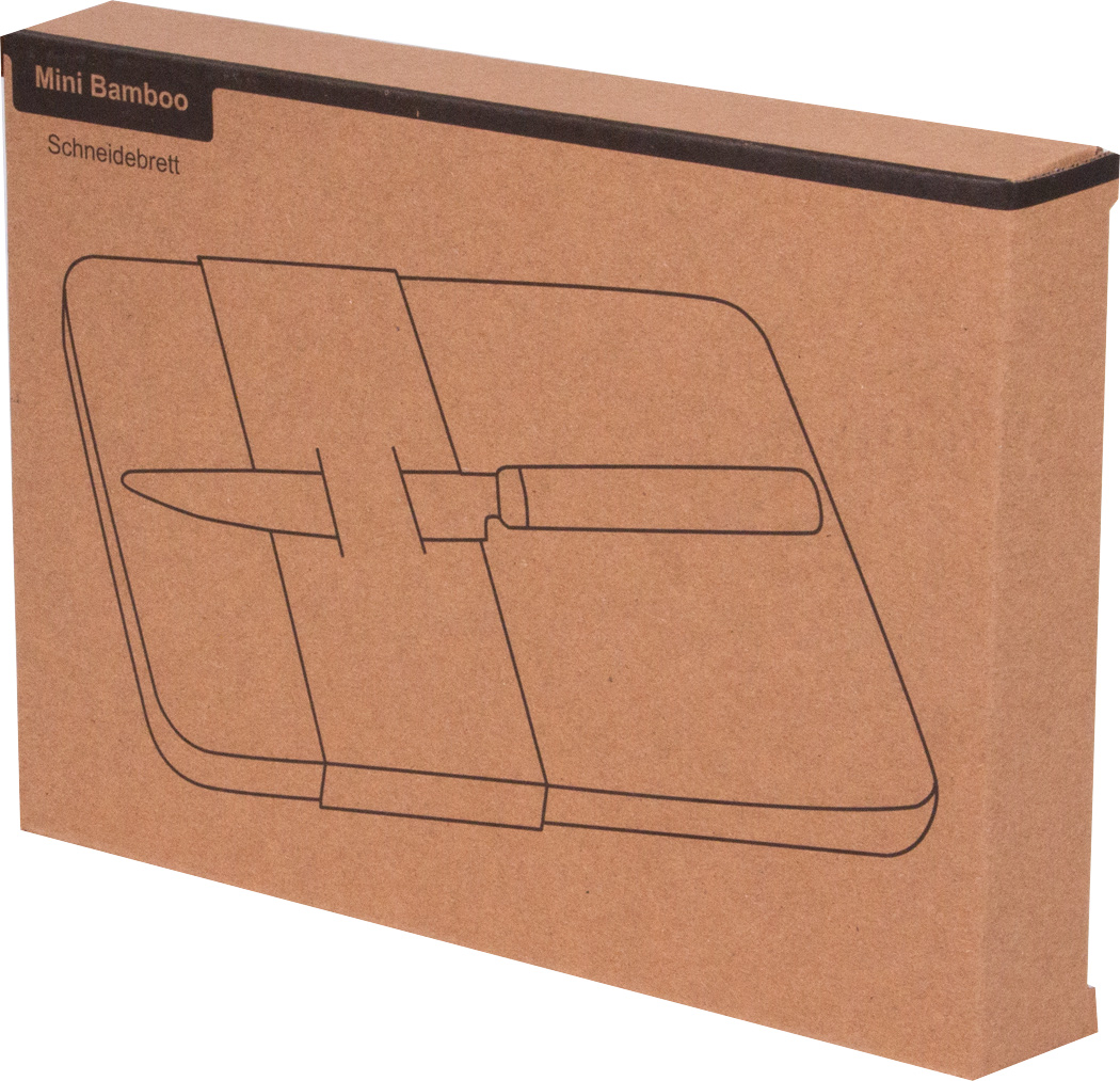 Schneidebrett MINI BAMBOO: aus Bambus, inkl. Messer mit Edelstahlklinge und Bambusgriff, Banderole aus Papier mit Einschub für das Messer, in Box