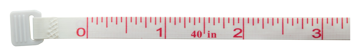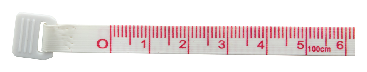 Schneidermaßband (1 m) aus Kunststoff mit Druckknopfverschluss. Skala in cm und Zoll.