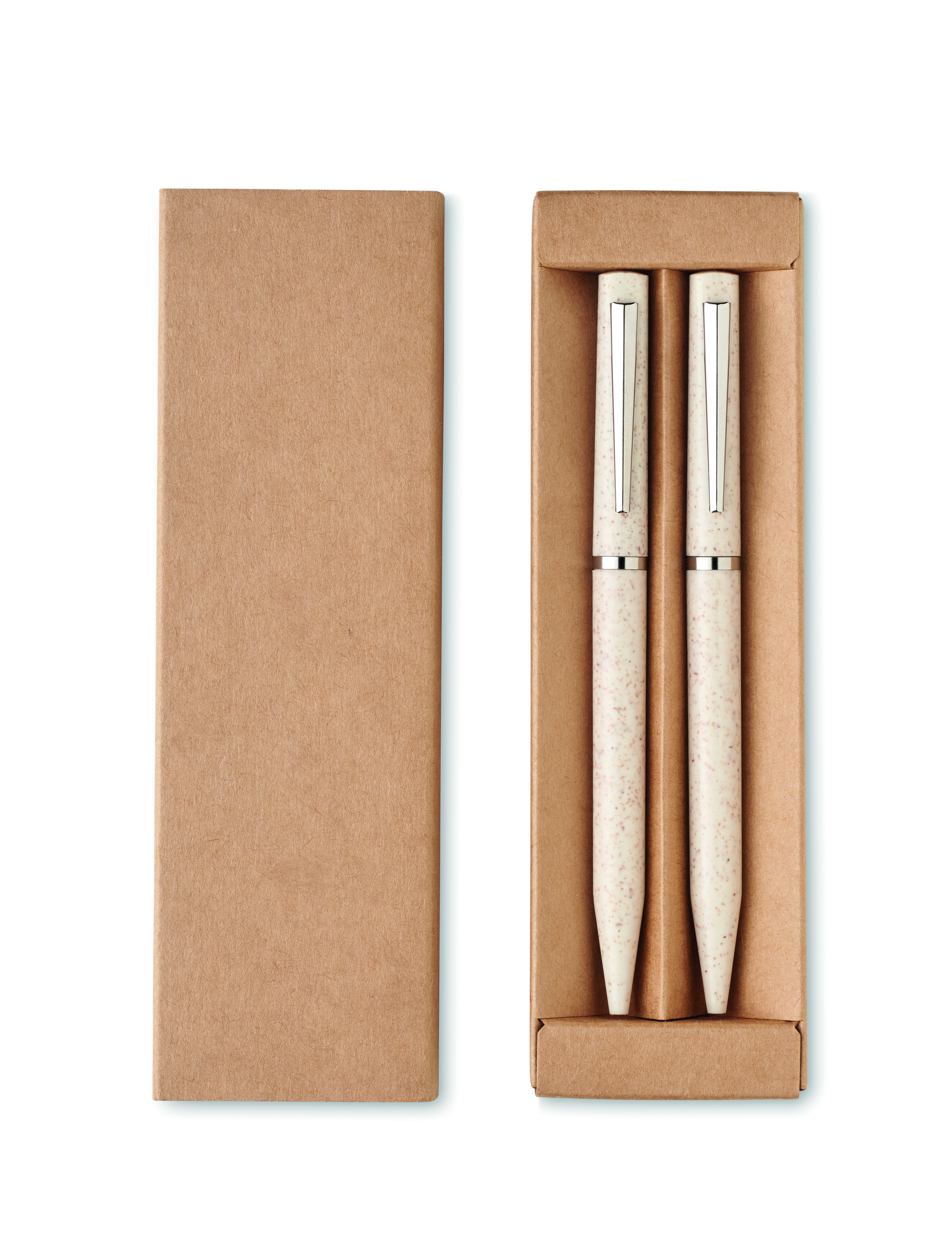 Schreibgeräte-Set mit 2 Drehkugelschreibern (1x blaue Tinte, 1x Graphitmiene). Gehäuse aus Weizenstroh / ABS. Lieferung in Schachtel aus recyceltem Papier. FSC®-certified | FSC MIX, P5.1, FSC-C213206