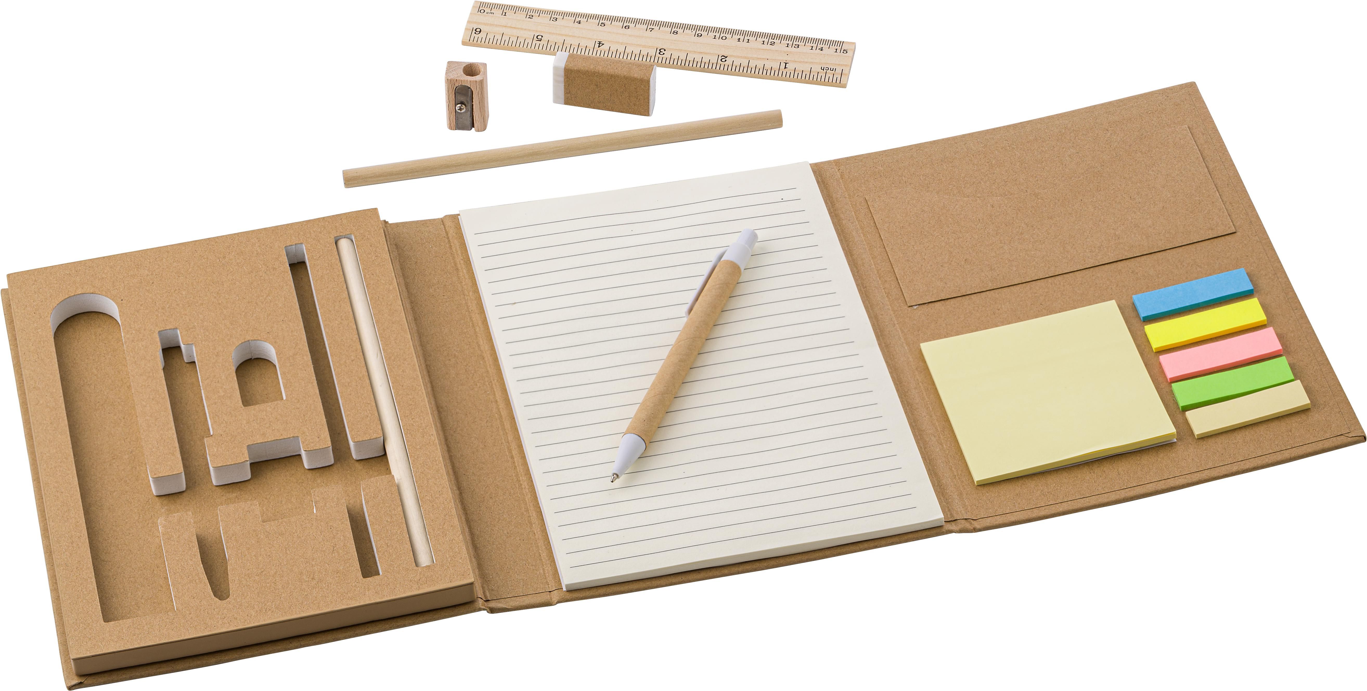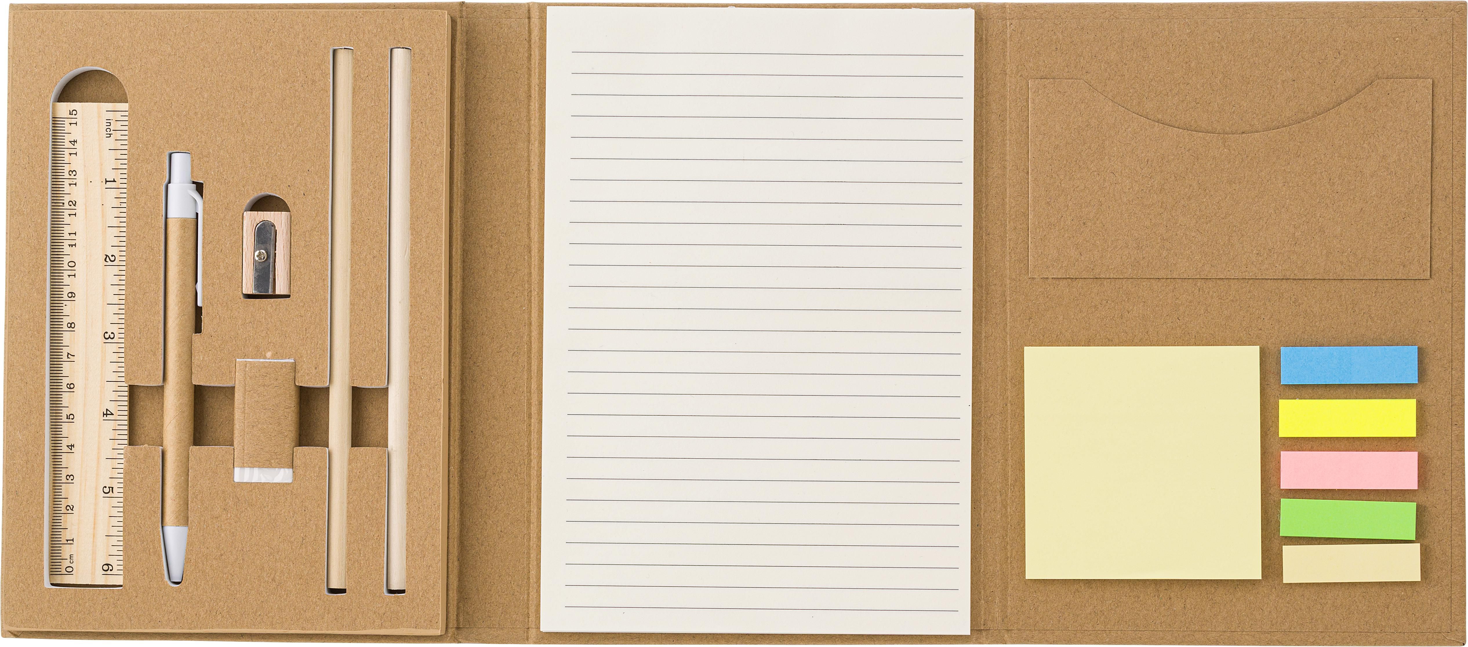 Schreibmappe 'Student' aus Karton mit einem Notizbuch (40 Blätter), ein Einsteckfach, Bambus Lineal (15cm), zwei Stiften aus Karton und Endstück aus Kunststoff.