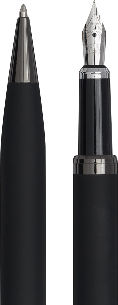 Schreibset BLACK ELEGANCE: bestehend aus Kugelschreiber mit Drehmechanismus und Metall-Großraummine (schwarzschreibend) sowie Füller inklusive Tintenpatrone (blauschreibend) in Gun-Metall-Optik mit gummierter Griffzone, schwarze Geschenkbox mit Schublade und Schmuckkante aus Aluminium